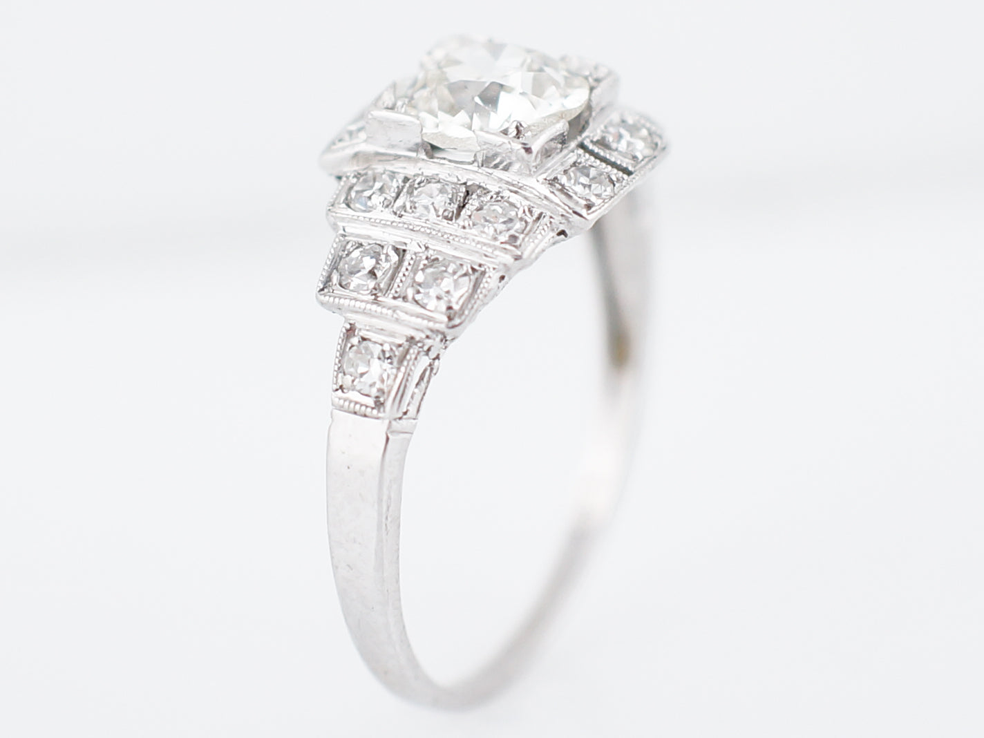 This glittering original Art Deco step-style engagement ring is finely crafted in platinum. A shimmering .90 carat old European cut diamond is set with delicate square-corner prongs, lending to the more geometric look. The center diamond is accented by sixteen (16) single cut diamonds stepping down to the shank of the ring. A truly special original art deco engagement ring!