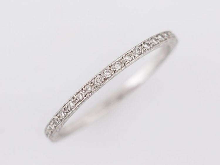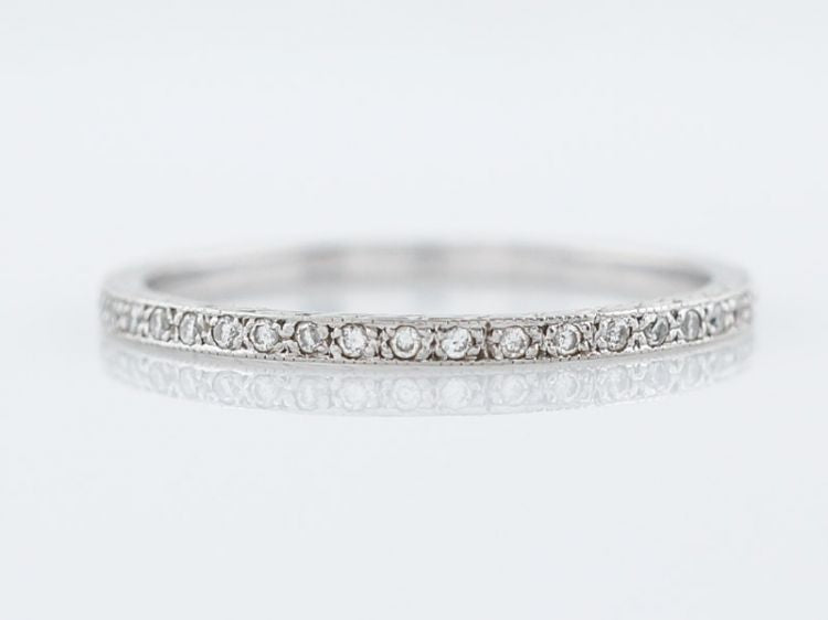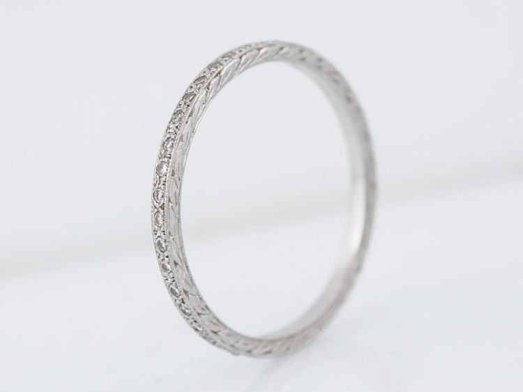 This Modern eternity band is made in the Art Deco style with its characteristic engraving detail. The ring is made in brightly polished platinum and features forty-one (41) round brilliant diamonds weighing .21 carat channel set all the way around. It would be a wonderful compliment to either a Modern or Art Deco engagement ring!