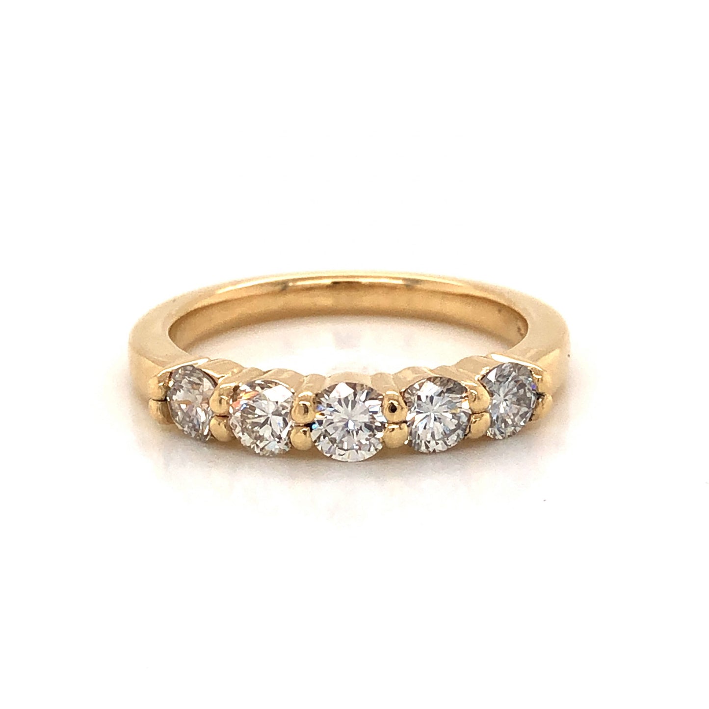 This modern wedding ring features five Round Brilliant cut diamonds in polished 14 karat yellow gold. Five (5) .17 carat white diamonds are set in shared prongs at the front of the band. Cut for maximum brilliance, the diamonds are set on a 3.58 mm wide classic yellow gold band. Comfortable for daily wear, this fabulous wedding band will pair well with most yellow gold engagement rings or can be worn as a right hand stacking ring!