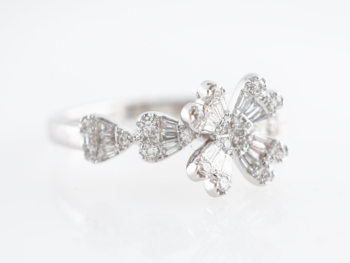 Modern Flower Ring w/ Diamonds in 18k White Gold.  This modern cluster ring features .39 carats of baguette and round brilliant cut diamonds set in 18 karat white gold. A bright bursting design at the center with four petals jumping out and resembling a flower. This ring is a fun and joyful piece for the right hand, alone or in a stack!