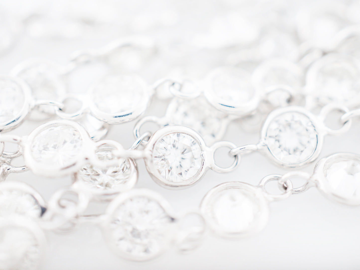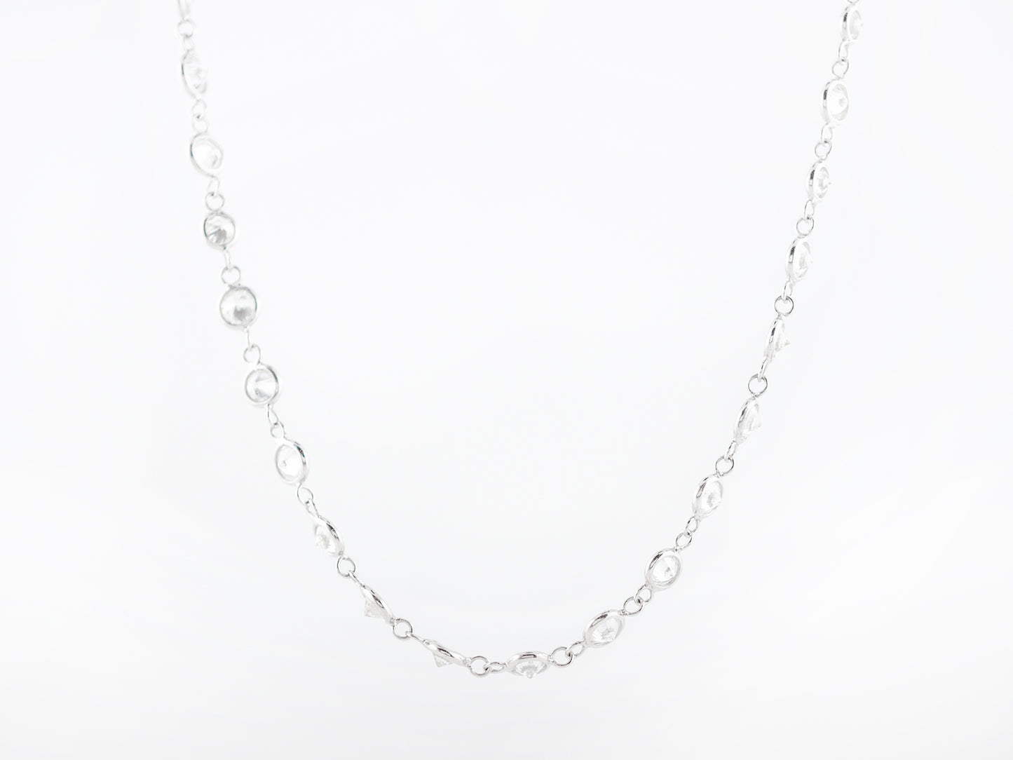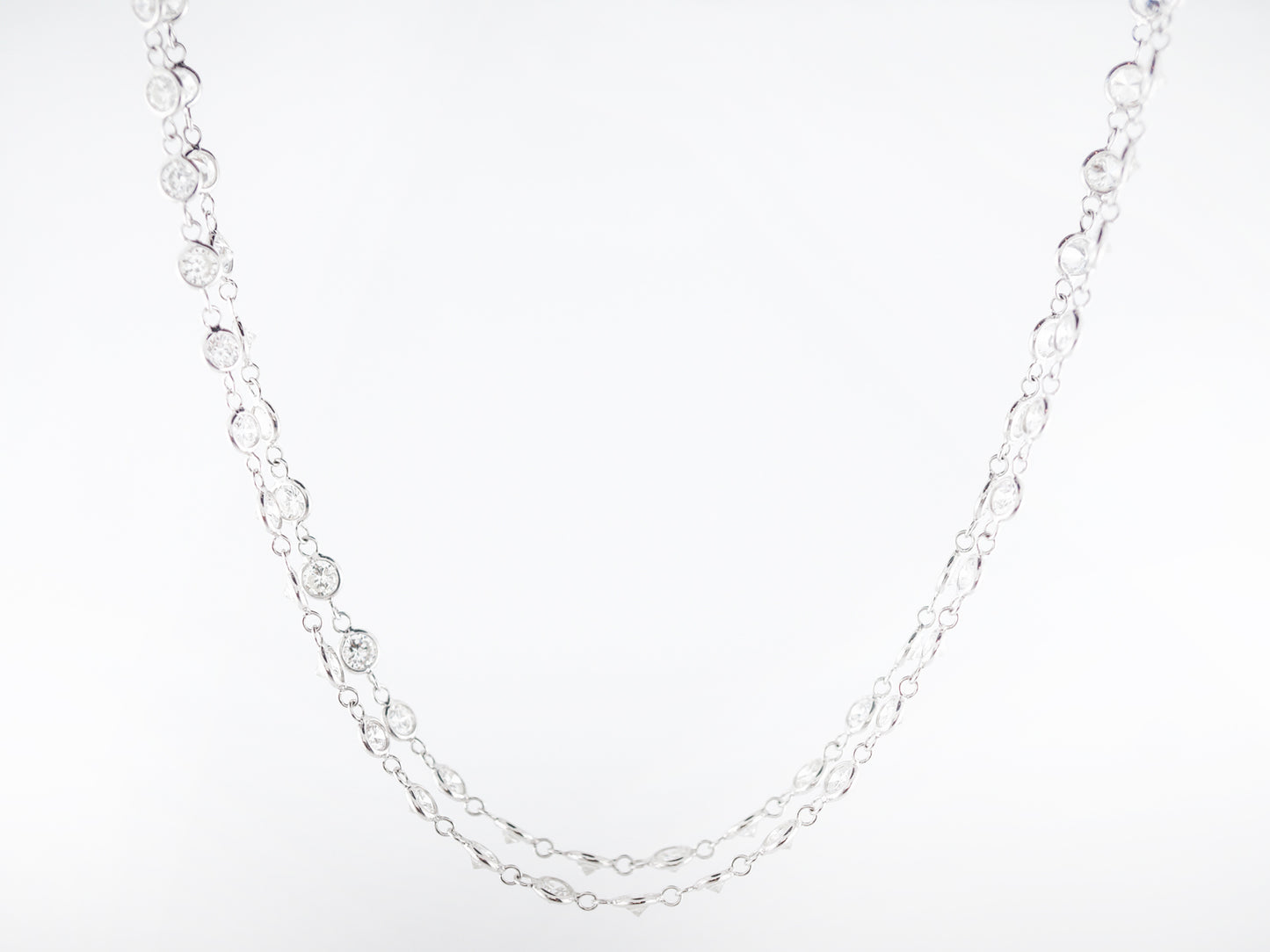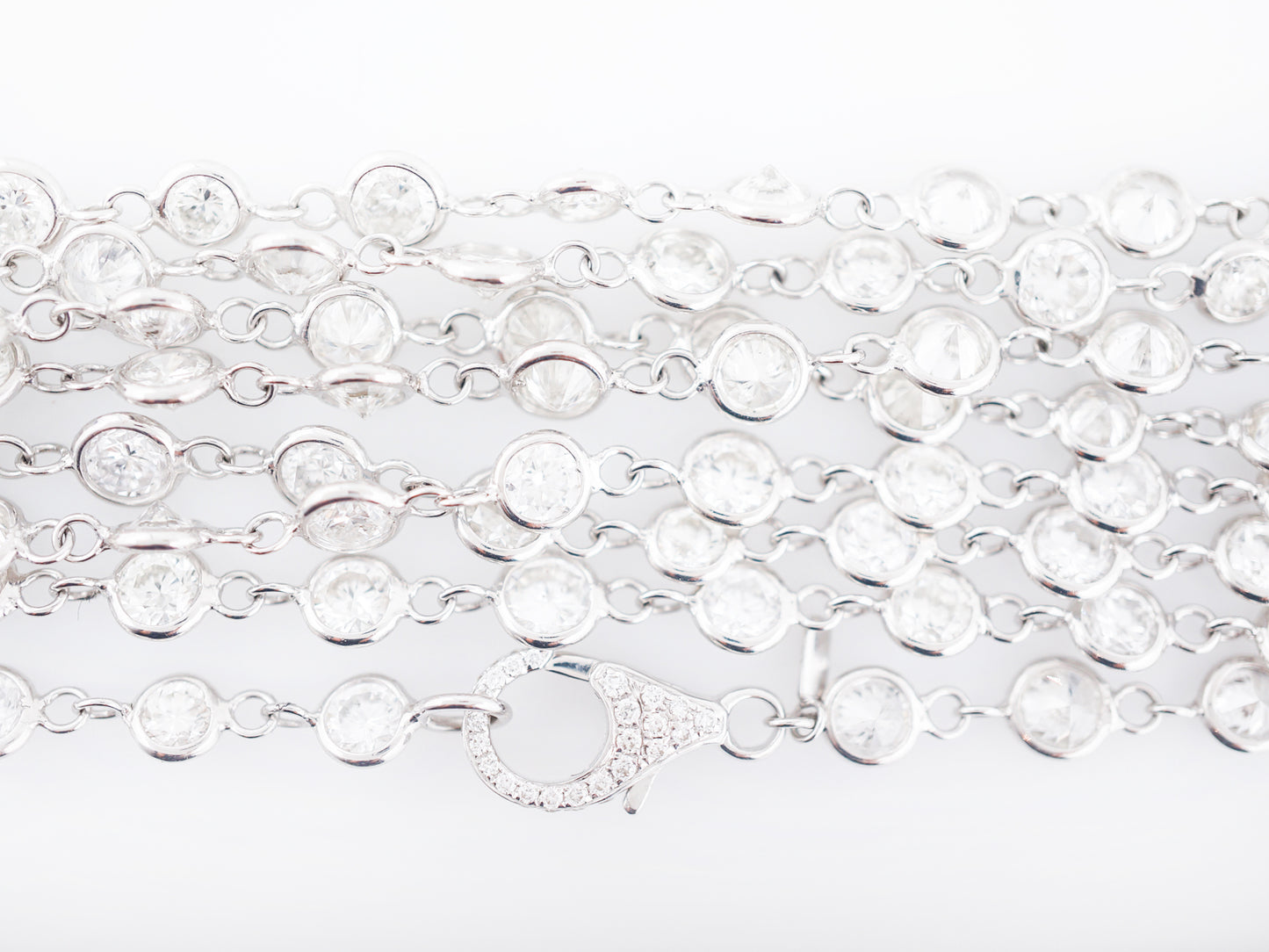 No inch of this Modern 18k white gold necklace was left untouched by diamonds. The necklace is made up of one hundred and twenty (120) bezel set diamonds, one connected to another weighing 20.07 carats total weight. Even the clasp is covered in prong set diamonds, forty-four of them are pave set around the clasp for another .11 carats of diamonds. Measuring 38 inches in length, this necklace can we worn long or wrapped around to layer with itself.