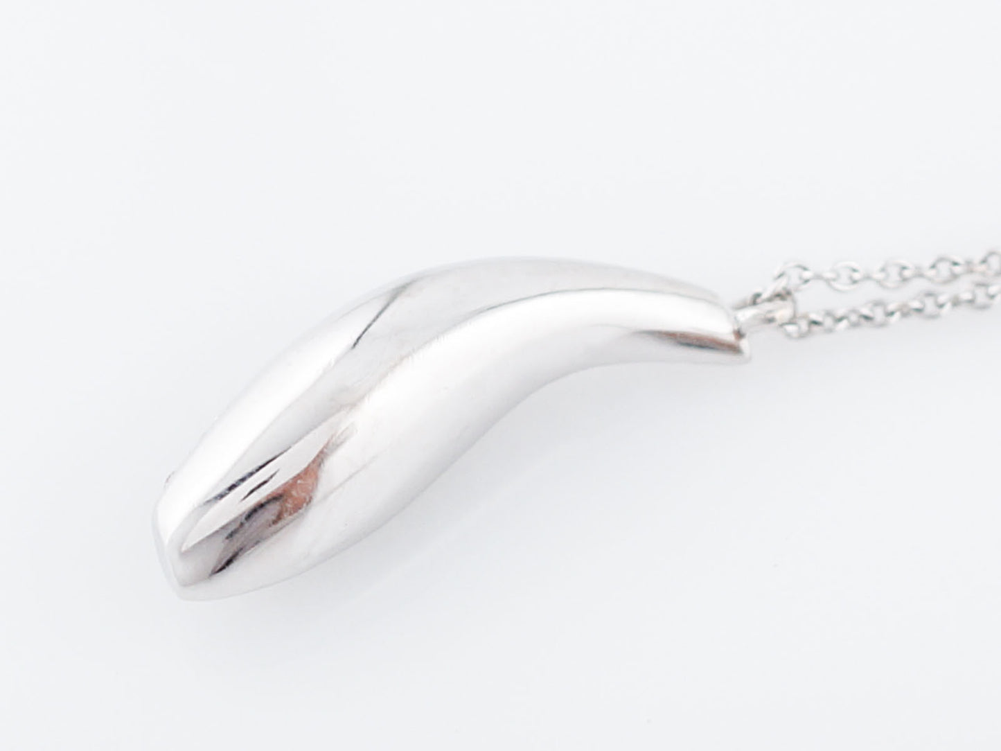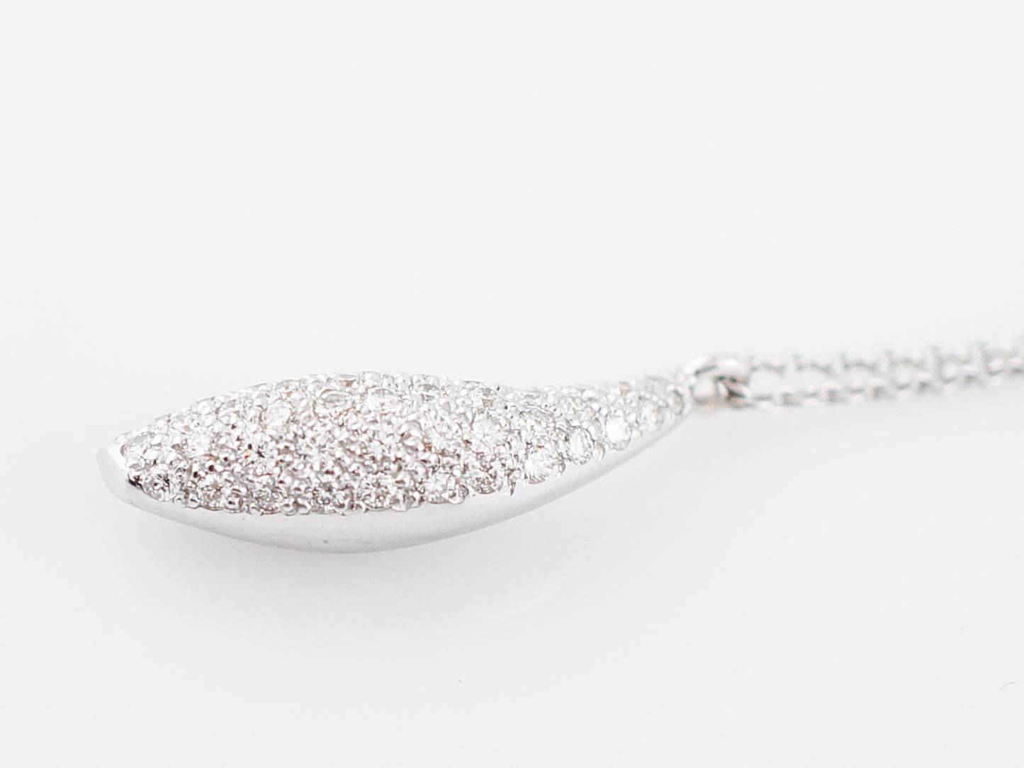 This modern Tiffany Co pendant originally comes from a limited edition collection created with American Architect, Frank Gehry. Known as the Fish pendant, it contains fifty-two (52) round brilliant cut diamonds, weighing .75cttw., which are pave set into the 18 karat gold pendant. Hung on an eighteen (18) inch chain and set in 18K gold, this piece is not something you stumble upon every day.