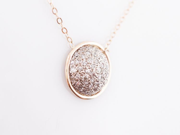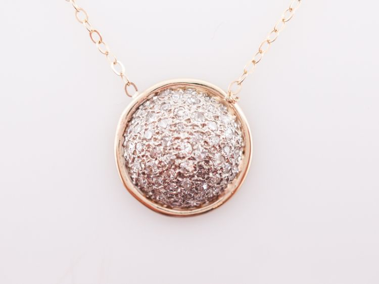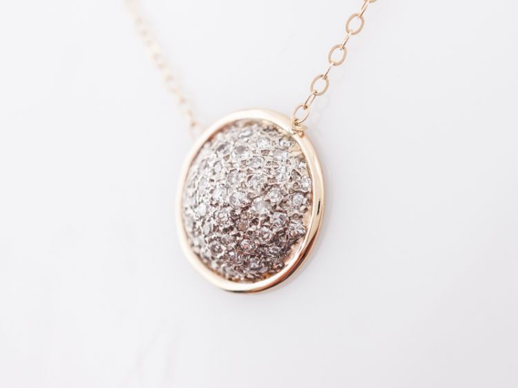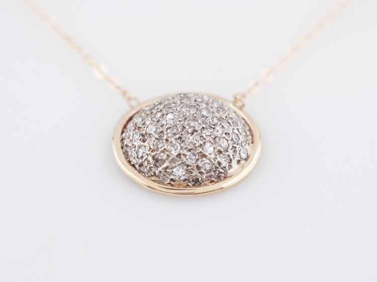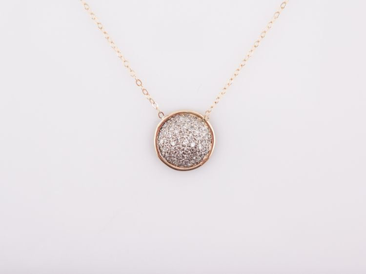 This Modern pave pendant gives great sparkle with rows and rows of single cut diamonds. The .62 carat of diamonds are set into a 14k white gold domed pendant. The outer edge of the pendant and chain are 14k yellow gold giving the necklace contrast and dimension.