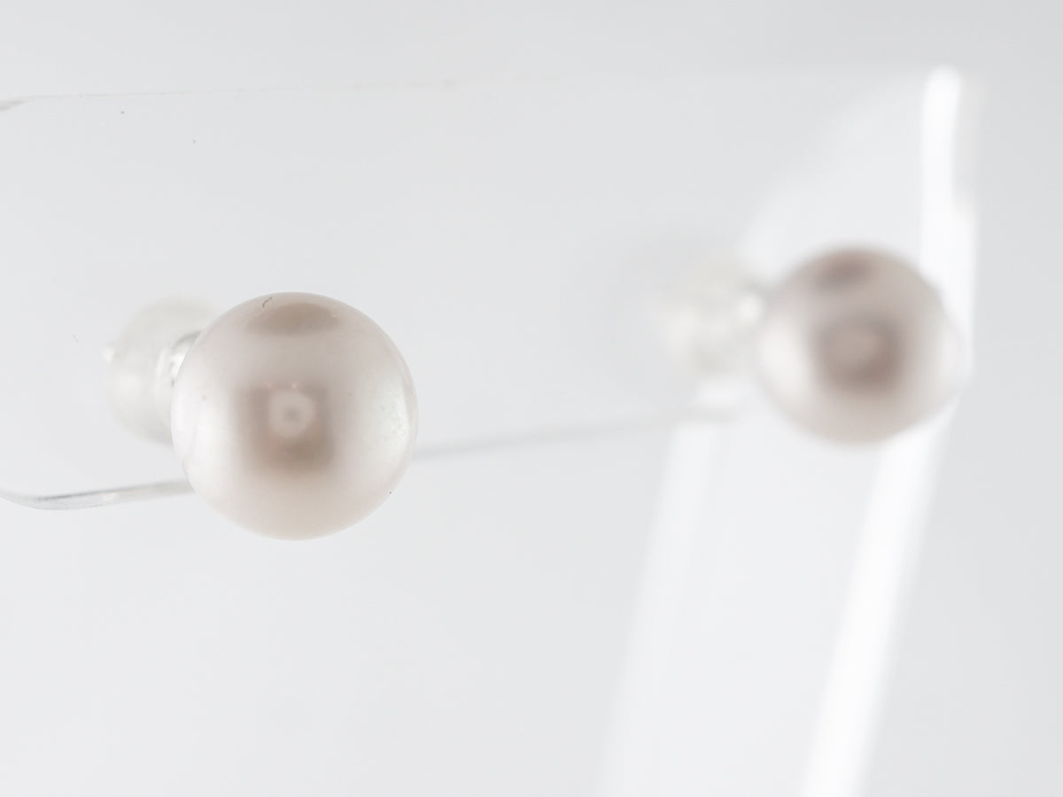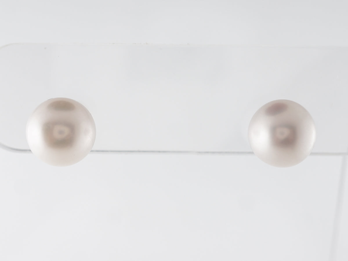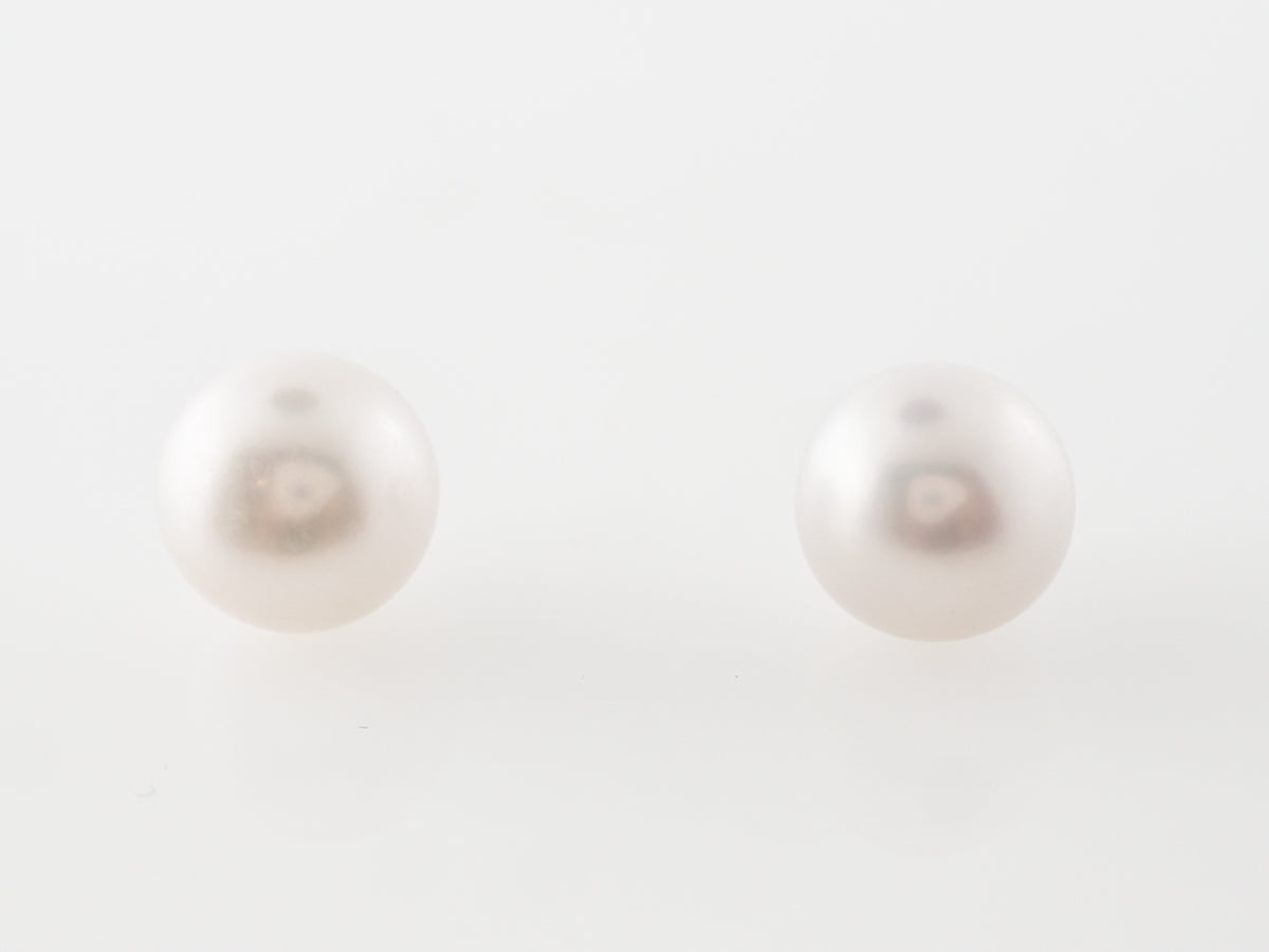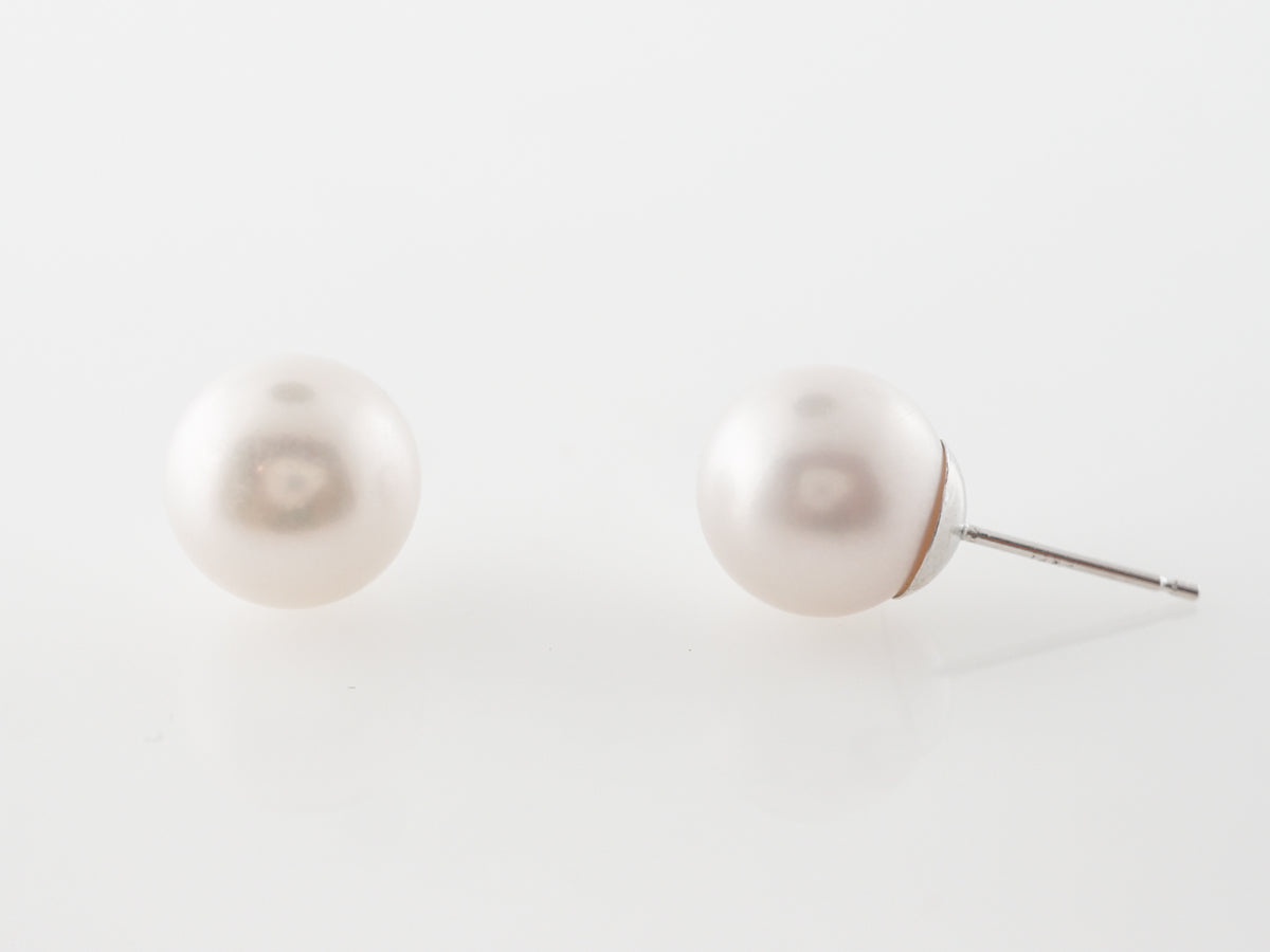 Modern Pearl Earrings in 14k Yellow Gold. These pearl stud earrings in 14 karat white gold are a modern classic. A staple for anyones collection, these will go great with anything from evening wear to your Derby day best!