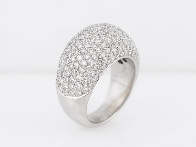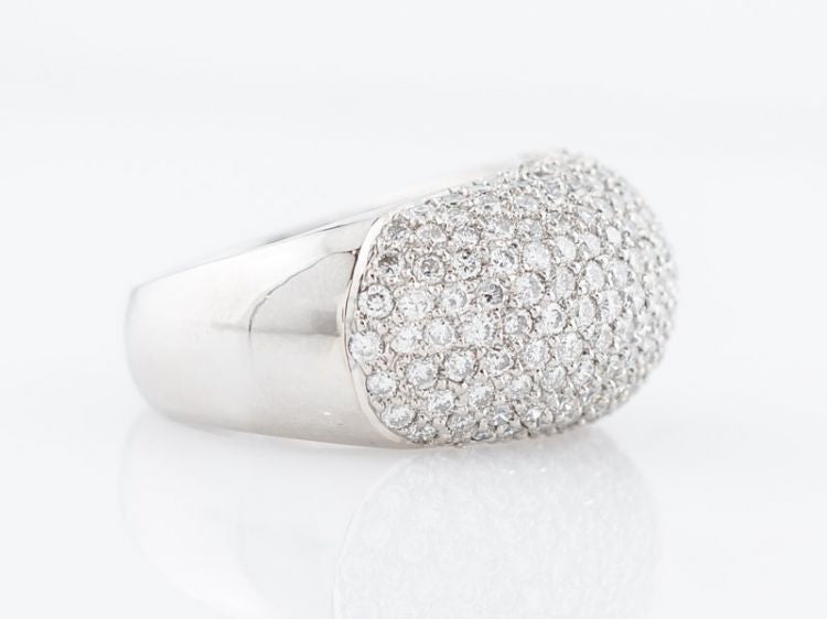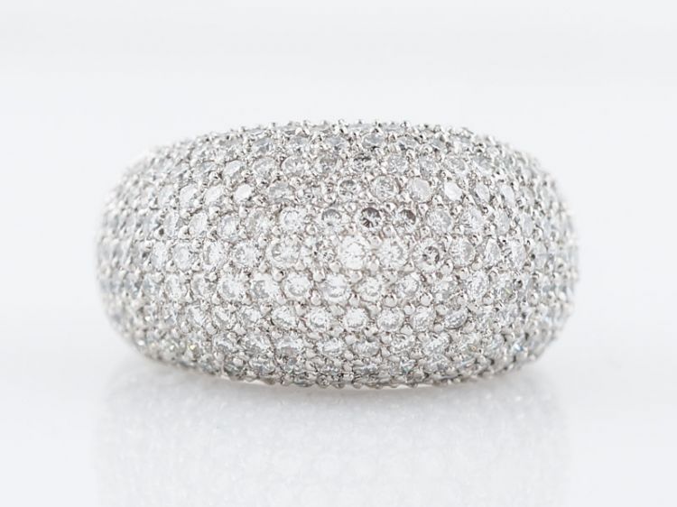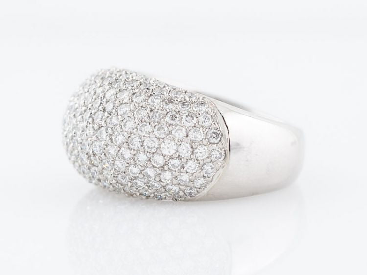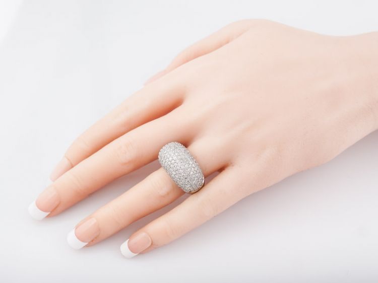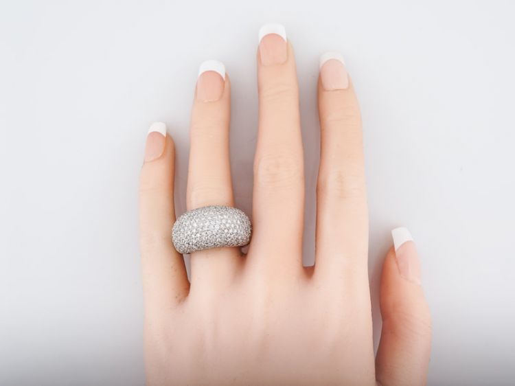 This modern right hand ring features 1.58 carats of round brilliant cut diamonds. Set in 18 karat white gold, this ring has substantial presence from both near and afar. One hundred and fifty-eight (158) diamonds are bead set across the top of the ring, creating a dazzling all diamond appearance. The pave work is seamless and creates an undulating central form which radiates brilliance from every angle.