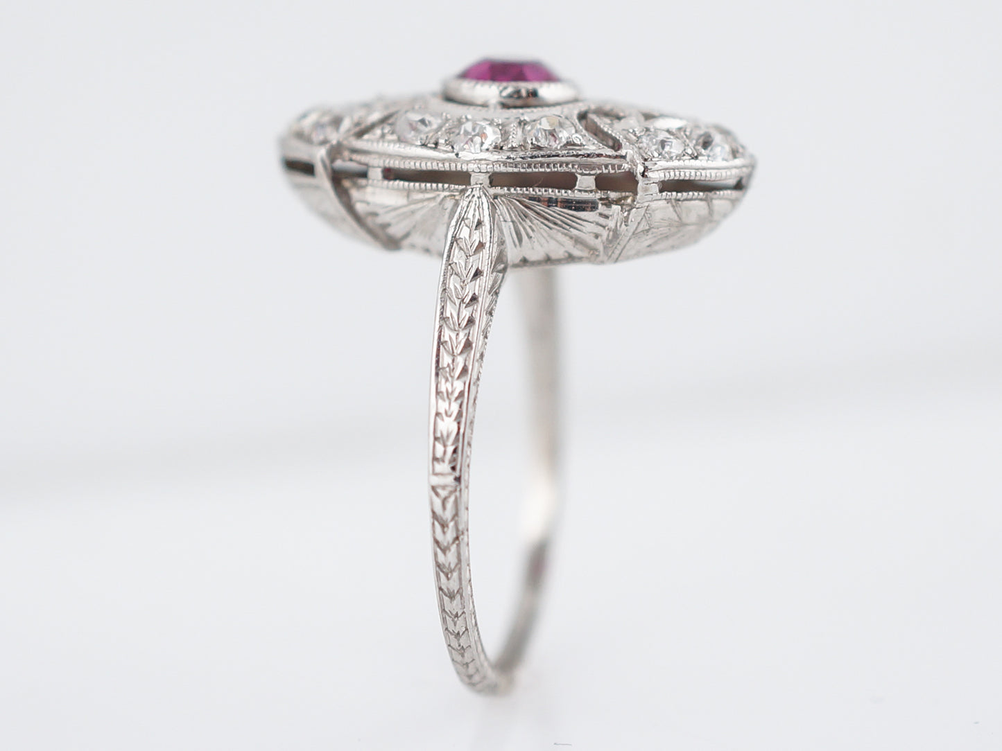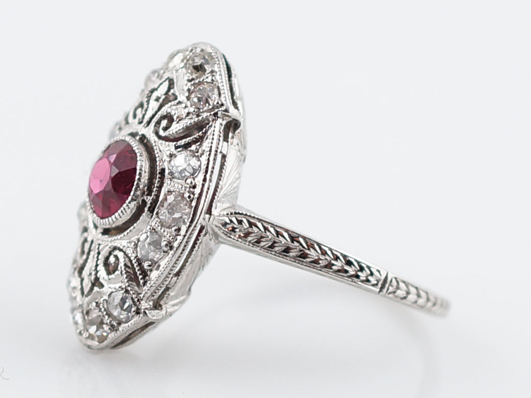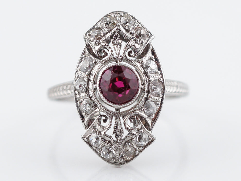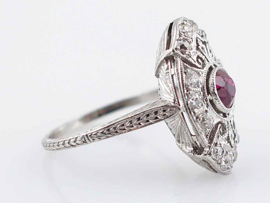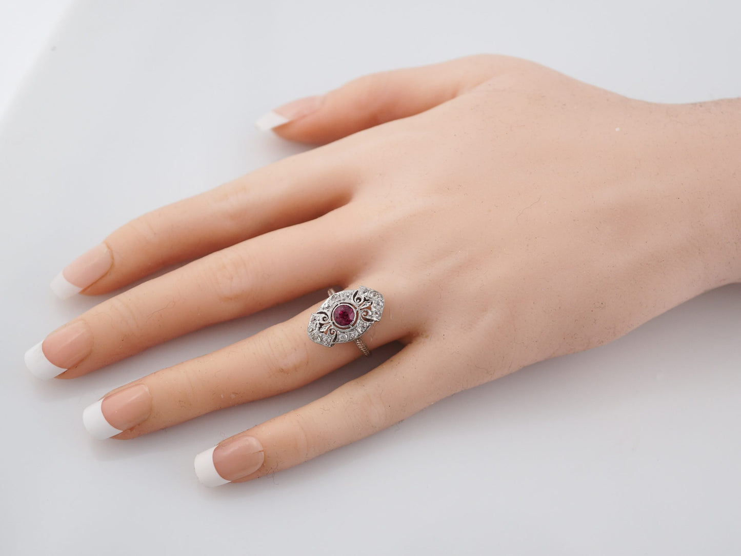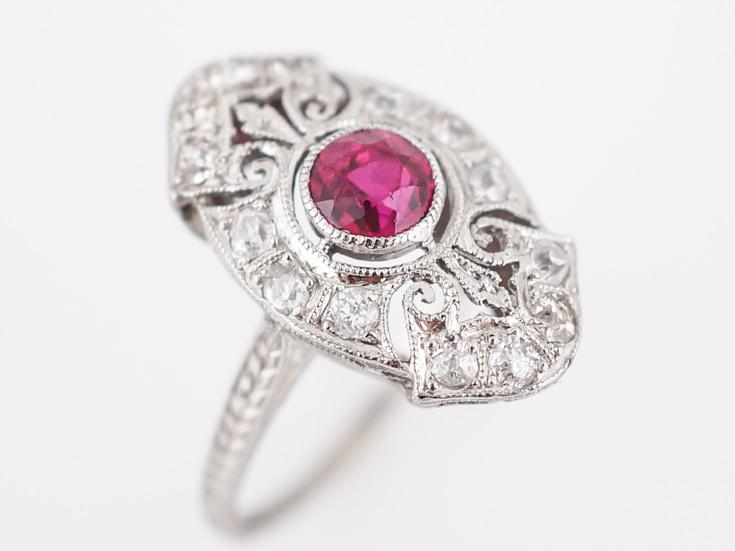 This Modern 18k white and gold ring features a center .63ct bezel set round cut ruby accented with fourteen (14) old european cut diamonds. Done in a classic dinner ring style, the ruby adds a exciting pop of color. Additionally, the delicate filigree of the rings undercarriage only adds to its beauty.
