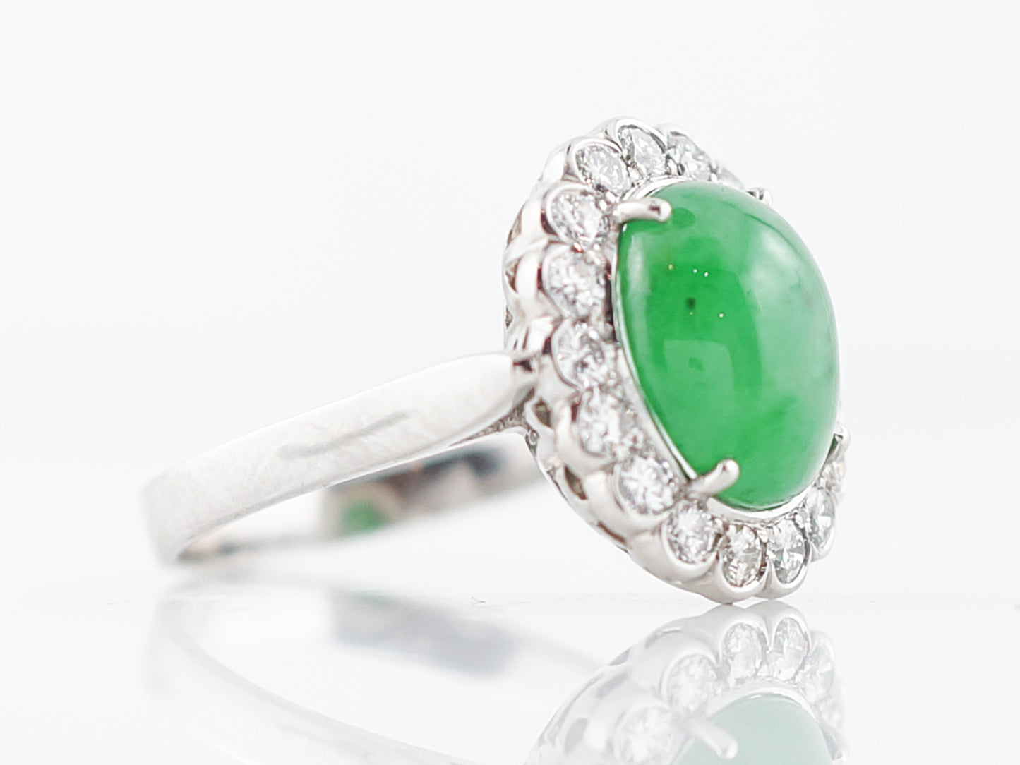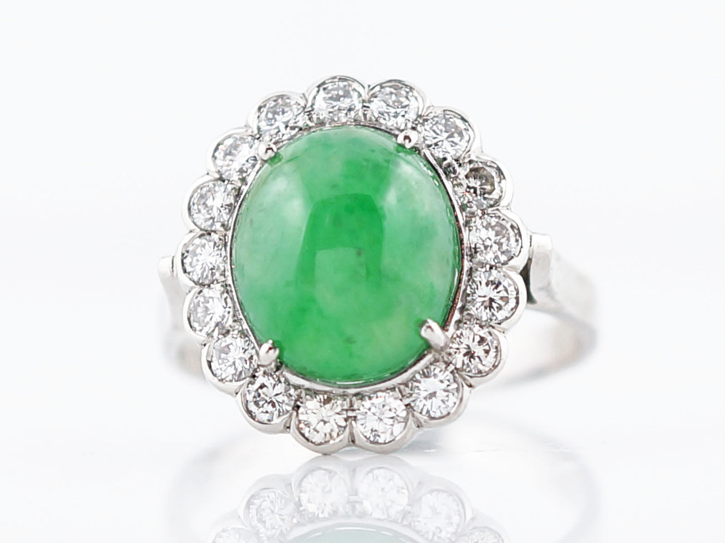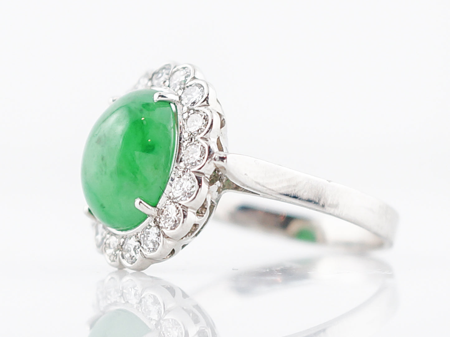 The philosopher Confucius believed that Jades brightness represented heaven, and anyone who receives this ring might just feel like theyre in heaven! Certified by the Gemological Institute of America (GIA) this 3.95 carat cabochon cut Jade is set in platinum and surrounded by a halo of seventeen (17) round brilliant cut diamonds weighing .54 cttw. The shank of the ring is simple and tapers inward just slightly allowing the Jade to be the star of this piece.