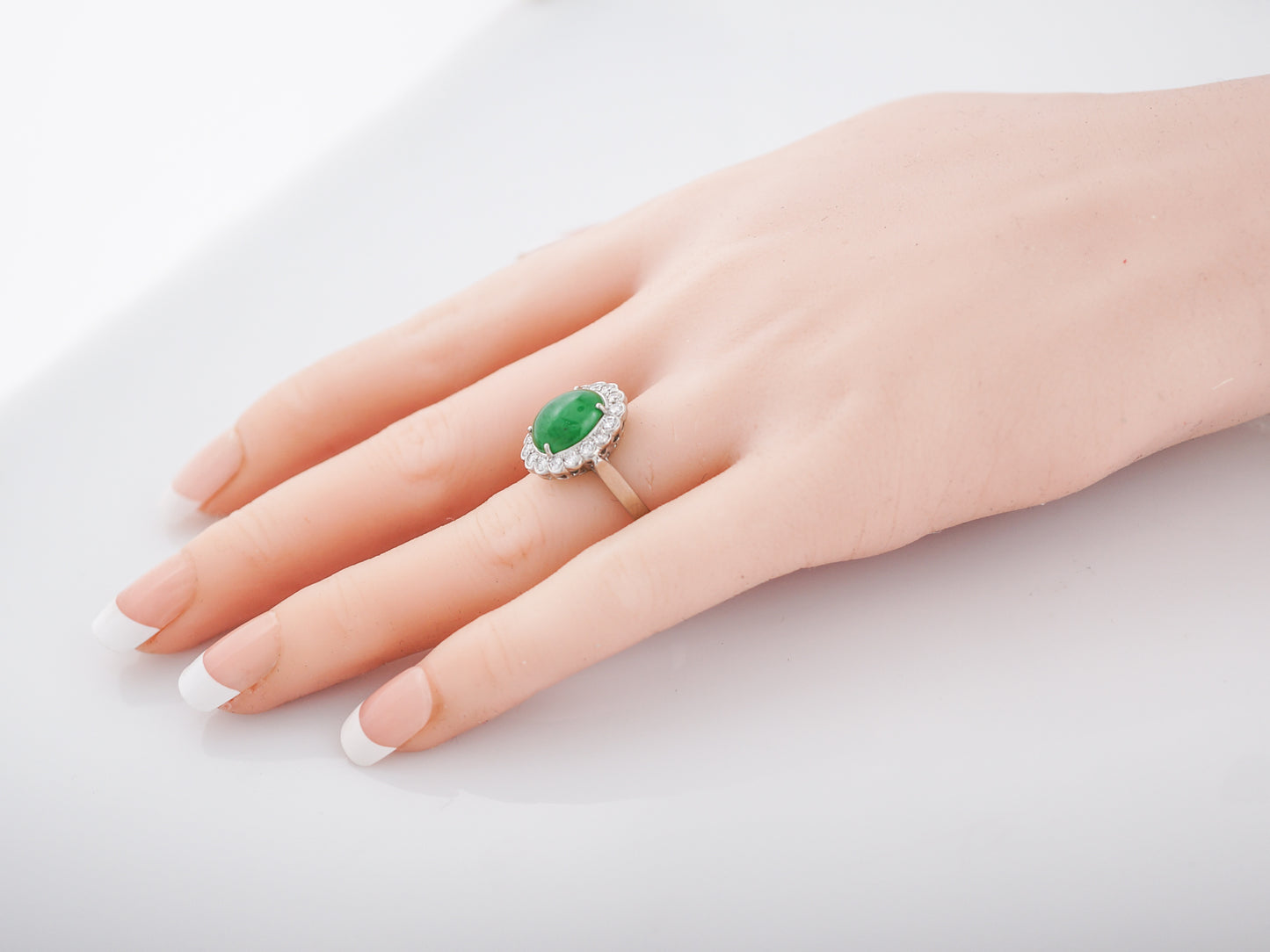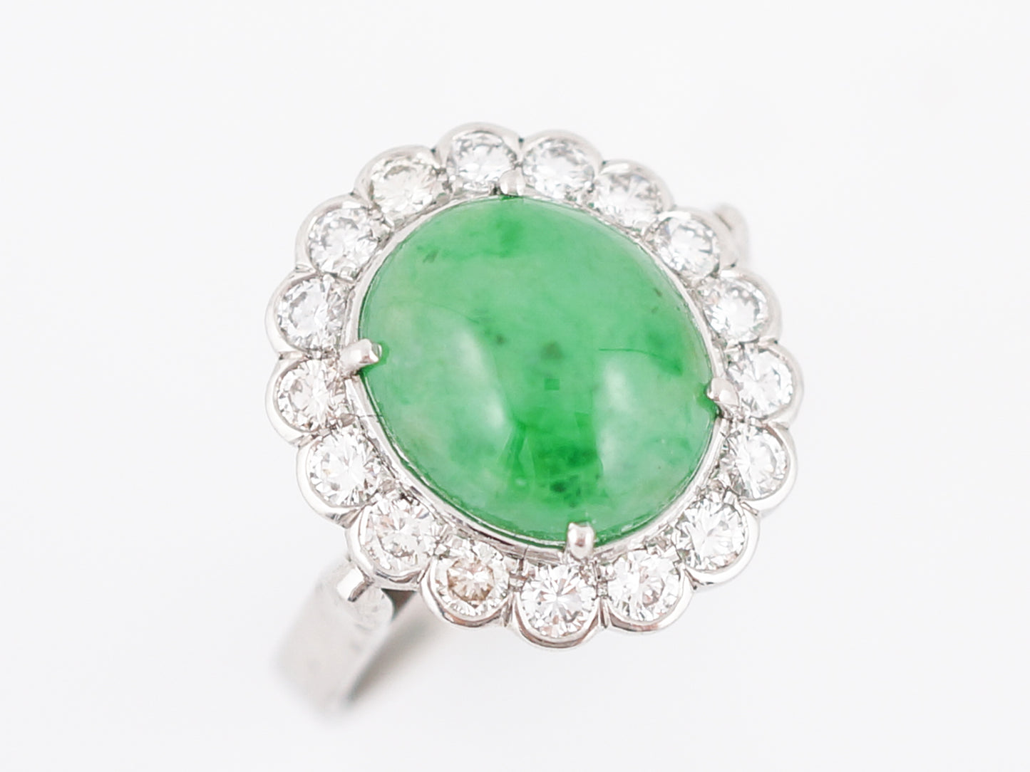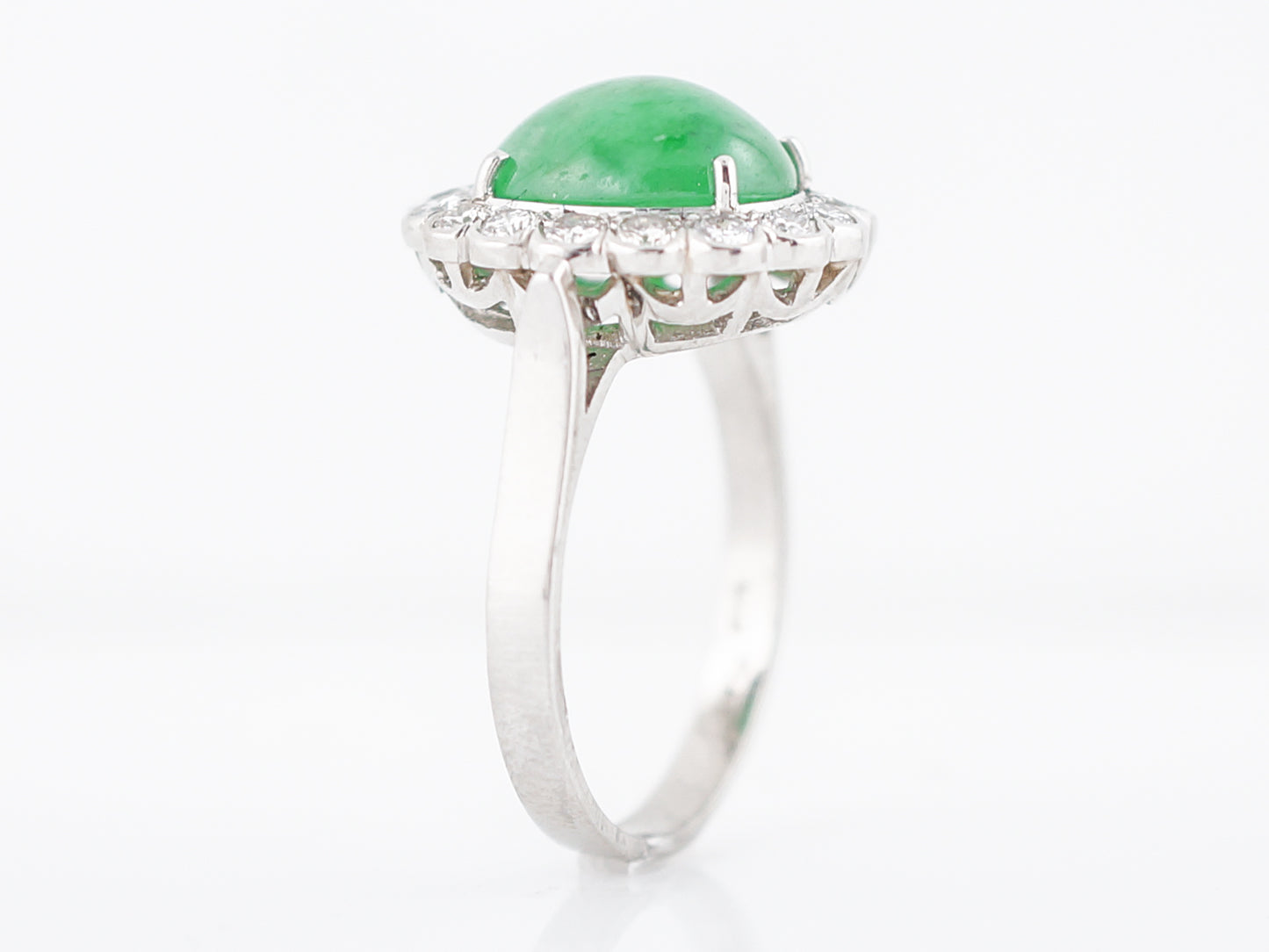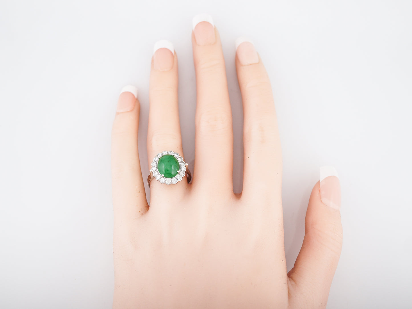 The philosopher Confucius believed that Jades brightness represented heaven, and anyone who receives this ring might just feel like theyre in heaven! Certified by the Gemological Institute of America (GIA) this 3.95 carat cabochon cut Jade is set in platinum and surrounded by a halo of seventeen (17) round brilliant cut diamonds weighing .54 cttw. The shank of the ring is simple and tapers inward just slightly allowing the Jade to be the star of this piece.