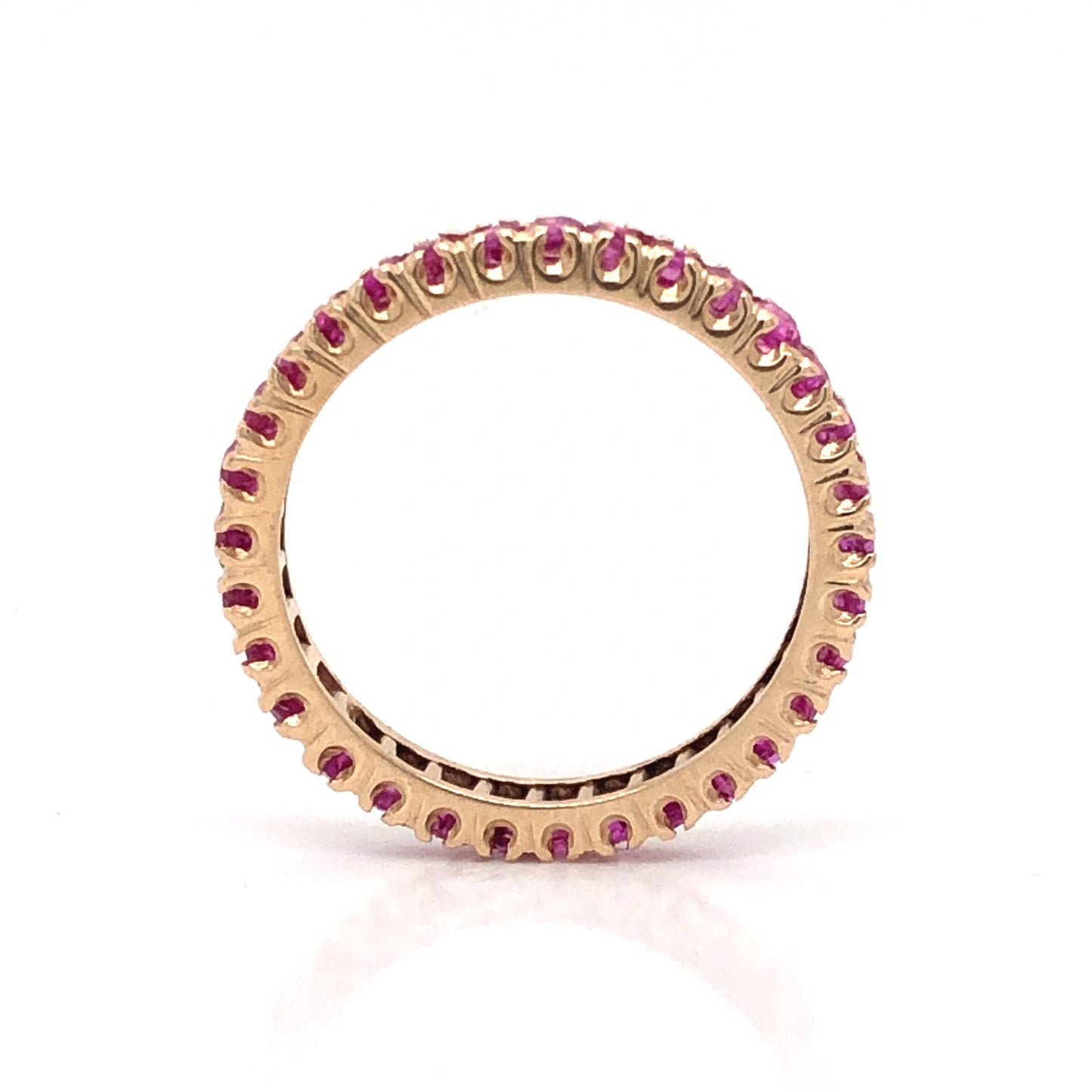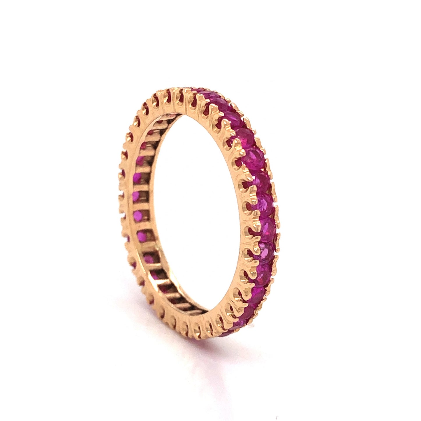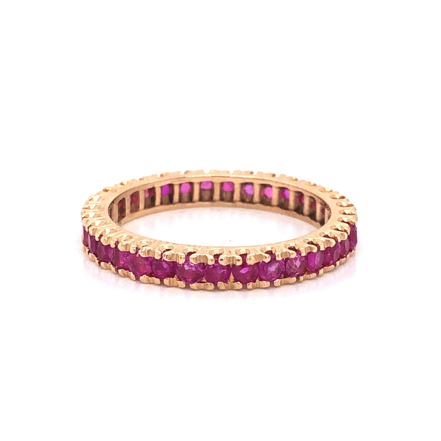 For a special, one of a kind gemstone wedding ring, this modern eternity band features 1.28 carats of round cut rubies in 14 karat yellow gold. Thirty two (32) .04 carat rubies with a red-magenta hue are set in shared V prongs around the entire ring. Elegant and practical, this stackable band will bring a depth of color and shine to an engagement ring or can be worn in a right hand stack.