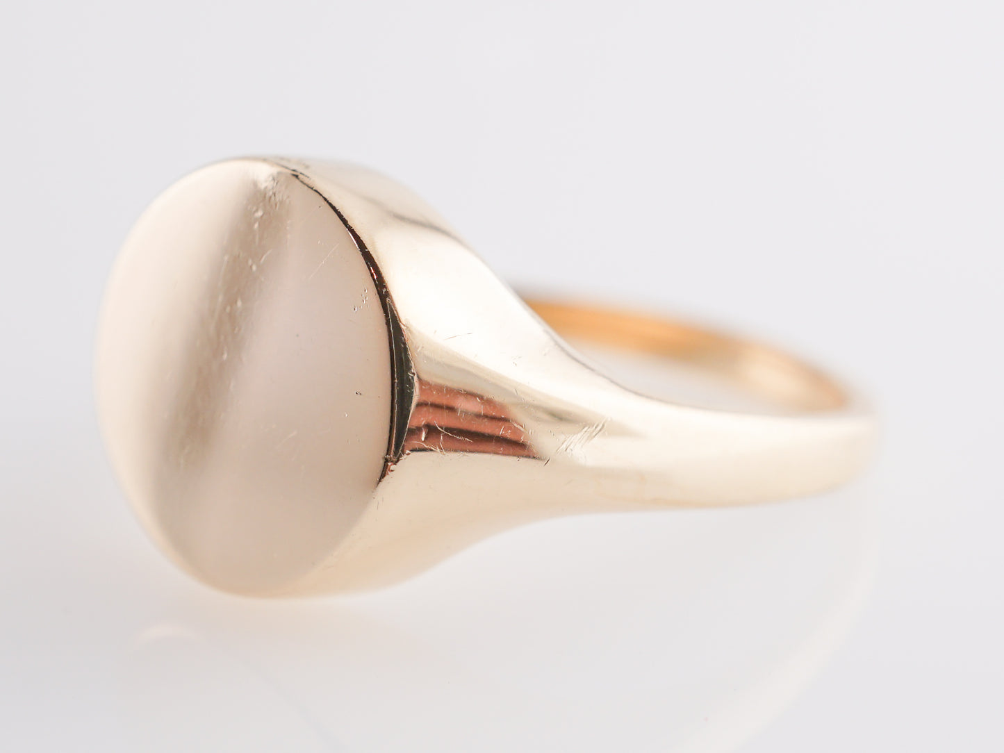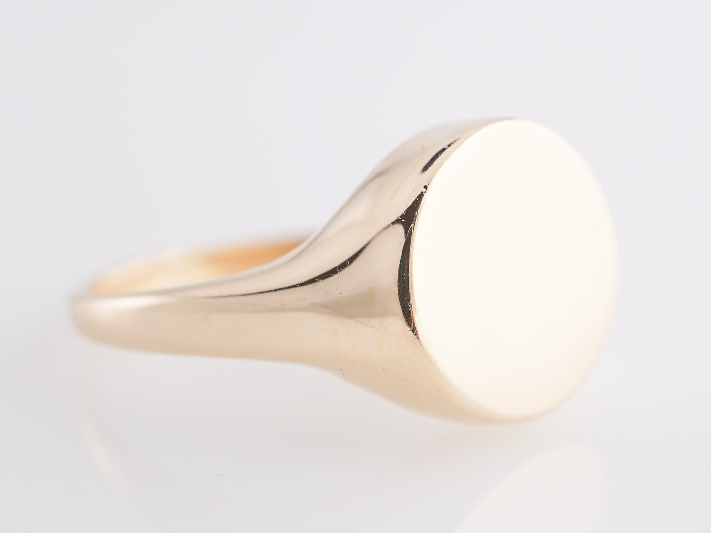 Modern Signet Ring in 14k Yellow Gold. This classic signet ring gold features a perfectly polished band and circular setting in 14k yellow gold. Traditionally, signet rings were a way to incorporate your personal touch, family emblem, or initials on a decorative form that could be worn on a right hand. This ring embodies beauty, strength, and craftsmanship all in one. This dazzling ring would make a lovely gift to show appreciation for the one you love. Created in the Modern era, this ring reaches 3.12 mm above the finger and weighs a total of 5.7 grams.
