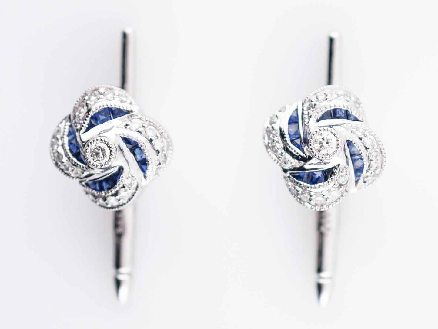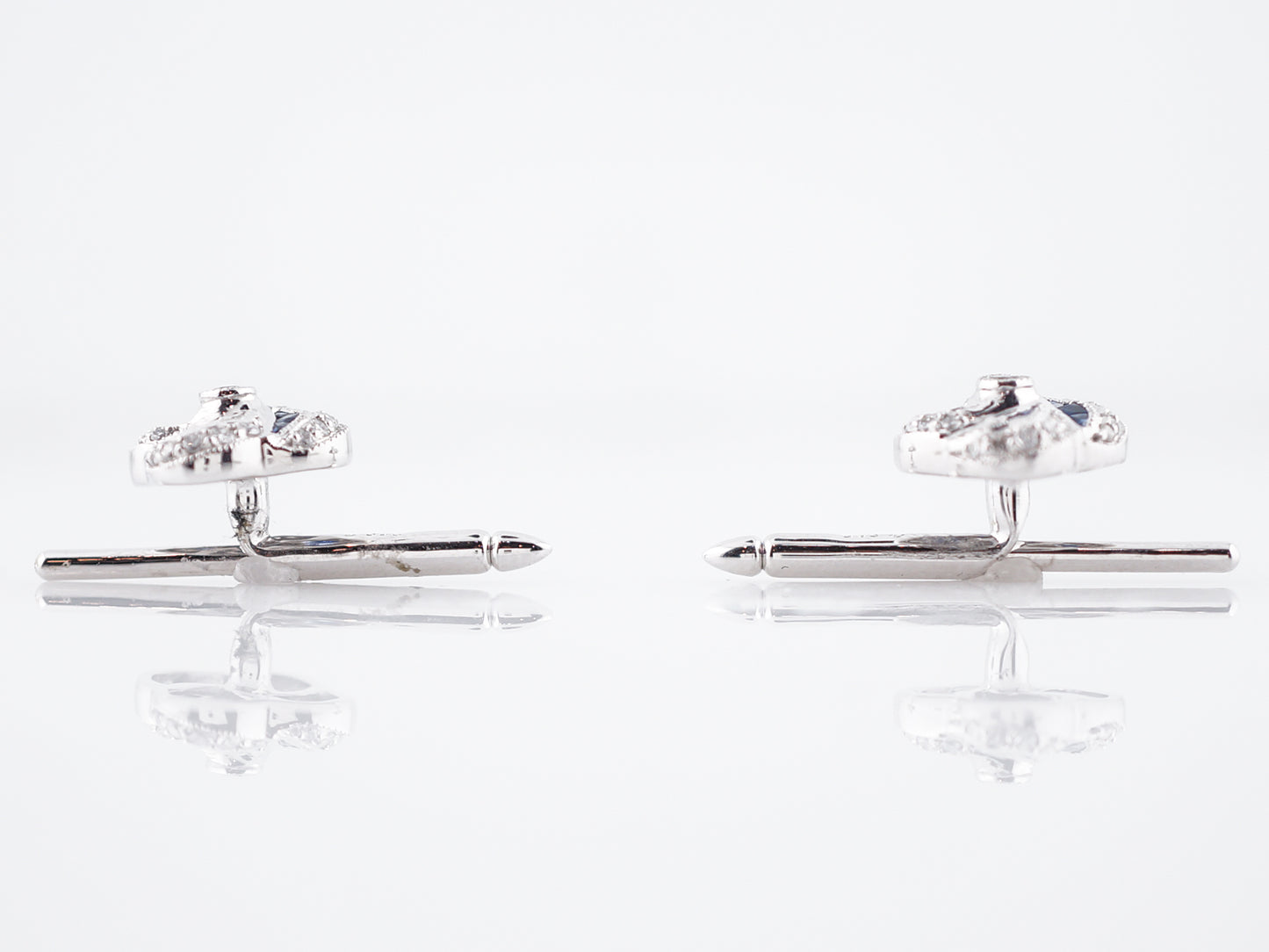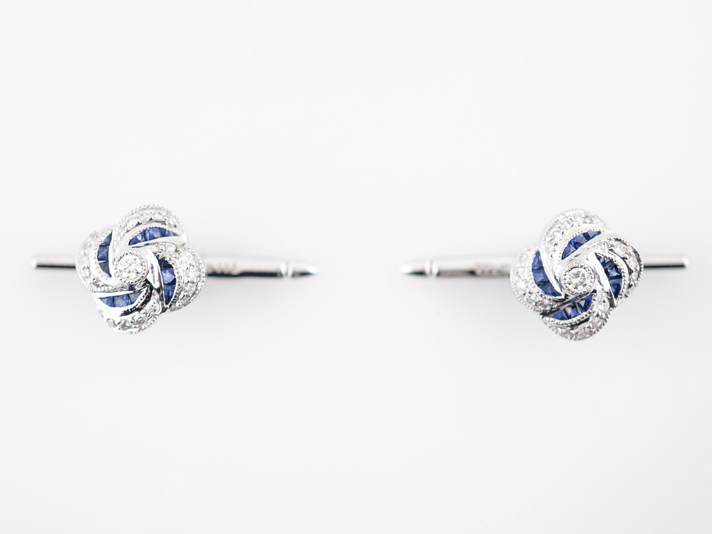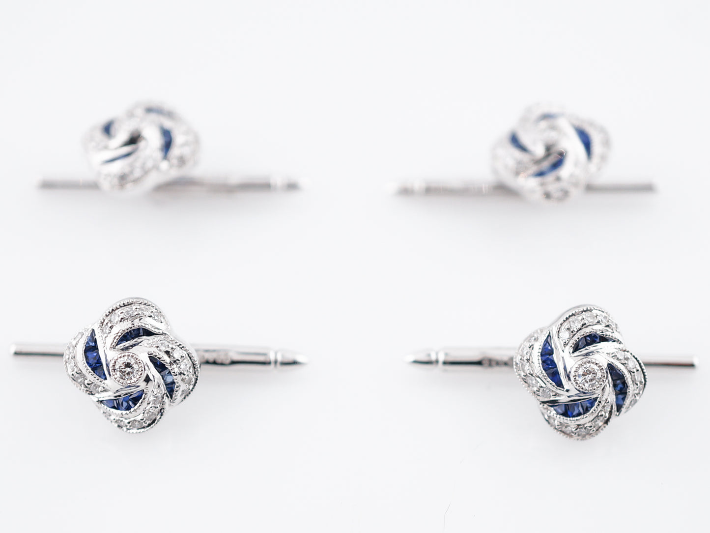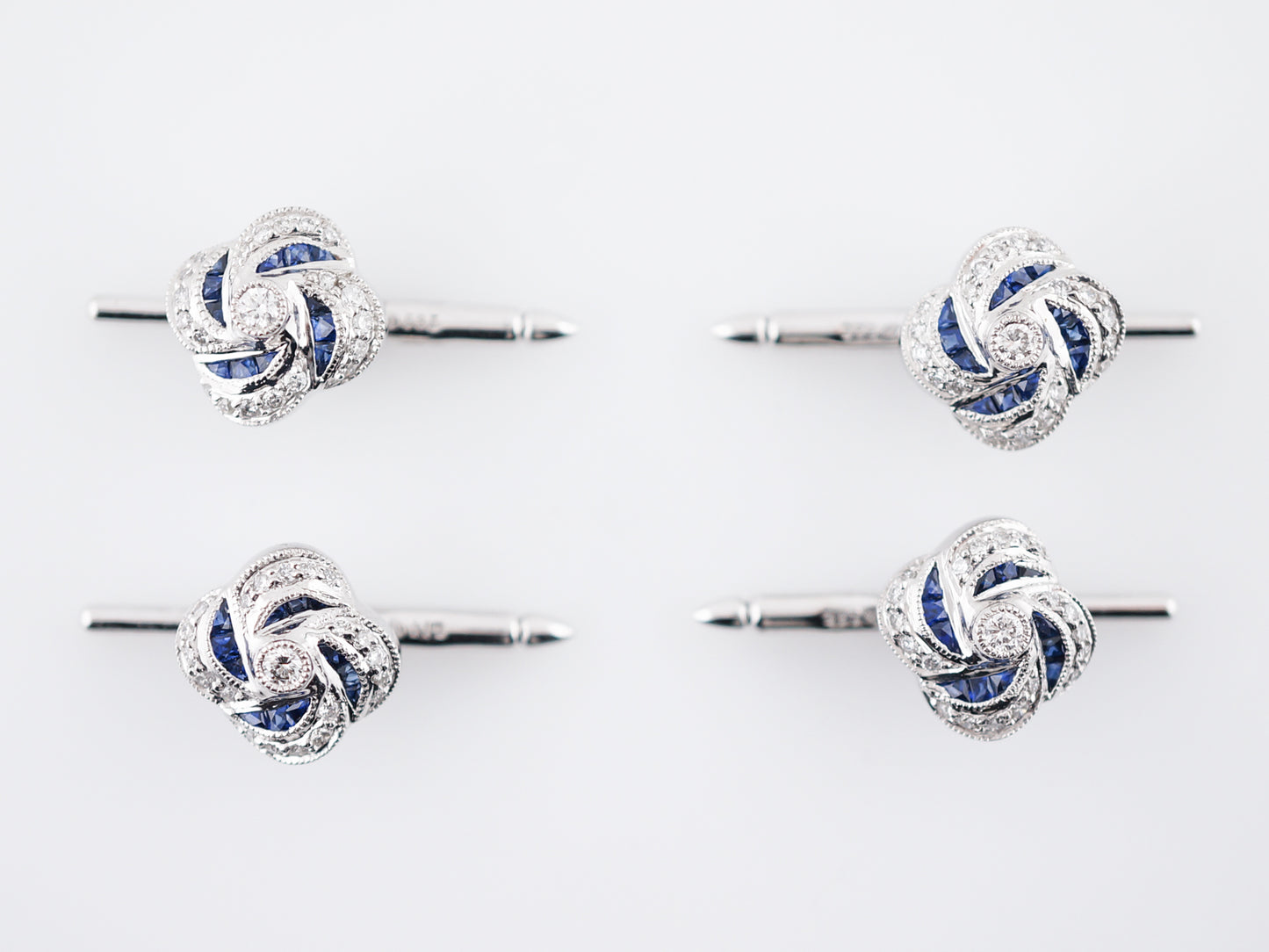 This set of four (4) modern era shirt studs are a great way to dress up a simple tux or suit. Cast in platinum, the swirl design of these studs has 1.20 total carats of blue sapphires and .78 total carats of brilliantly sparkling diamonds. A bit of milgrain detailing on these gives them a slight vintage feel and they slide easily into button holes, laying flat like a button.