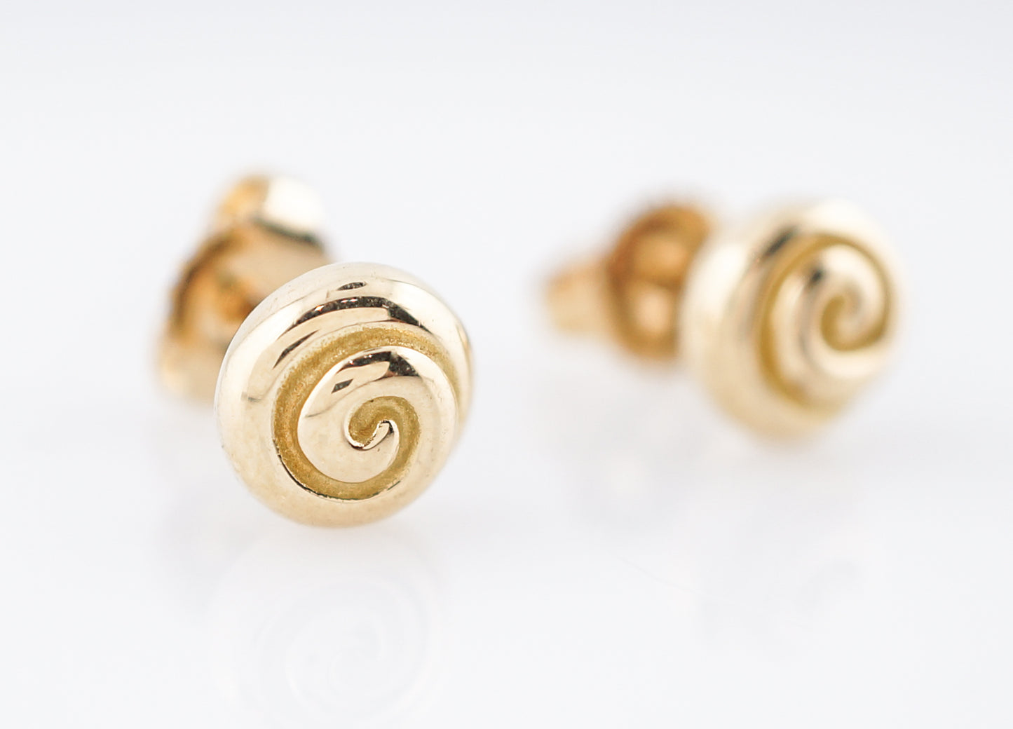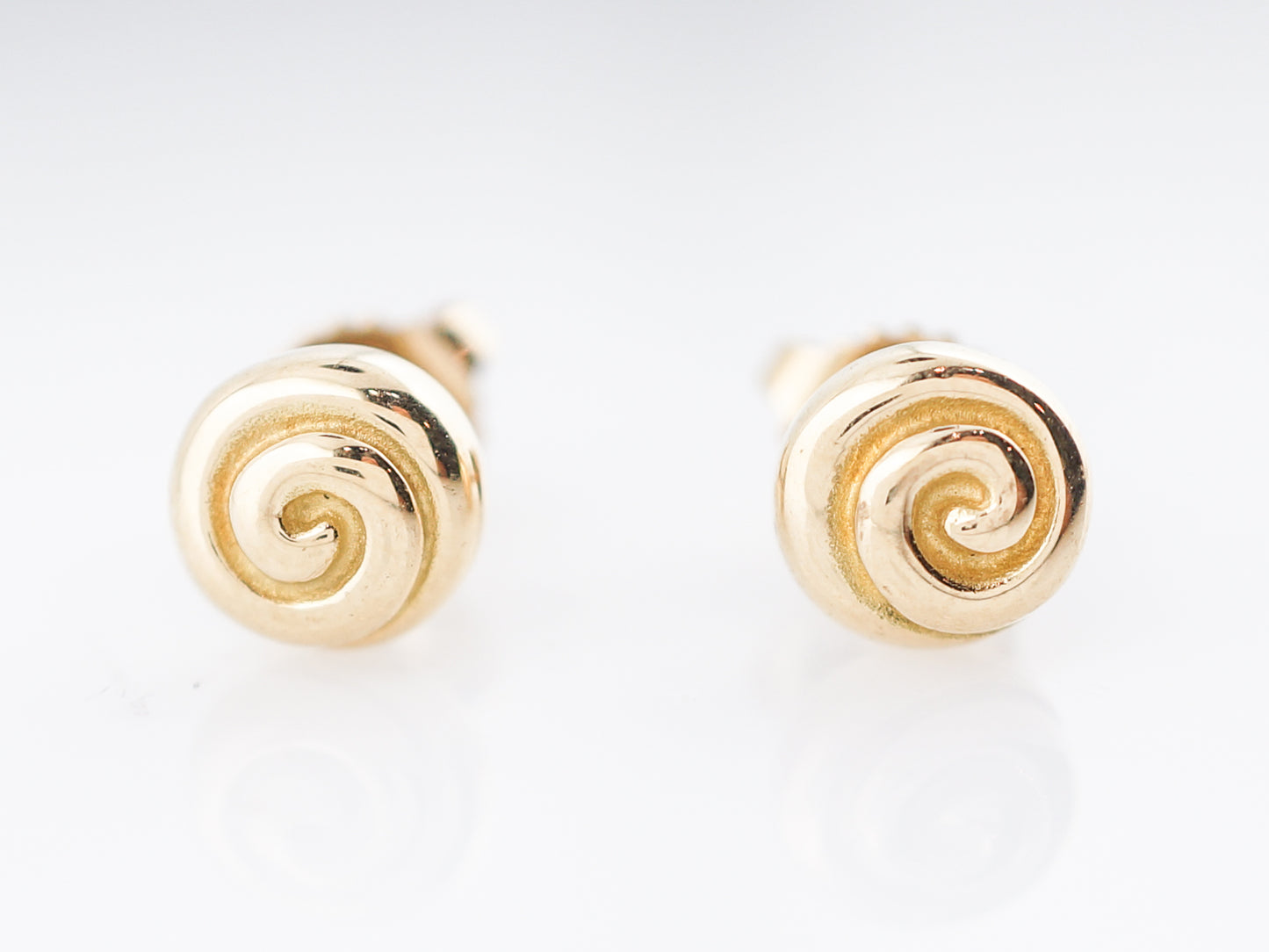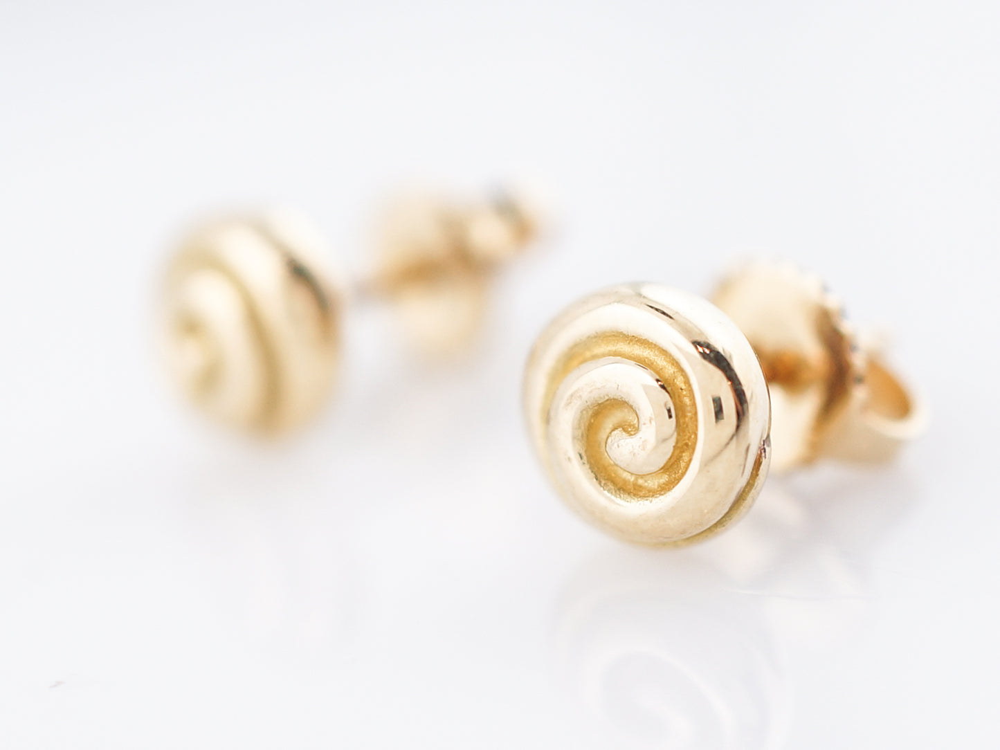 These sweet earrings were made by Tiffany Co. They are post earrings that are made with 18k yellow gold. The spiral pattern in the metal is an ancient design that symbolizes the interconnectedness of all things. These lovely Modern earrings are petite and modest enough to be worn everyday for any occasion.