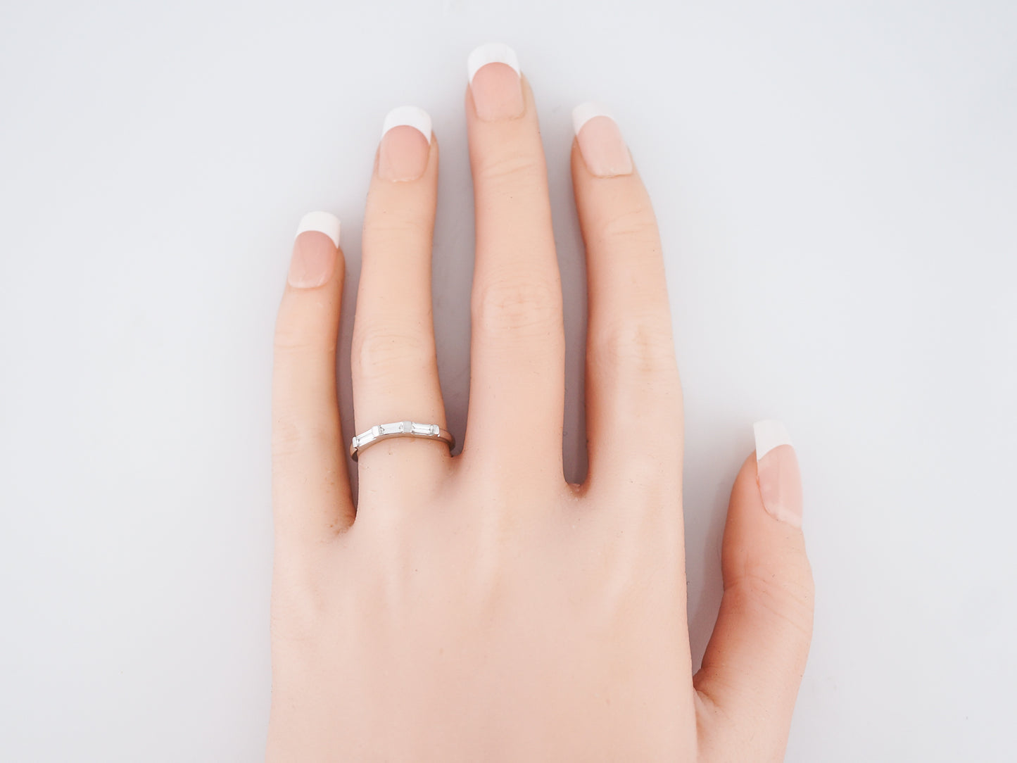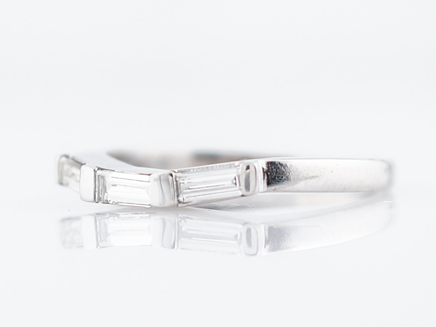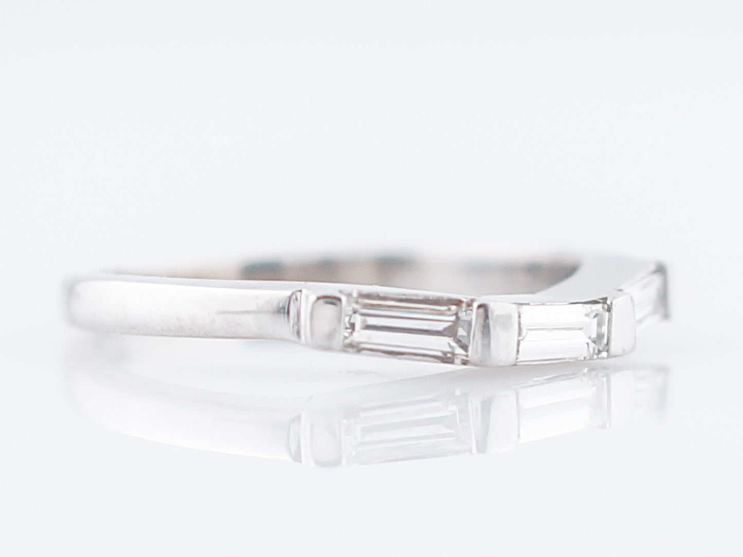 This Modern Era wedding band has three (3) straight baguettes weighing 0.21 carats total weight. The diamonds are bar set and form a slight curve which can fit quite nicely against an engagement ring that has a profile that is not perfectly straight. Cast in Platinum, this ring has a beautiful high polish and the simplicity of it makes it a wonderful pairing to a vintage or modern engagement ring.