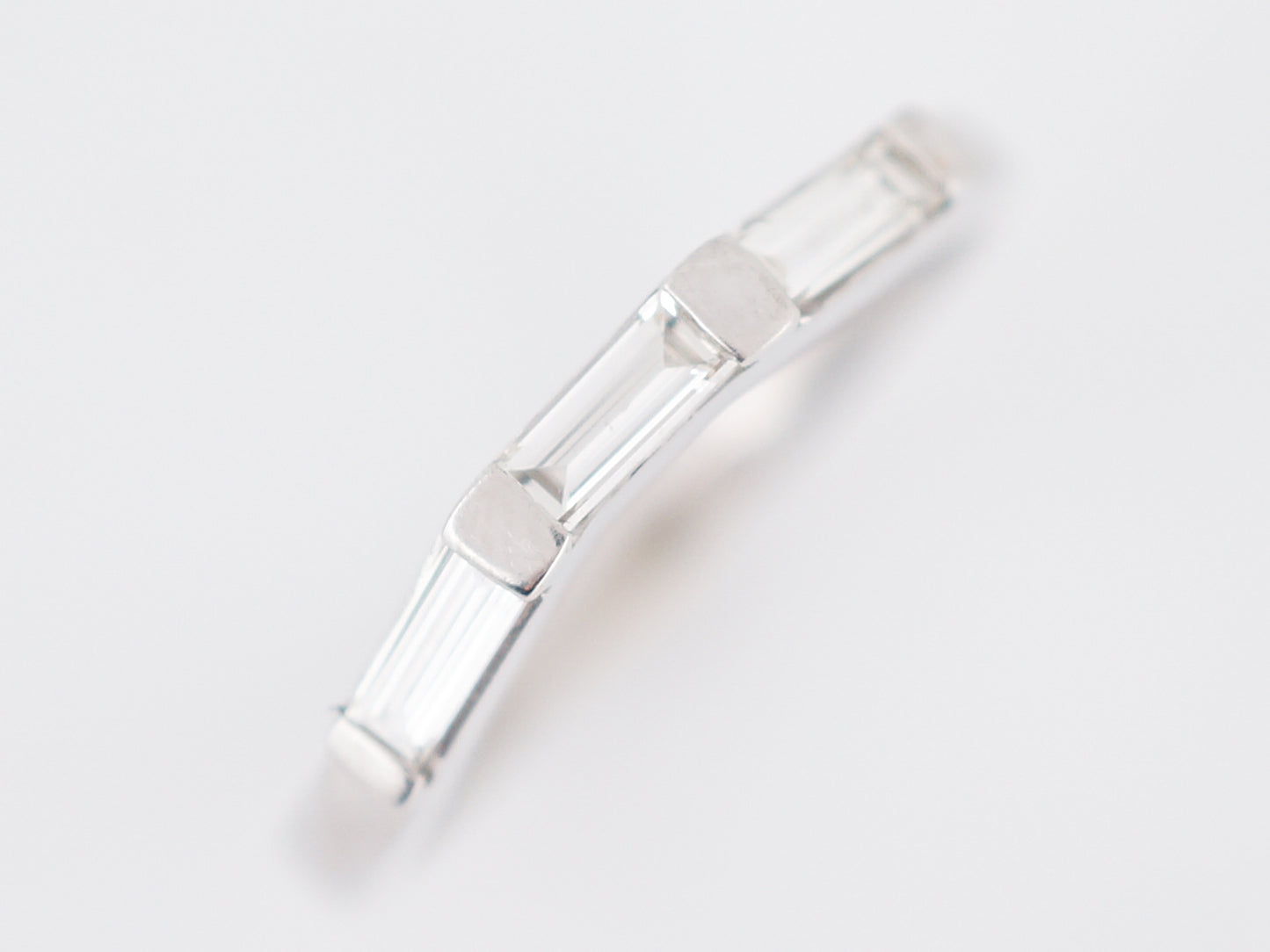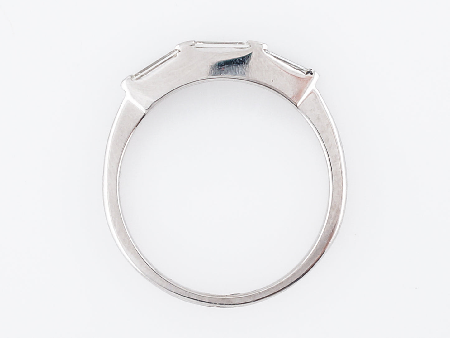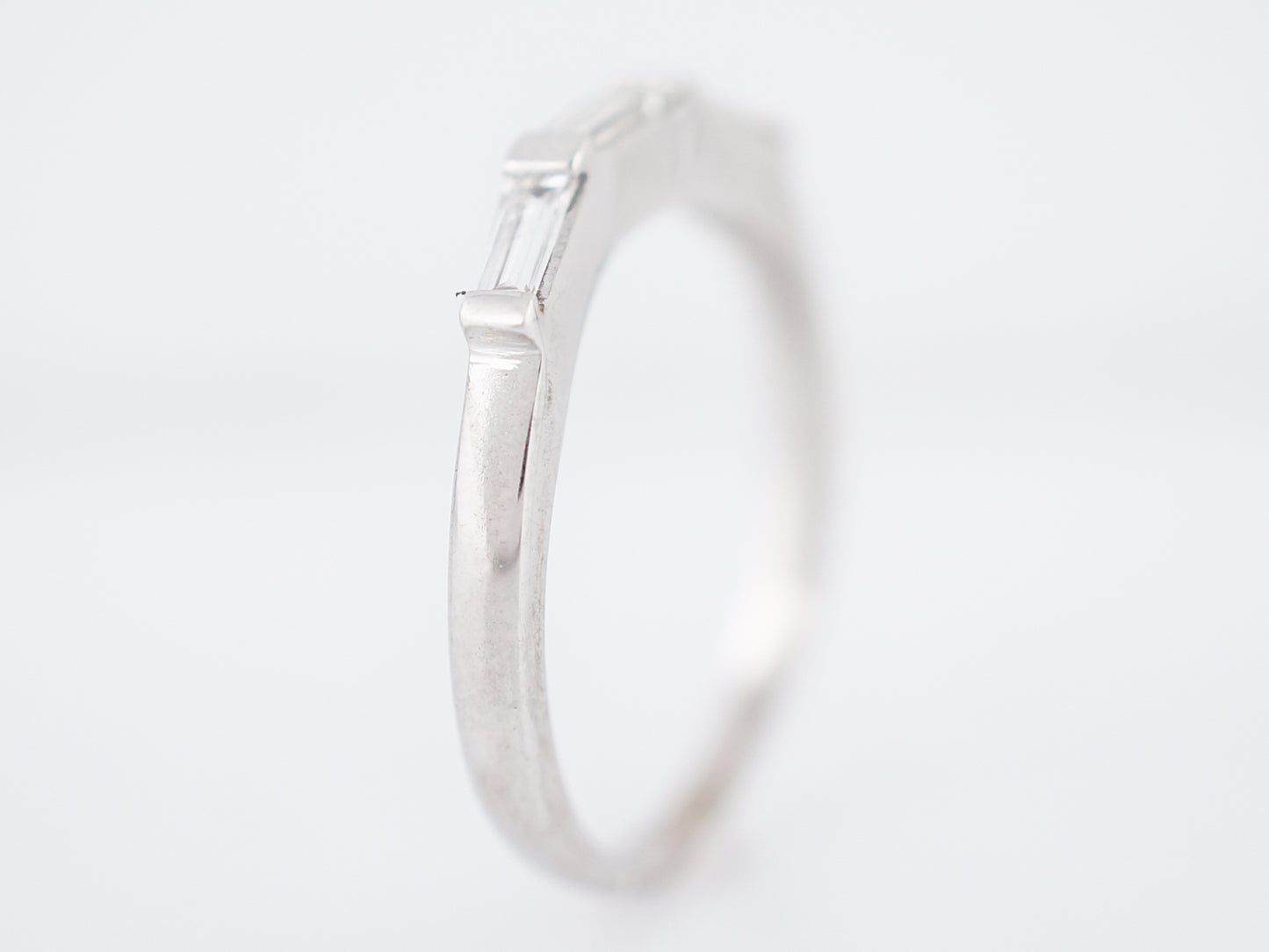 This Modern Era wedding band has three (3) straight baguettes weighing 0.21 carats total weight. The diamonds are bar set and form a slight curve which can fit quite nicely against an engagement ring that has a profile that is not perfectly straight. Cast in Platinum, this ring has a beautiful high polish and the simplicity of it makes it a wonderful pairing to a vintage or modern engagement ring.