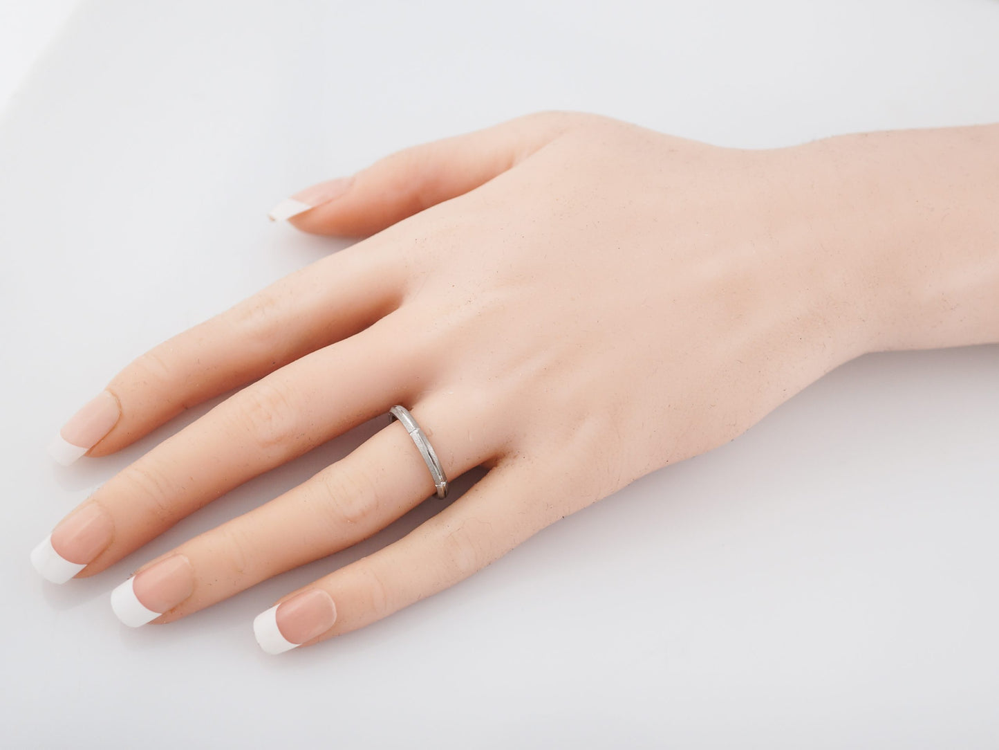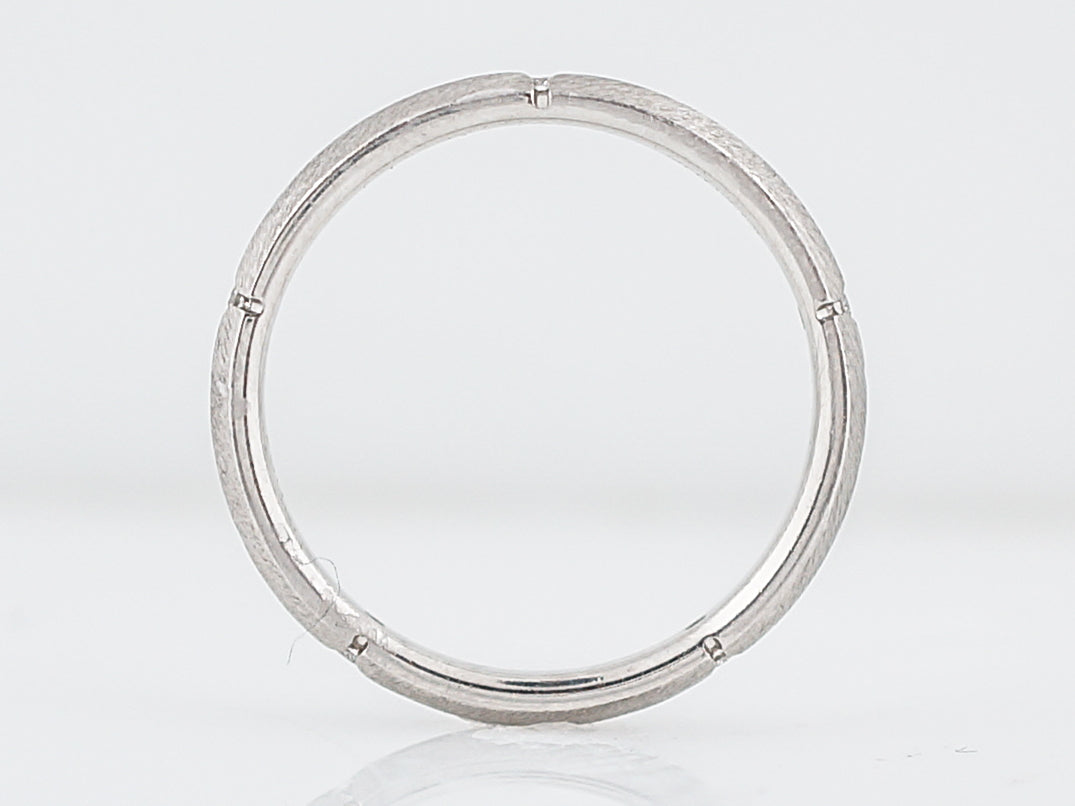 This modern Tiffany and Co band is part of the initial celebrations collection and was made in 2002. The band features five (5) round brilliant diamonds fish set into the 18 karat white gold band. The diamonds are space evenly through out the band creating a modern diamond eternity band. The center of the band is grooved with a high polish highlighting the diamonds brilliance and is in contrast to the brushed finish of the entire band. This designer band is lovely as a modern wedding band or a perfect edition to any stackable ring set.