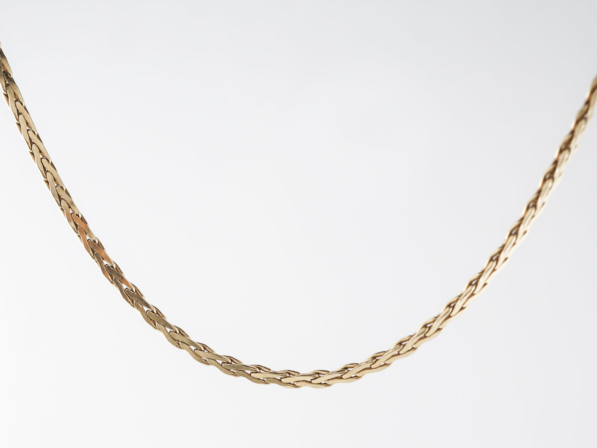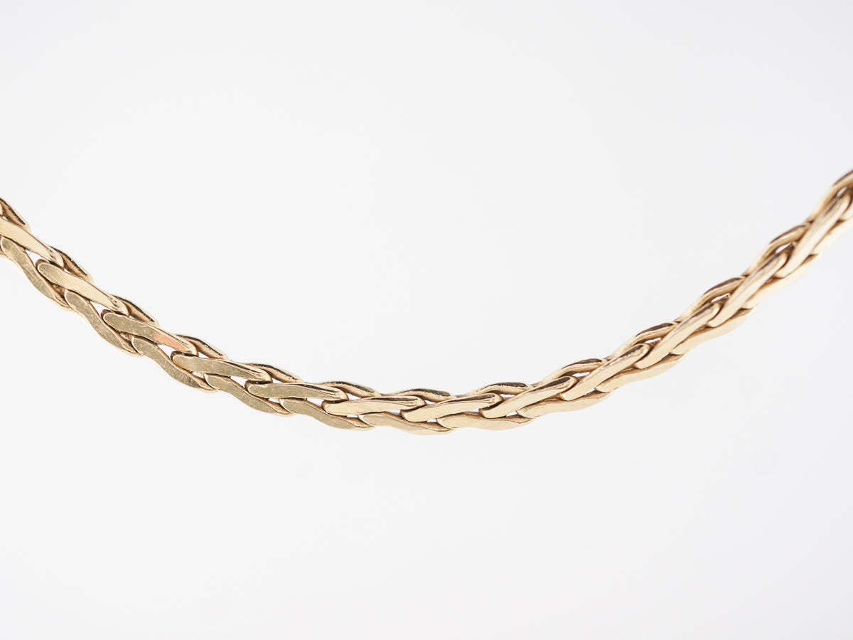 Modern Woven Yellow Gold Chain Necklace in 14k. This charming modern necklace features links of 14 karat yellow gold in a woven pattern. The necklace measures 16 inches in length and would be perfect on its own, with a pendant, or with a stack of other chains.