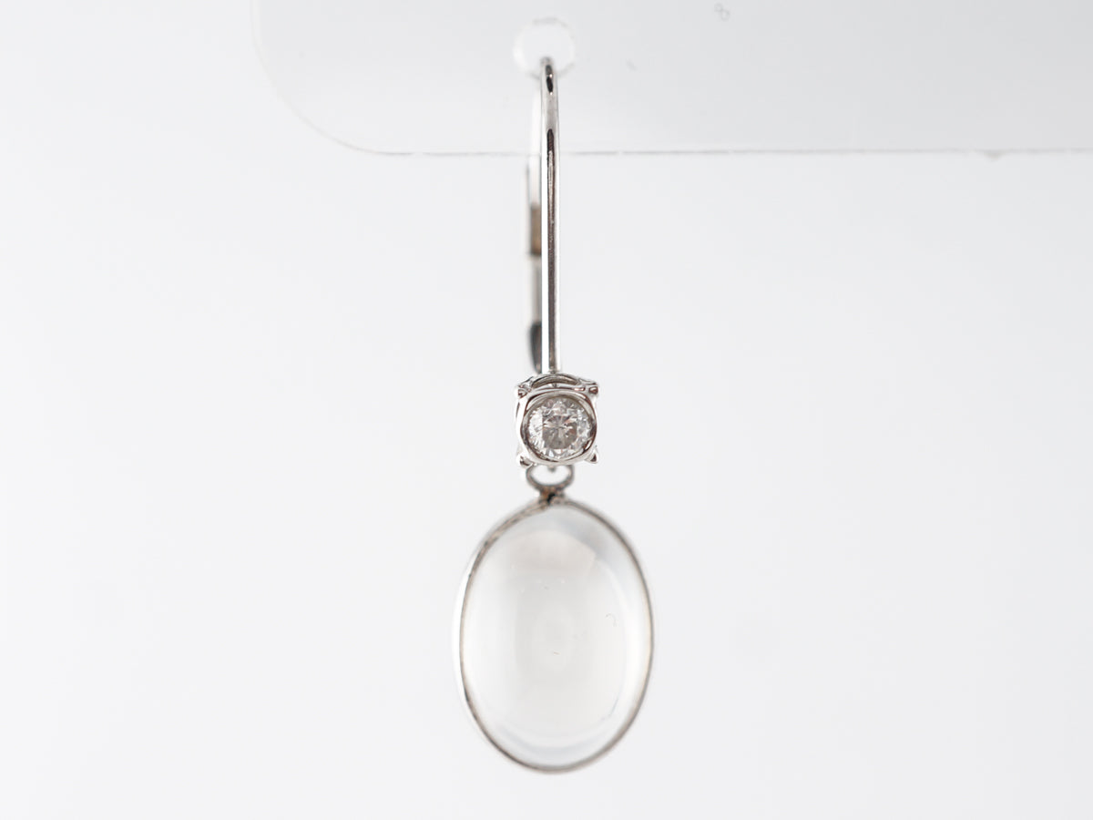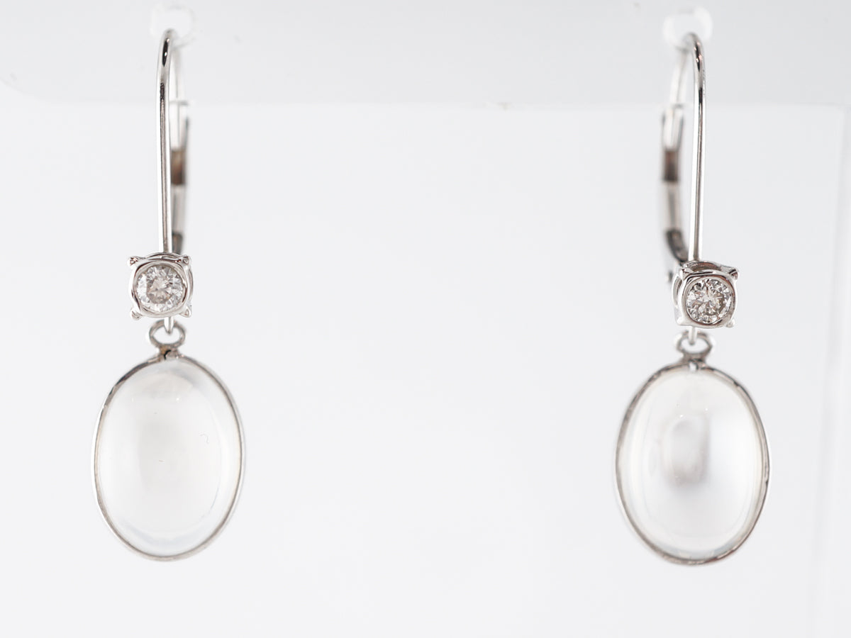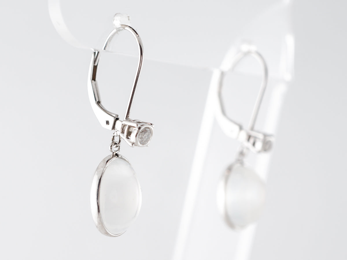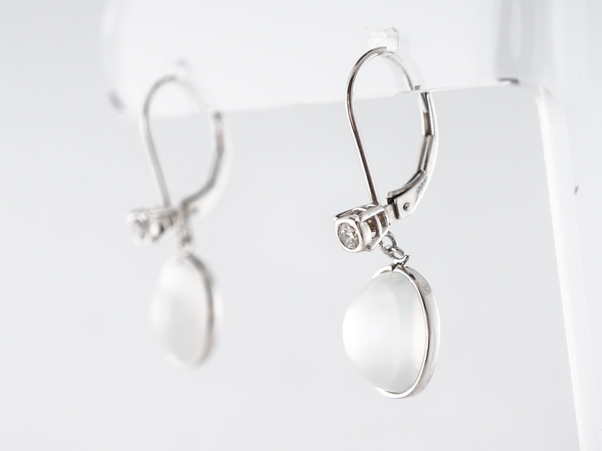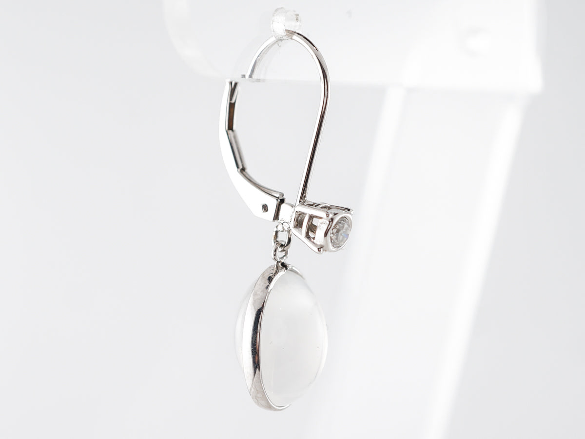 Moonstone Diamond Dangle Earrings in White Gold.  These glorious modern moonstone earrings feature 9.36 carats of moonstone and .20 carats of diamonds set in 14 karat white gold. The moonstones and diamonds are both bezel set and the moonstones dangle just below the diamonds providing nice movement. The closure is a lever-back with a loop that drops just below the ear.