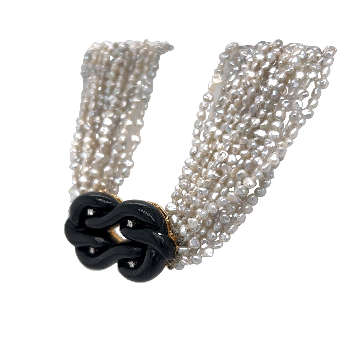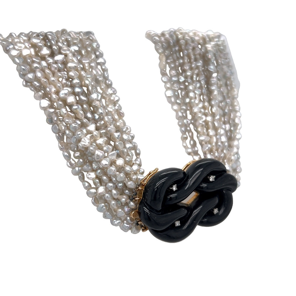 Multi Strand Pearl Necklace w/ Onyx Diamonds in 14k. This striking pearl and onyx necklace features four (4) small accent diamonds set in 14 karat white gold. The necklace has multiple strands of small seed pearls that are held by a dramatic knot clasp of polished onyx. This would be an amazing piece to pair with fancy evening wear and will be sure to turn heads.