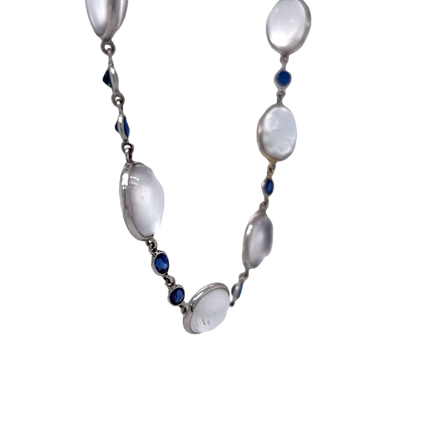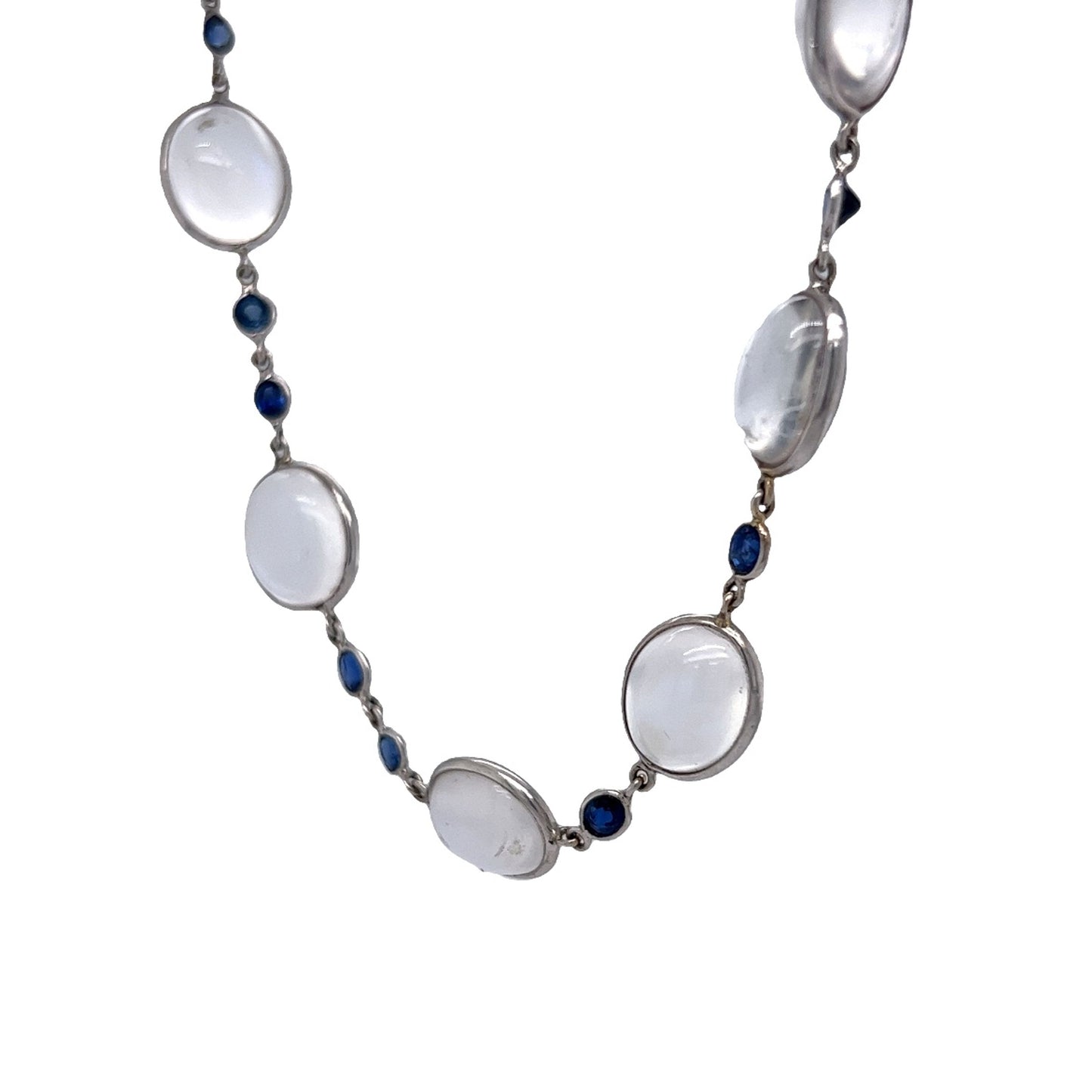 This Modern cabochon moonstone and sapphire necklace is set in 18 karat white gold. The iridescent milky moonstone has a stunning blue play of color, which exemplify the richness of the sapphires set in-between. At thirty inches long, it is stunning draped down ones chest, but is long enough to double up for a bold choker look.