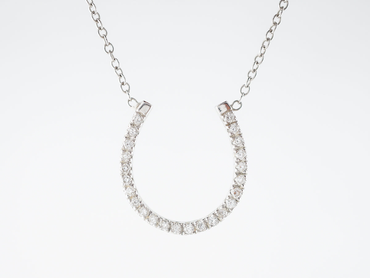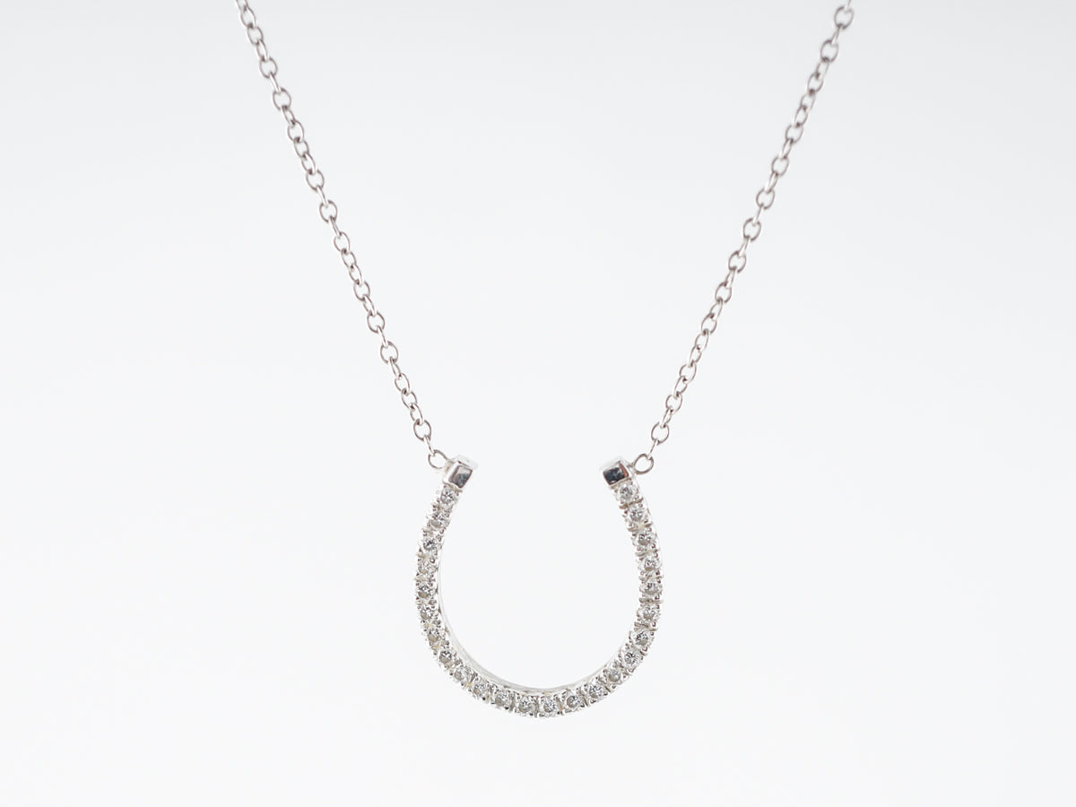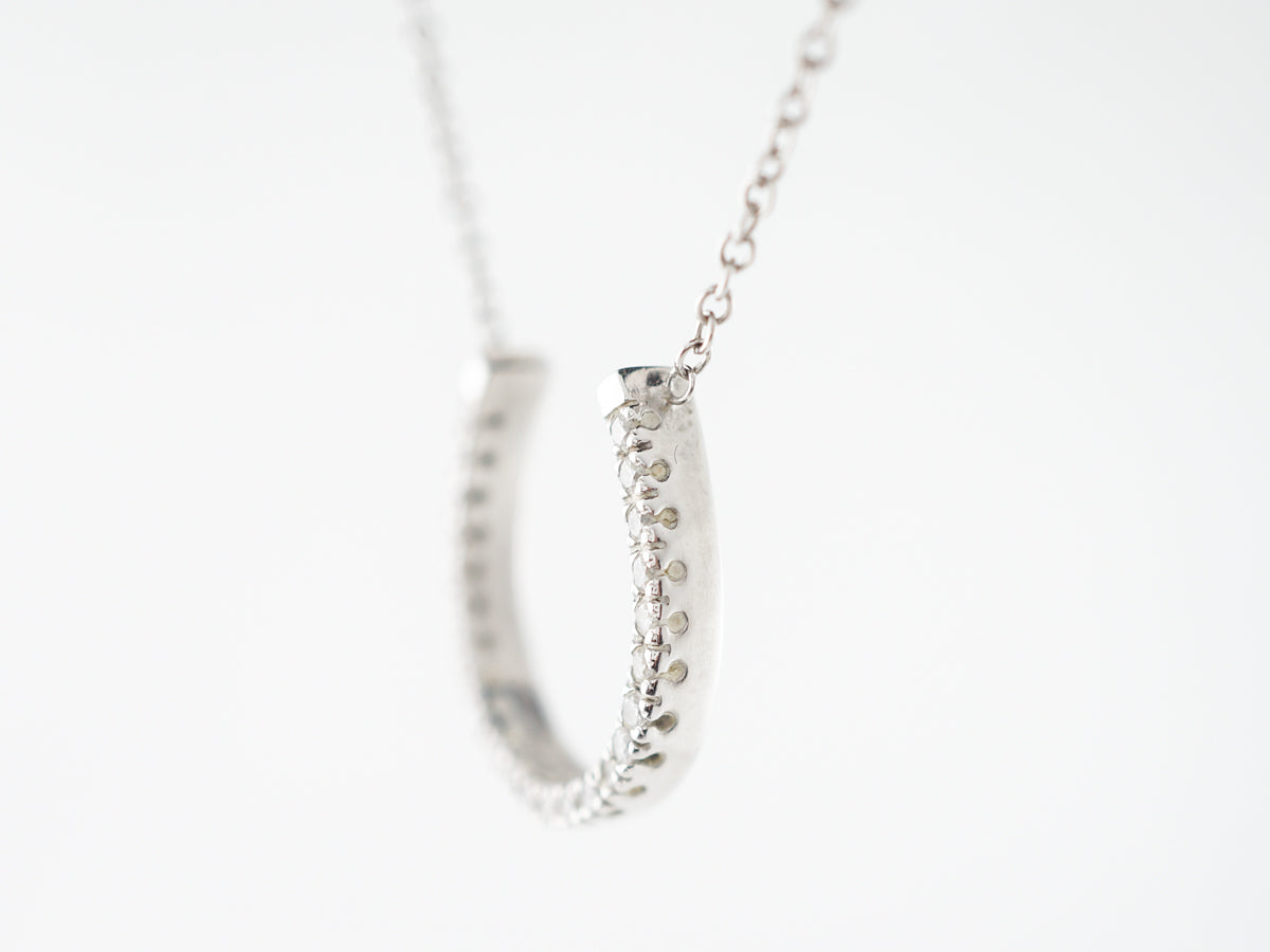 The horseshoe is a well known symbol that has been widely used to attract good fortune. This necklace is made of 14k white gold and the attractive, familiar U shape is fully covered in .36 carat round brilliant cut diamonds. This piece is charming and playful. We think it would make a great everyday necklace and it would also be fun layered with other pendant necklaces.