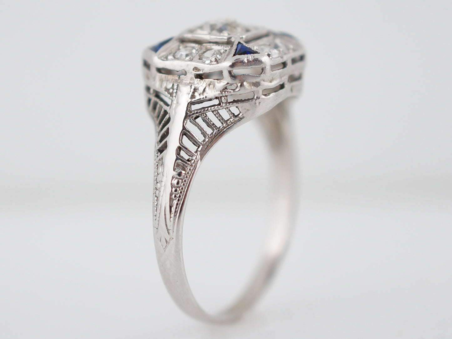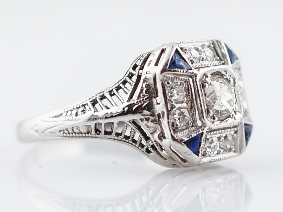 Old Euro diamond sapphire engagement ring in 18k. This finely crafted 18k white gold Art Deco setting features a .26 carat old European cut diamond bead set in its center. Bezel set into each corner is a vibrant trilliant cut blue sapphire. Adding even further detail, eight single cut diamonds are further set above, below and to each side giving this ring so much life, detail and sparkle!