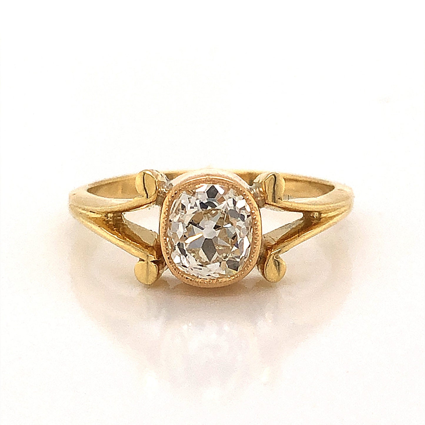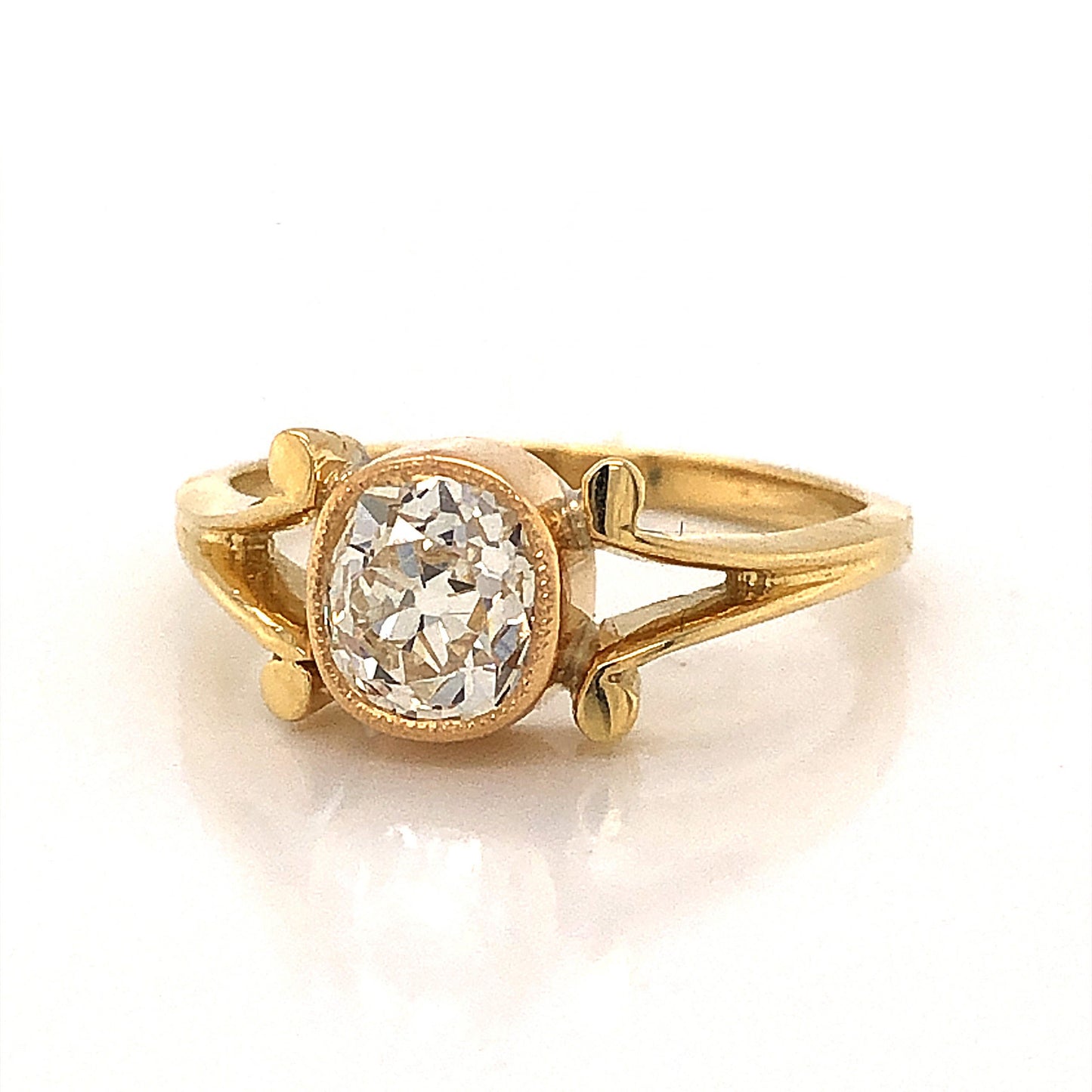 Say hello to your dream solitaire engagement ring! This one of a kind modern engagement ring features a .92 carat old European cut diamond in 18 karat yellow gold. A romantic, glittering, near colorless diamond with rustic facets. The diamond is set in a secure bezel on a split shank band of 18K yellow gold. The bezel has milgrain engravings for added movement and delicate texture. A treasure for years to come!