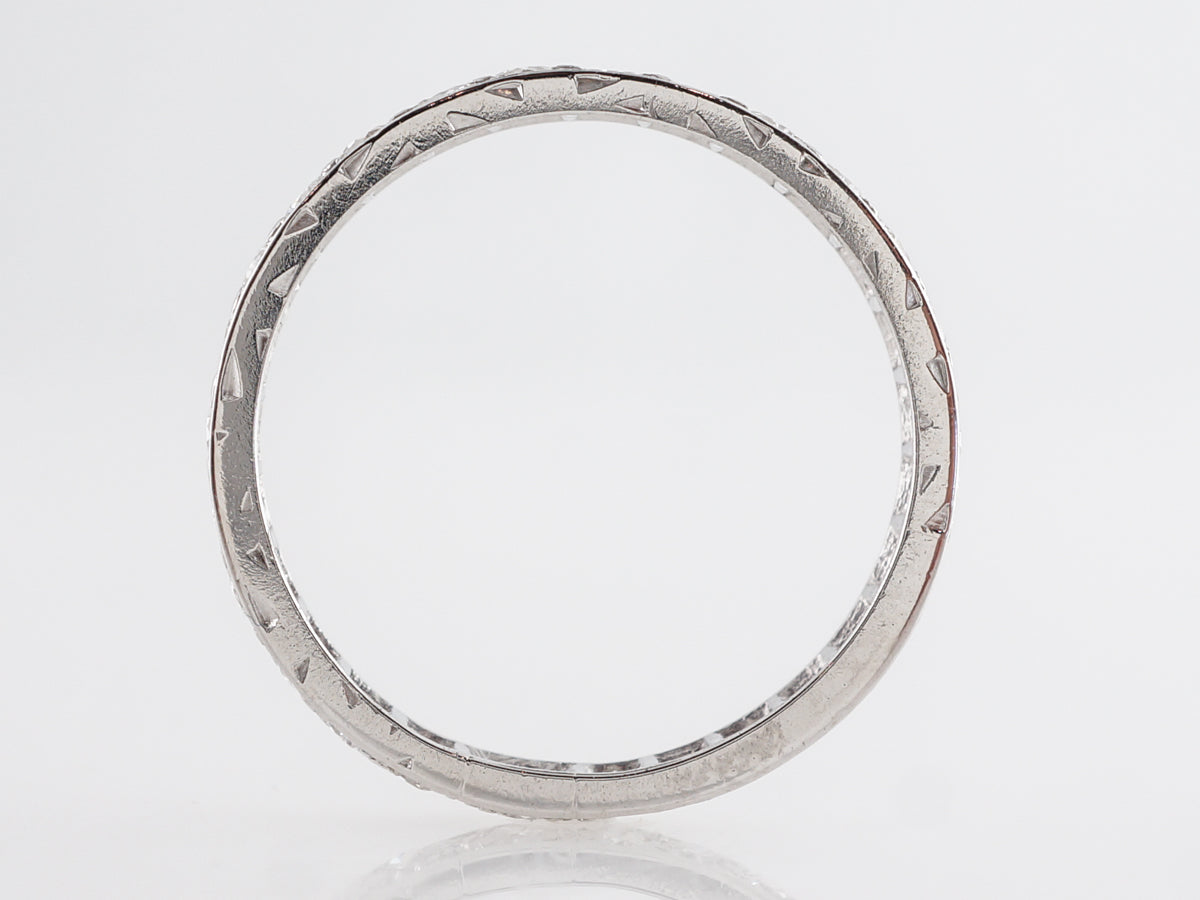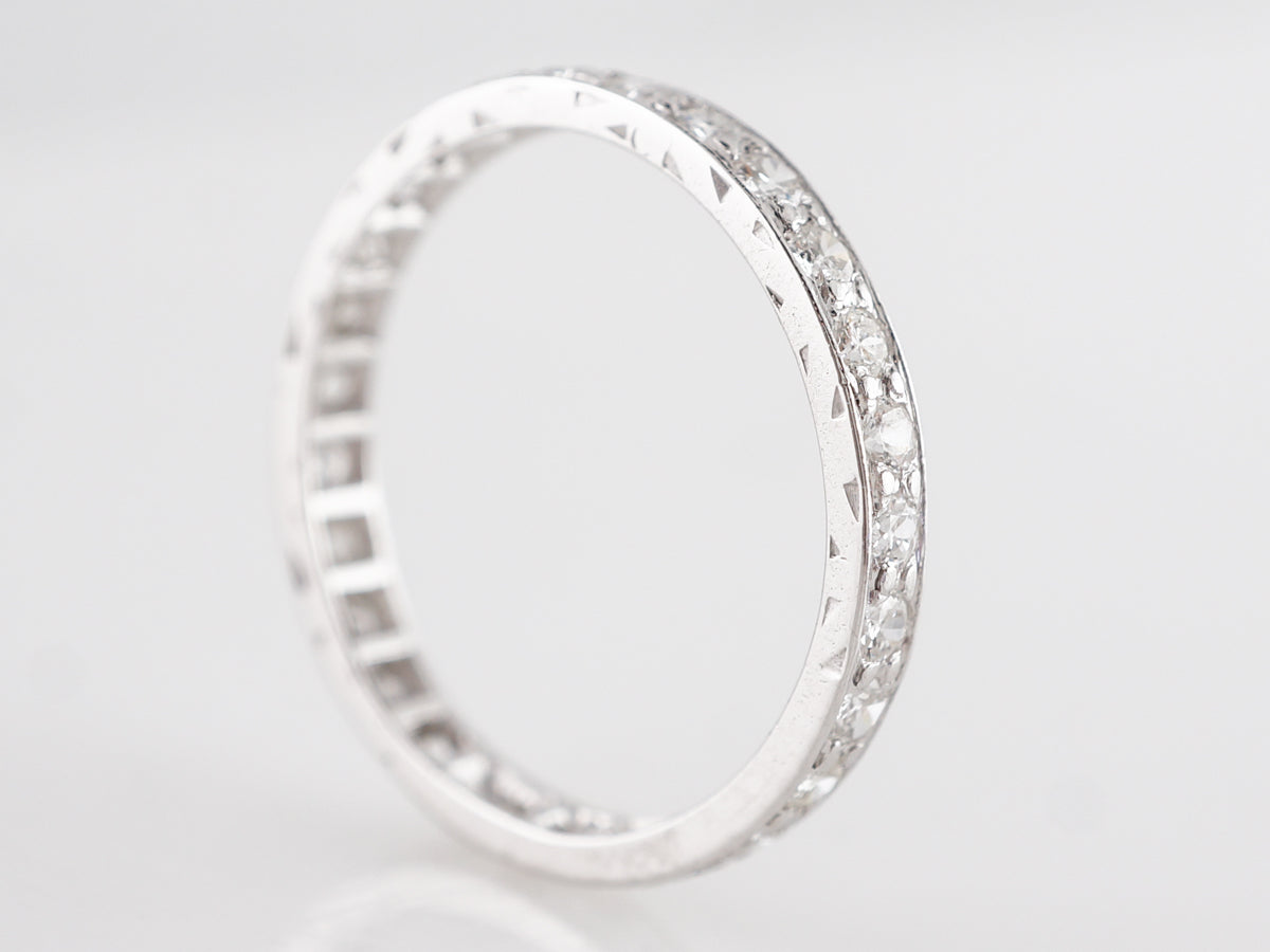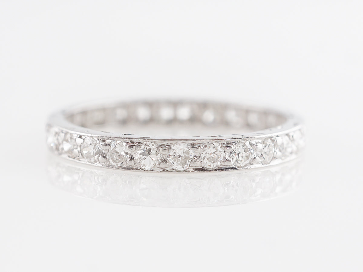 Old European Diamond Eternity Band in Platinum. This modern wedding band features .56 carats of Old European cut diamonds set in platinum. The diamonds run the length of the band and are hugged by a thin border and set with shared prongs. This could be a lovely ring for a right hand stack as well as a darling wedding band.