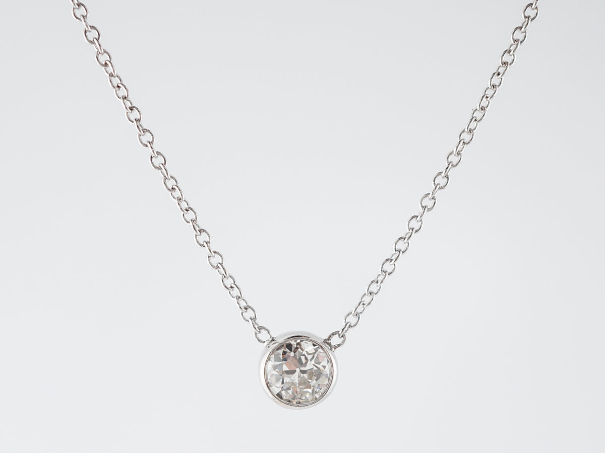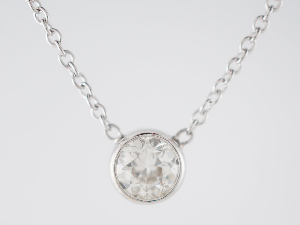 Old European Diamond Necklace in 14k White Gold. This modern necklace features a .30 carat old European cut diamond. The diamond is set into a custom bezel and attached to an 18 gold chain. This diamond necklace is perfect for everyday wear and a staple of any jewelry collection.