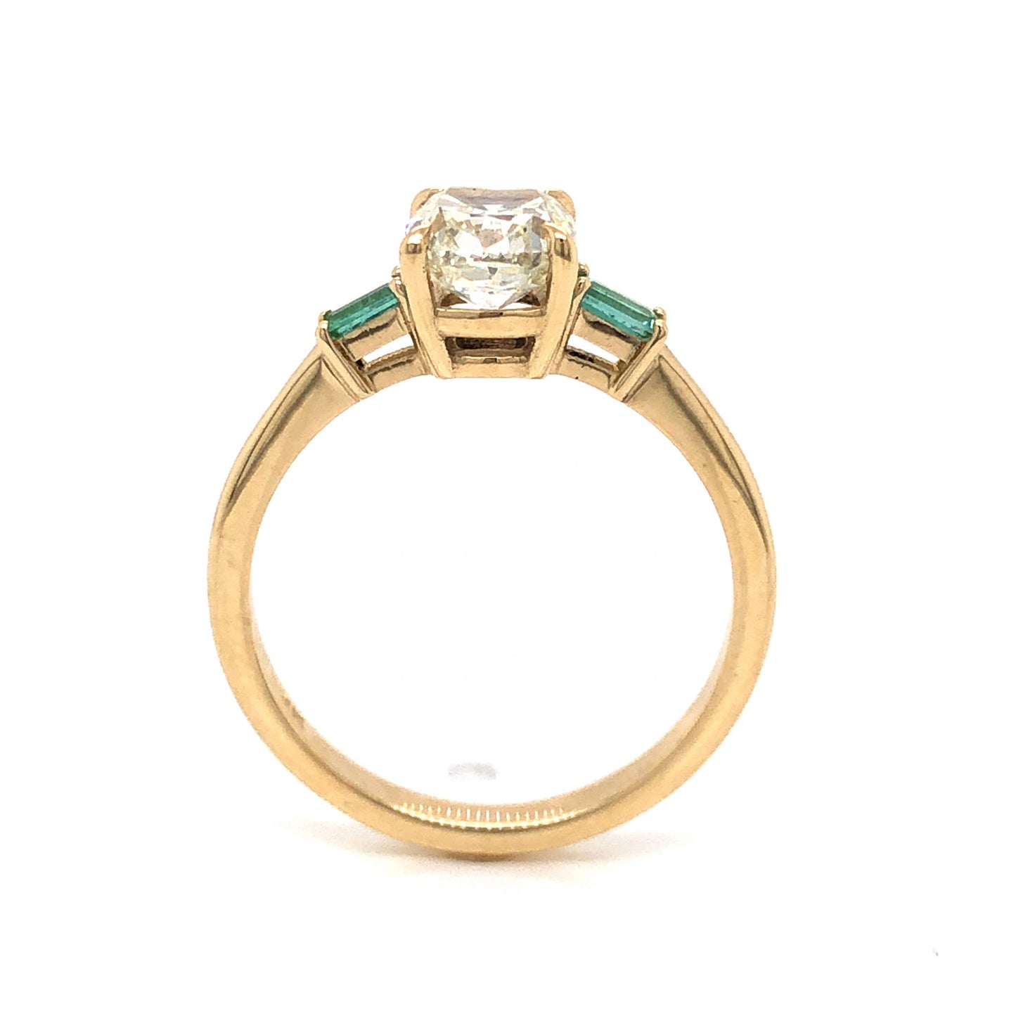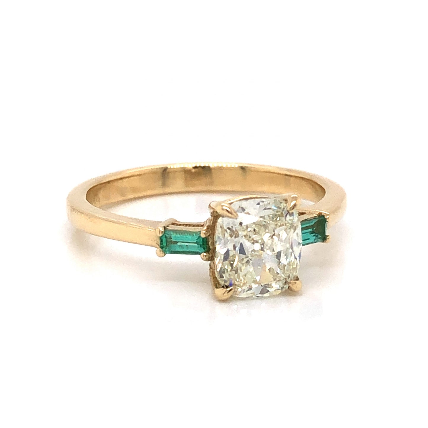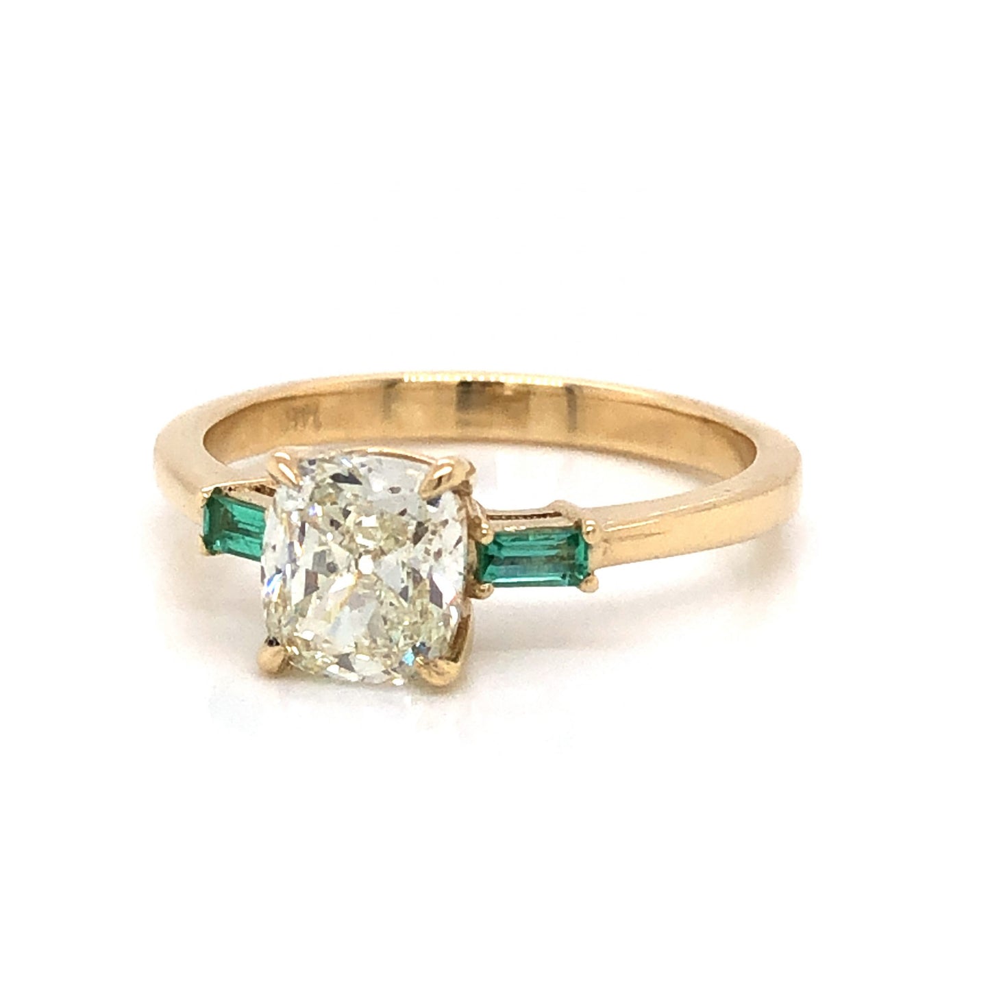 An eye-catching creation made custom By Filigree, this beautiful modern engagement ring features a 1.25 carat old mine cushion cut diamond and emerald accents in 14 karat yellow gold. The primary diamond has a faint champagne-honey hue. With plump facets that pyramid inward, the diamond reflects excellent amounts of brilliance and fire. Two (2) emeralds flank the diamond for a romantic depth of color. From the profile, a classic basket mounting holds the collection of gemstones, finished in high polish 14K yellow gold.