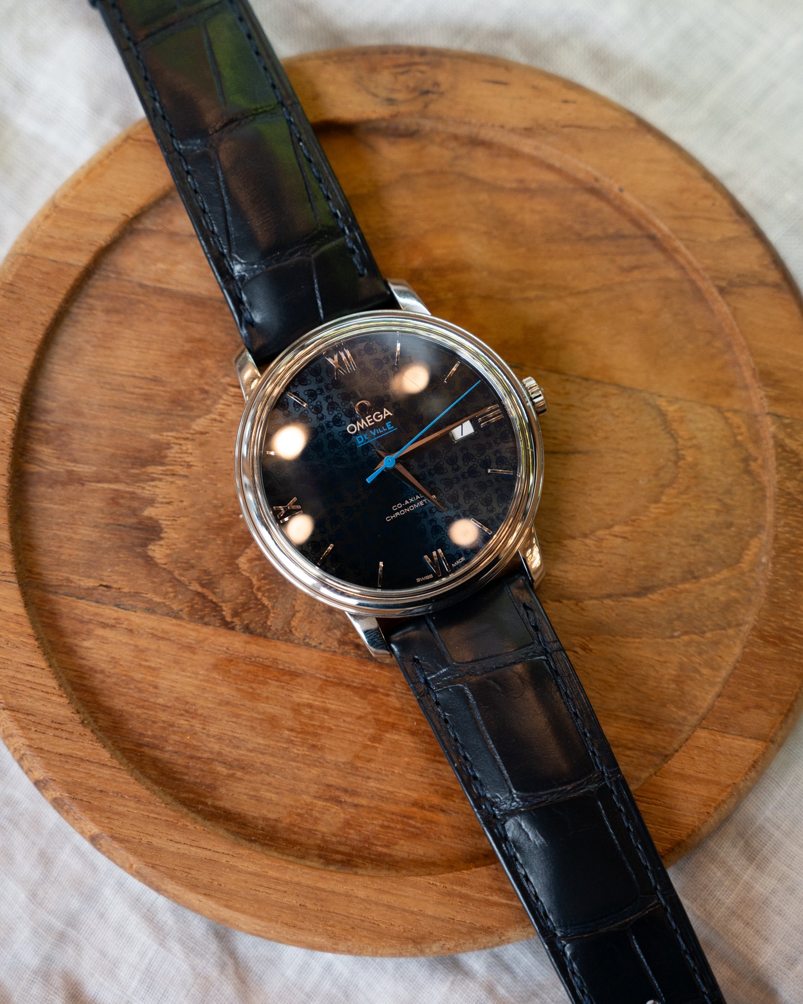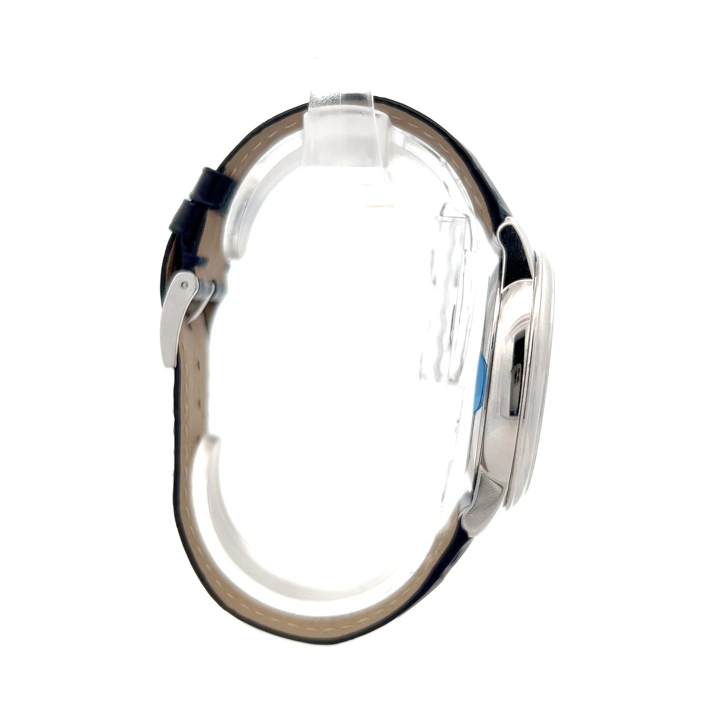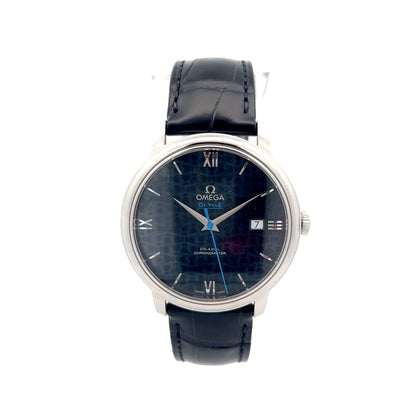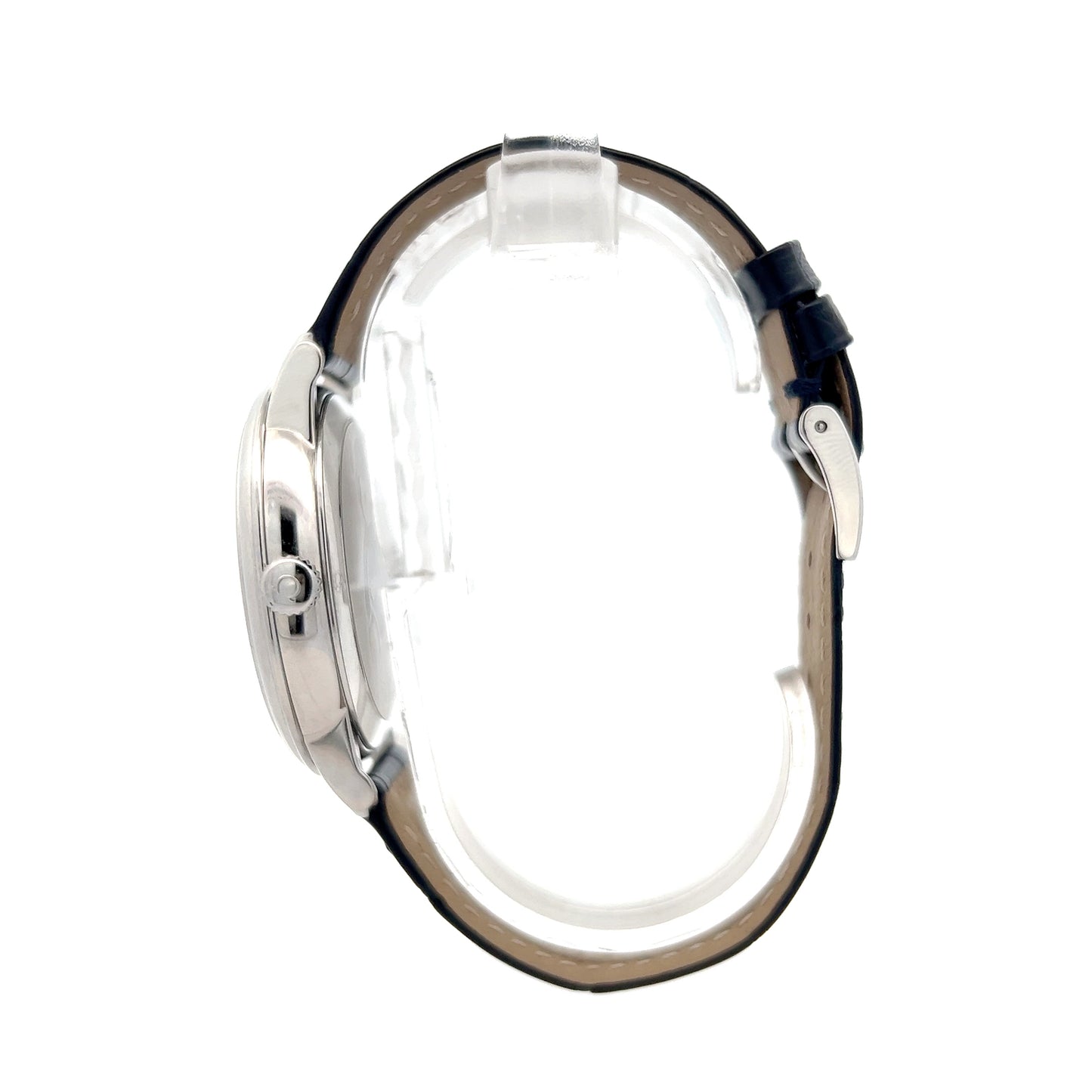This new, unworn Omega De Ville Prestige Orbis REF 424.13.40.20.03.003 features a 39.5mm stainless steel case housing the Calibre 2500 automatic movement with a blue leather strap. The watch comes as a complete set including box, wallet card, manual, and the special Orbis Certificate that authenticates this limited edition. The Calibre 2500 automatic movement provides self-winding functionality through wrist motion, eliminating the need for manual winding in regular use. This Orbis Edition represents a special release within Omega's De Ville Prestige line.