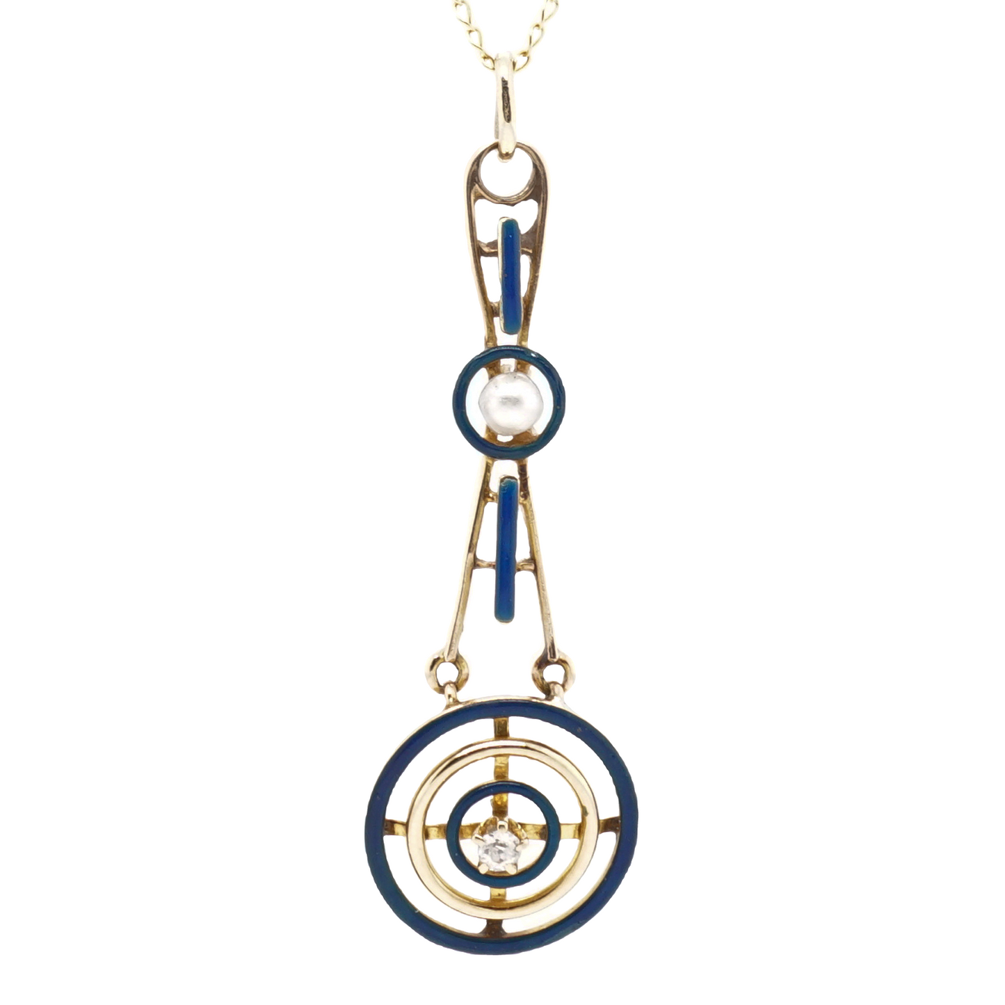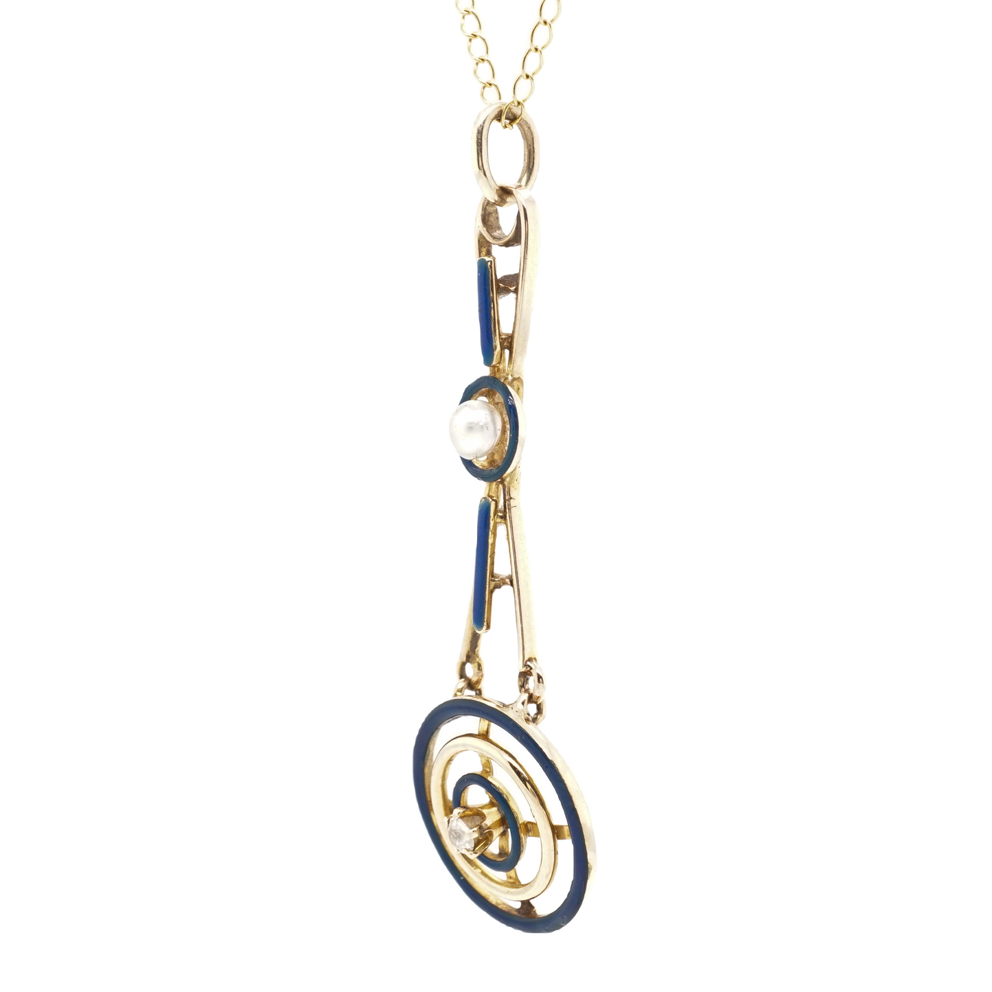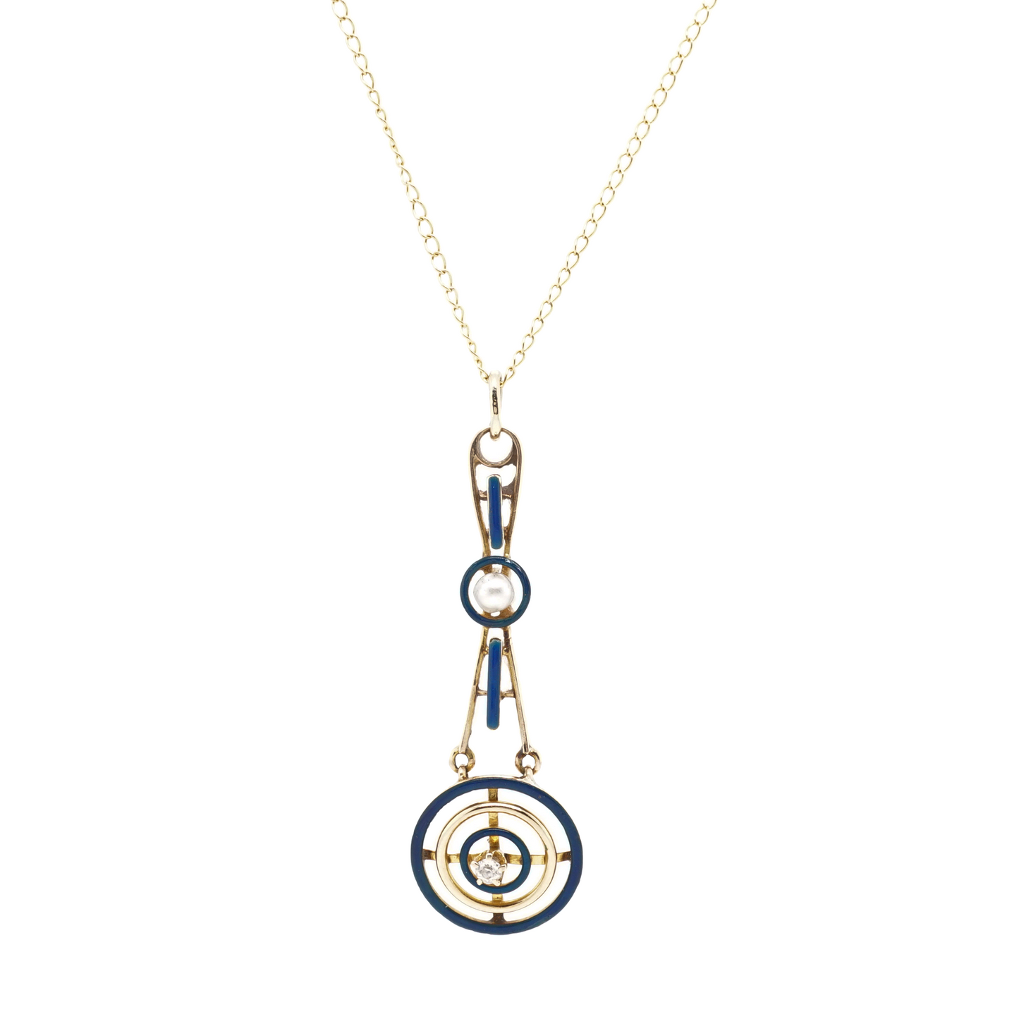 This antique Victorian pendant necklace features a structured chandelier design with a .025 carat Old Mine Cut diamond and an accent pearl finished in 14k yellow gold. Expressionist shapes with openwork spaces create the setting for the center diamond. The Old Mine Cut diamond is slightly squarish and has a delicate fire that brings attention to the bull’s eye structure of the pendant. The pendant comes with an 18”, 14k yellow gold chain.