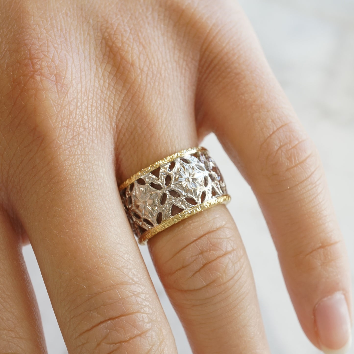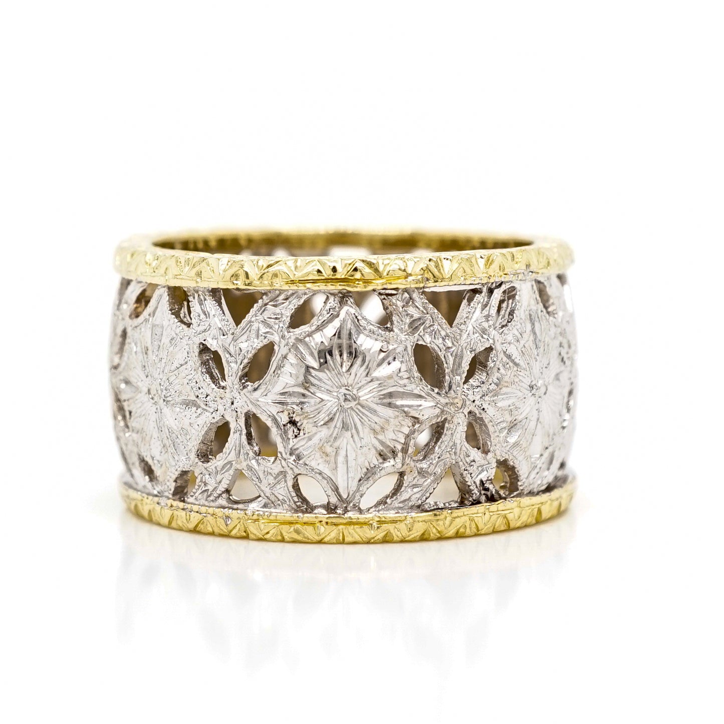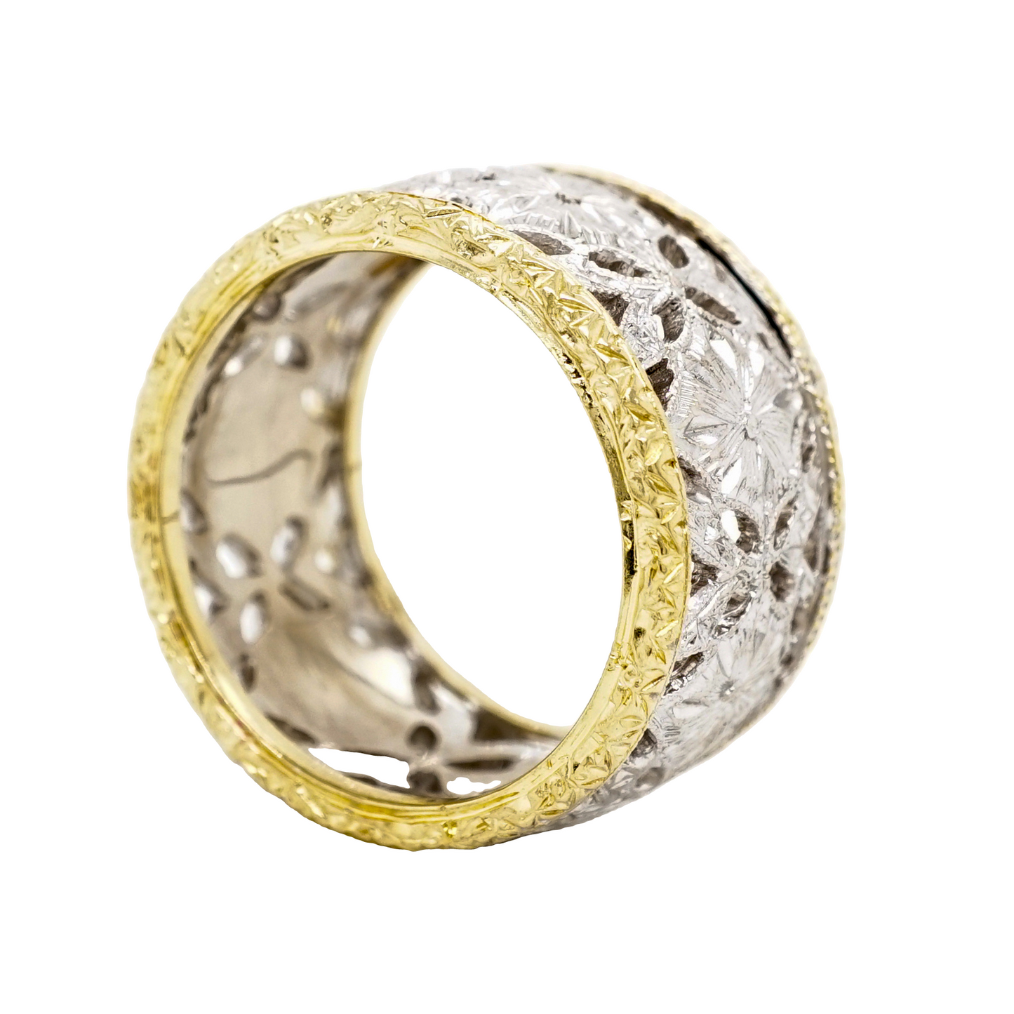 This Mid-Century cocktail ring features two-toned engravings in 18k white and 18k yellow gold. A glamorous openwork design circles the center of the shank in shimmering 18k white gold. The trim of the band features zigzag engravings in warm 18k yellow gold. The ring weighs a total of 10.4 grams and is a fashionable example of fine Mid-Century jewelry!