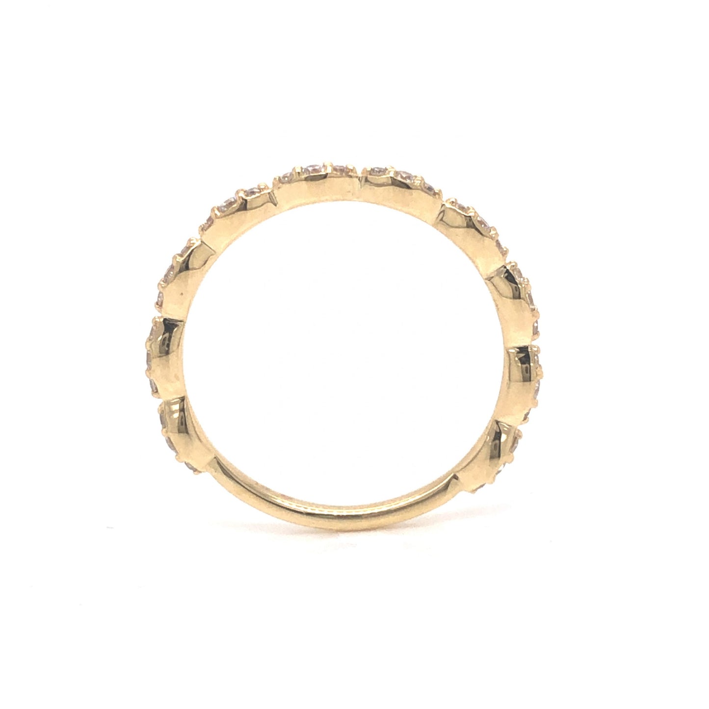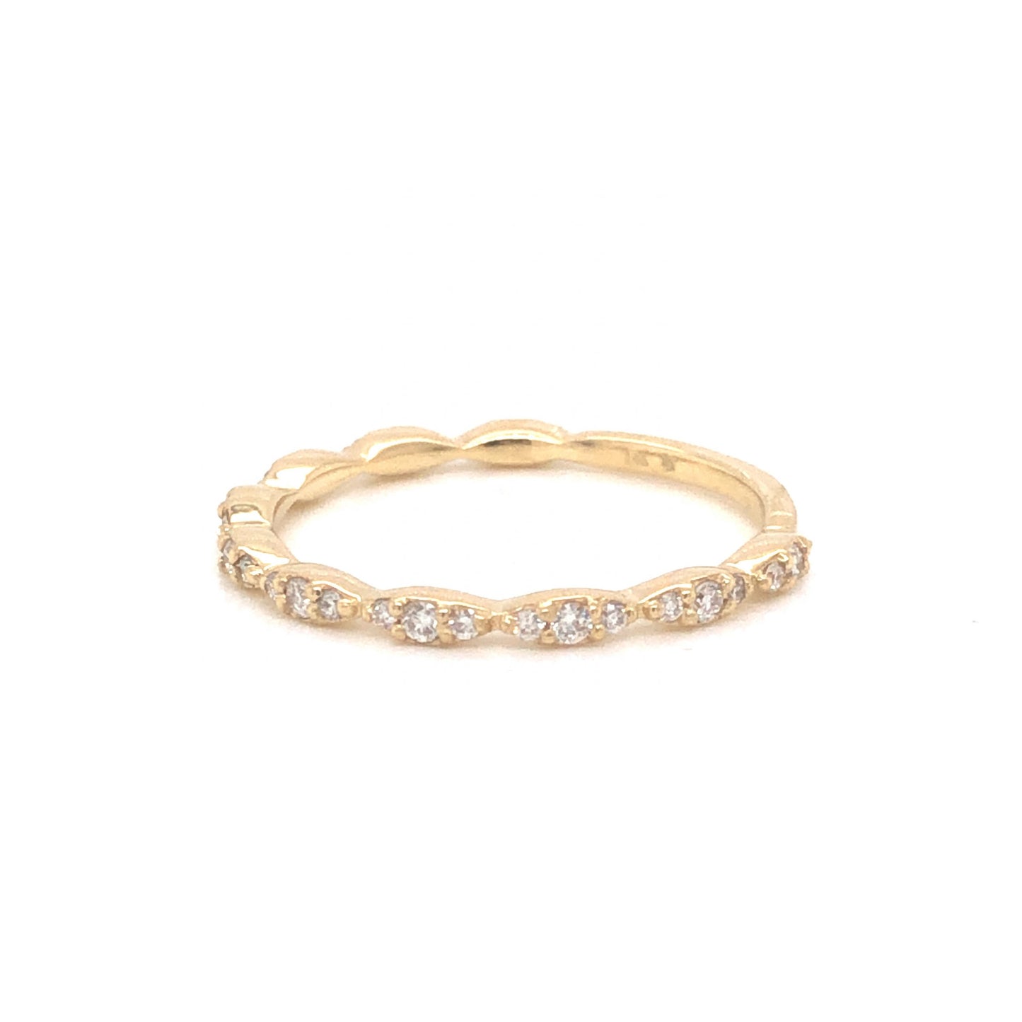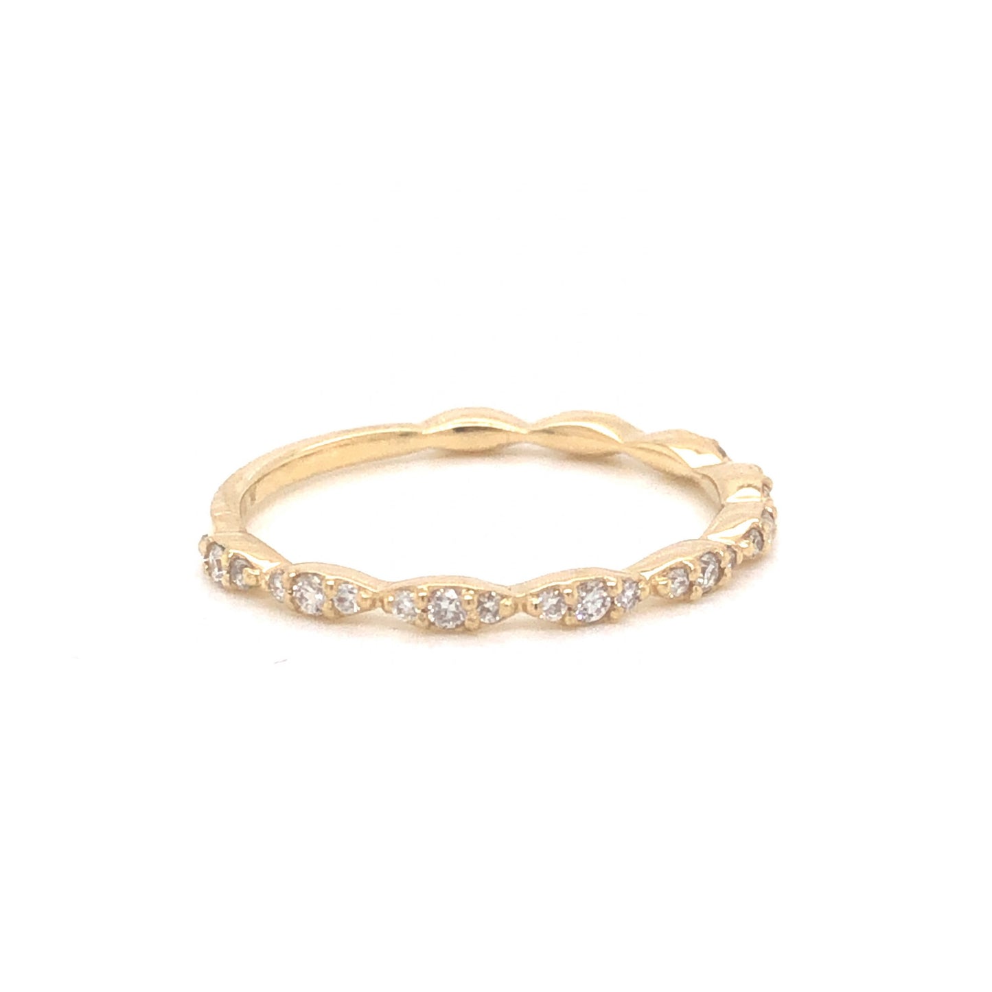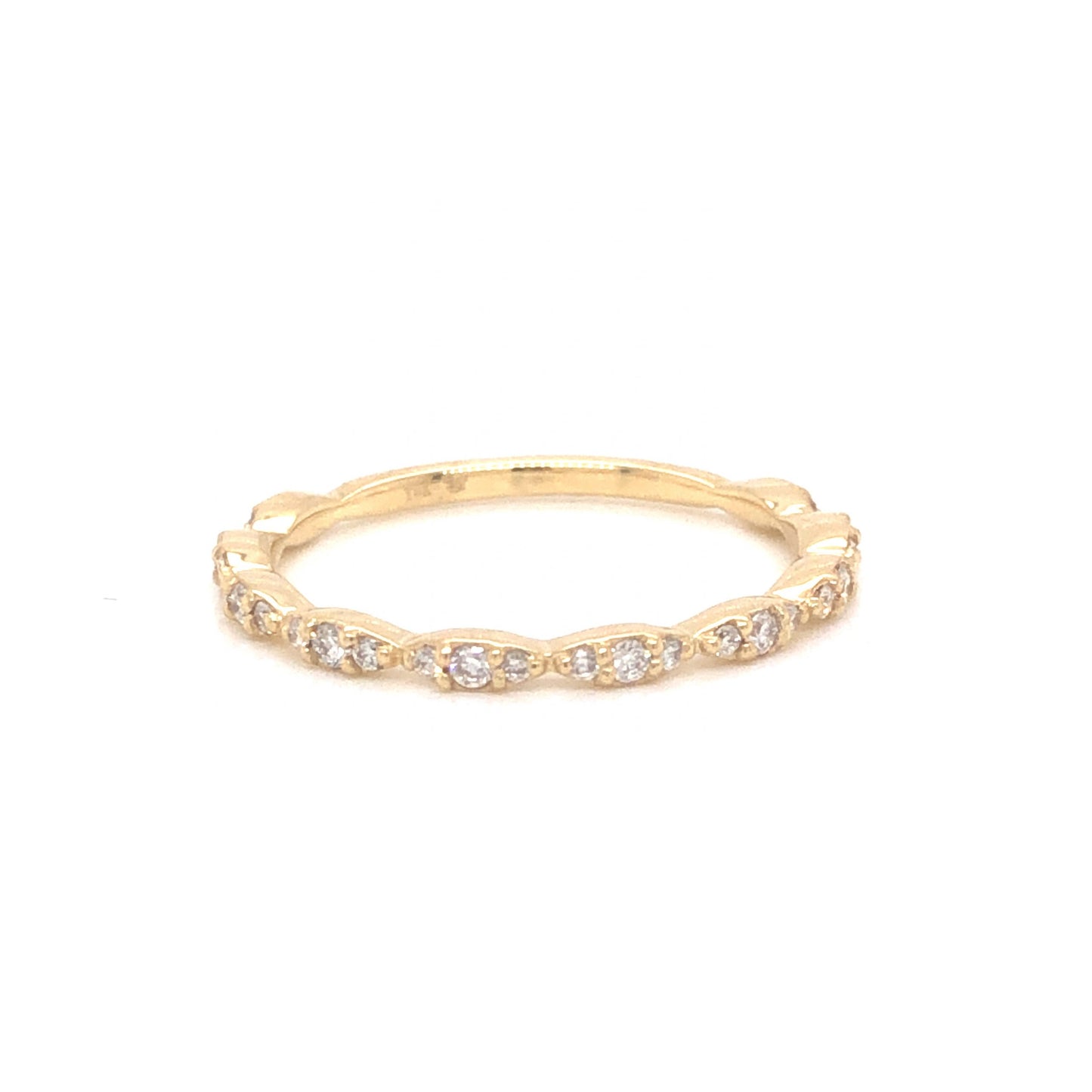 Thin .24 Half-Eternity Diamond Wedding Band in 14k Yellow Gold. This elegant and simple diamond wedding band features .24 carats of sparkling diamonds finished in 14 karat yellow gold. This modern wedding band is textural and stylish, and will pair beautifully next to any solitaire engagement ring!