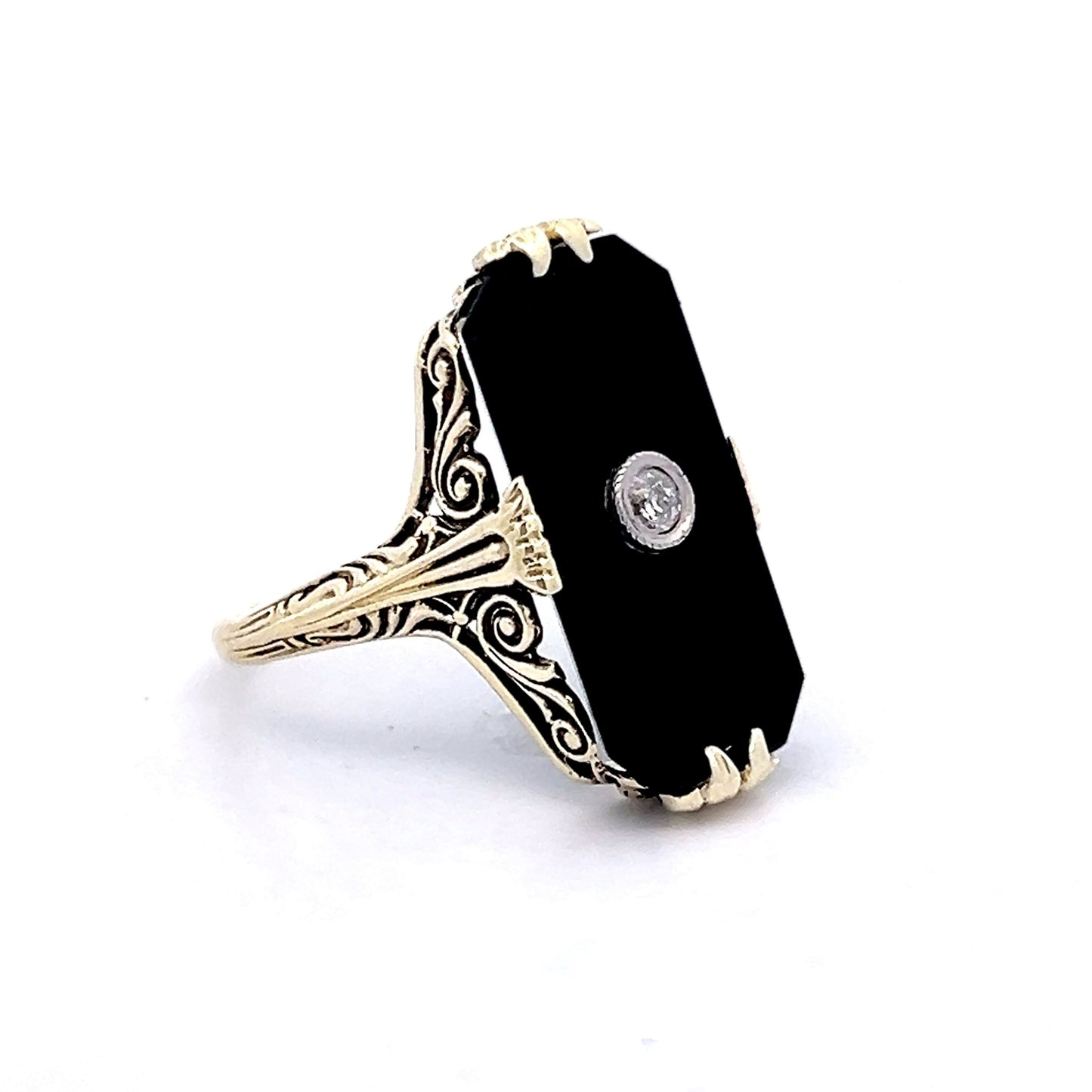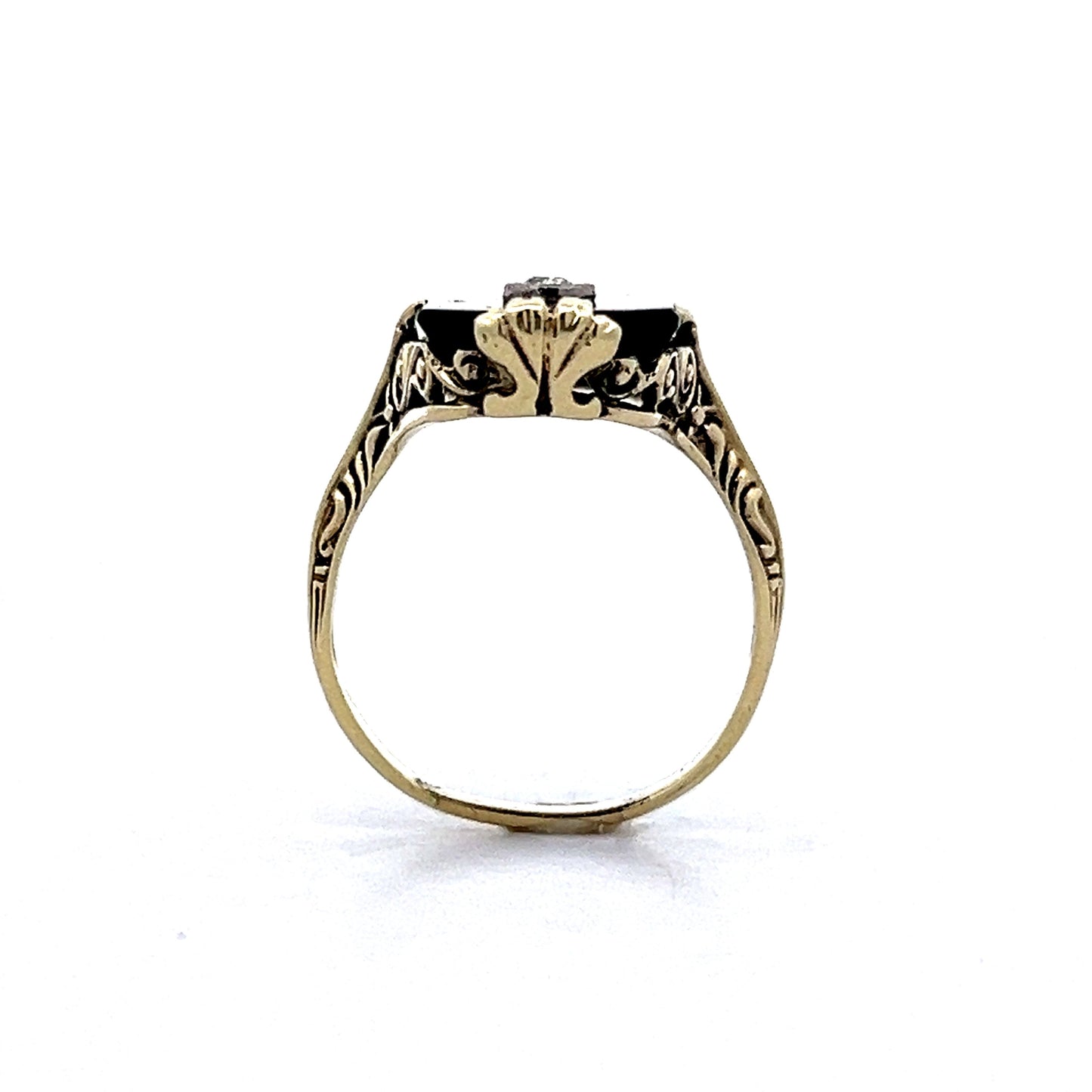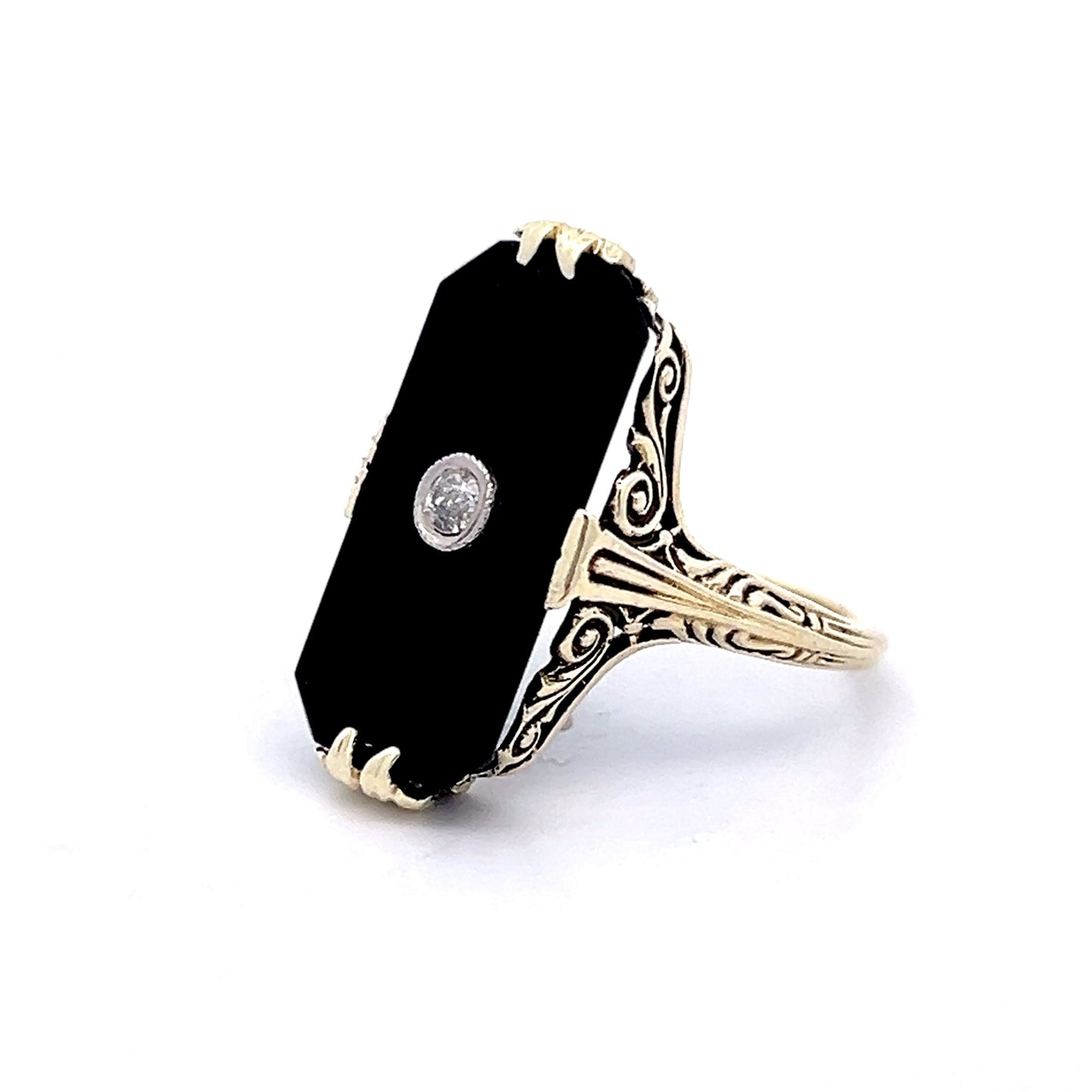 This Art Deco cocktail ring captures the drama of its era with a striking rectangular black onyx, bordered by a 14 karat yellow gold bezel. At its center, an Old European cut diamond of .08 carats, with I1 clarity and I color, offers a subtle contrast to the rich onyx. The ring’s intricate filigree mounting exemplifies the meticulous craftsmanship of the time, while the yellow gold band completes the design with understated refinement. Whether for an elegant evening or to add a vintage touch to your everyday style, this ring embodies the bold, artistic spirit of Art Deco.