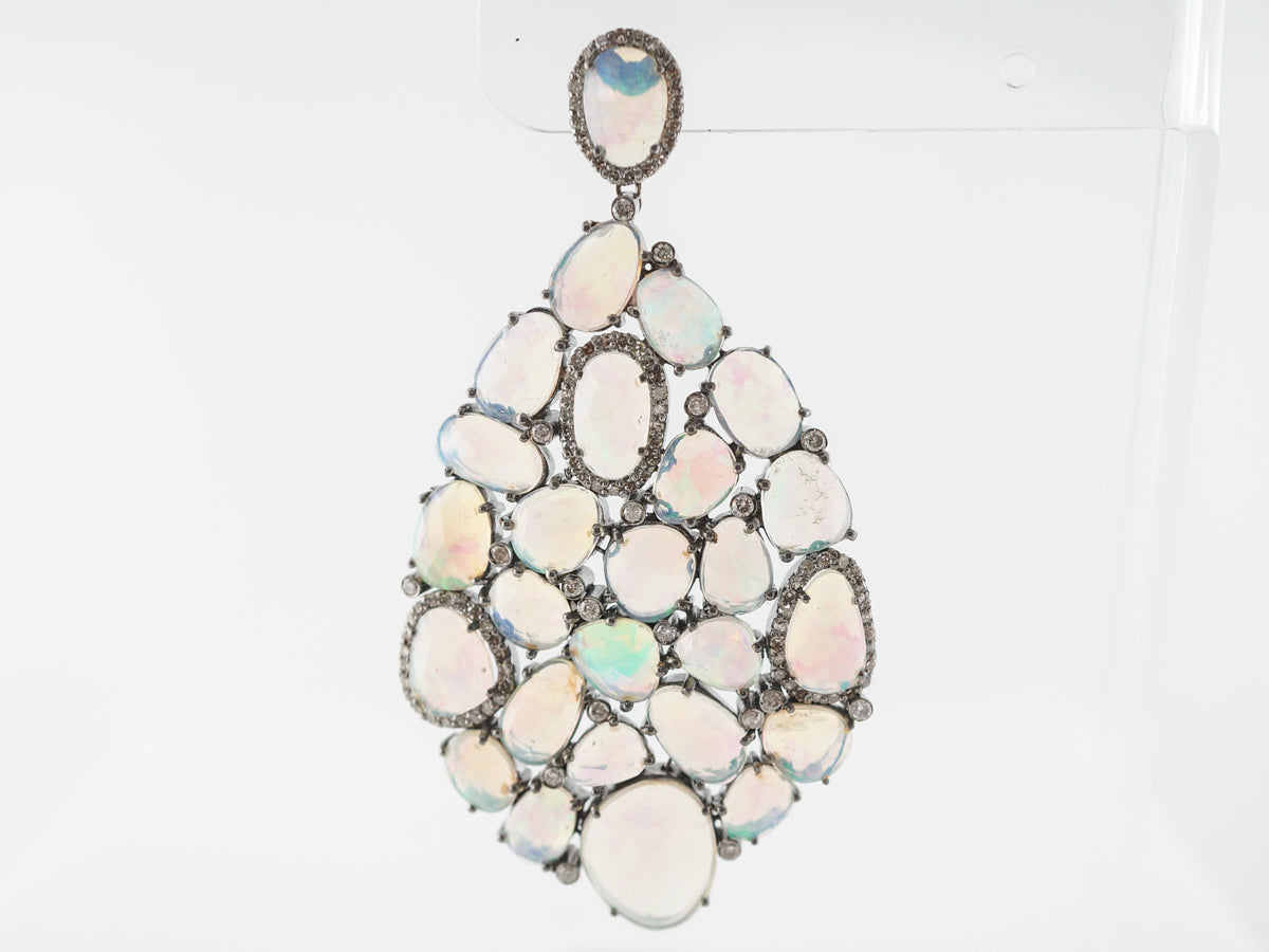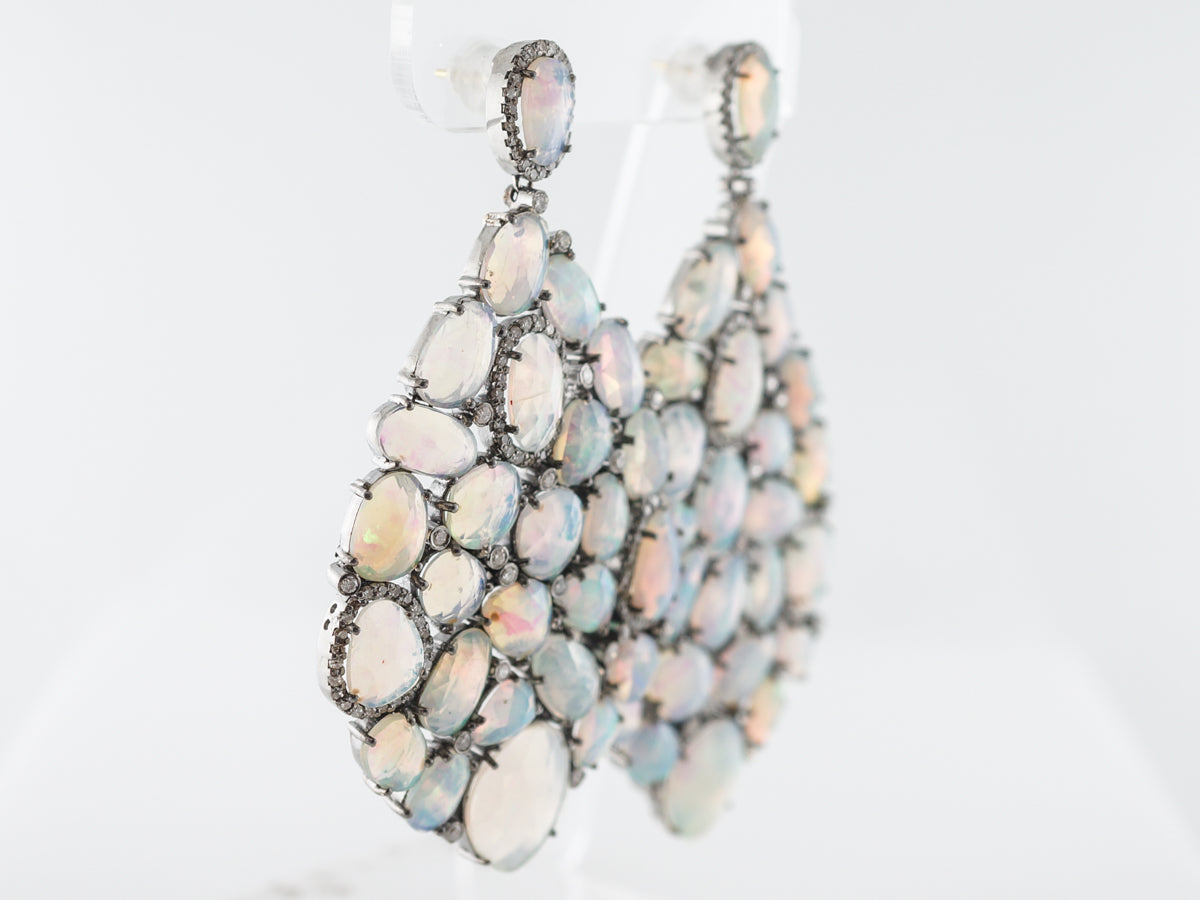 Opal Diamond Earrings in Sterling Silver Yellow Gold. These opal and diamond earrings have an incredibly bold appearance. Thirty four carats of opals of different shapes, sizes and colors create a wonderful interplay of color and texture. Two carats of diamonds are interspersed throughout and add a hint of sparkle to these amazing earrings.