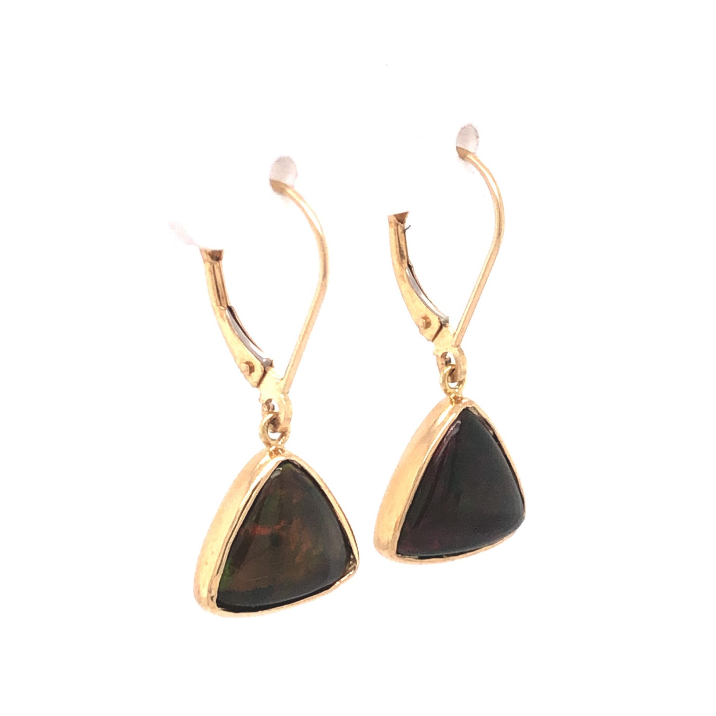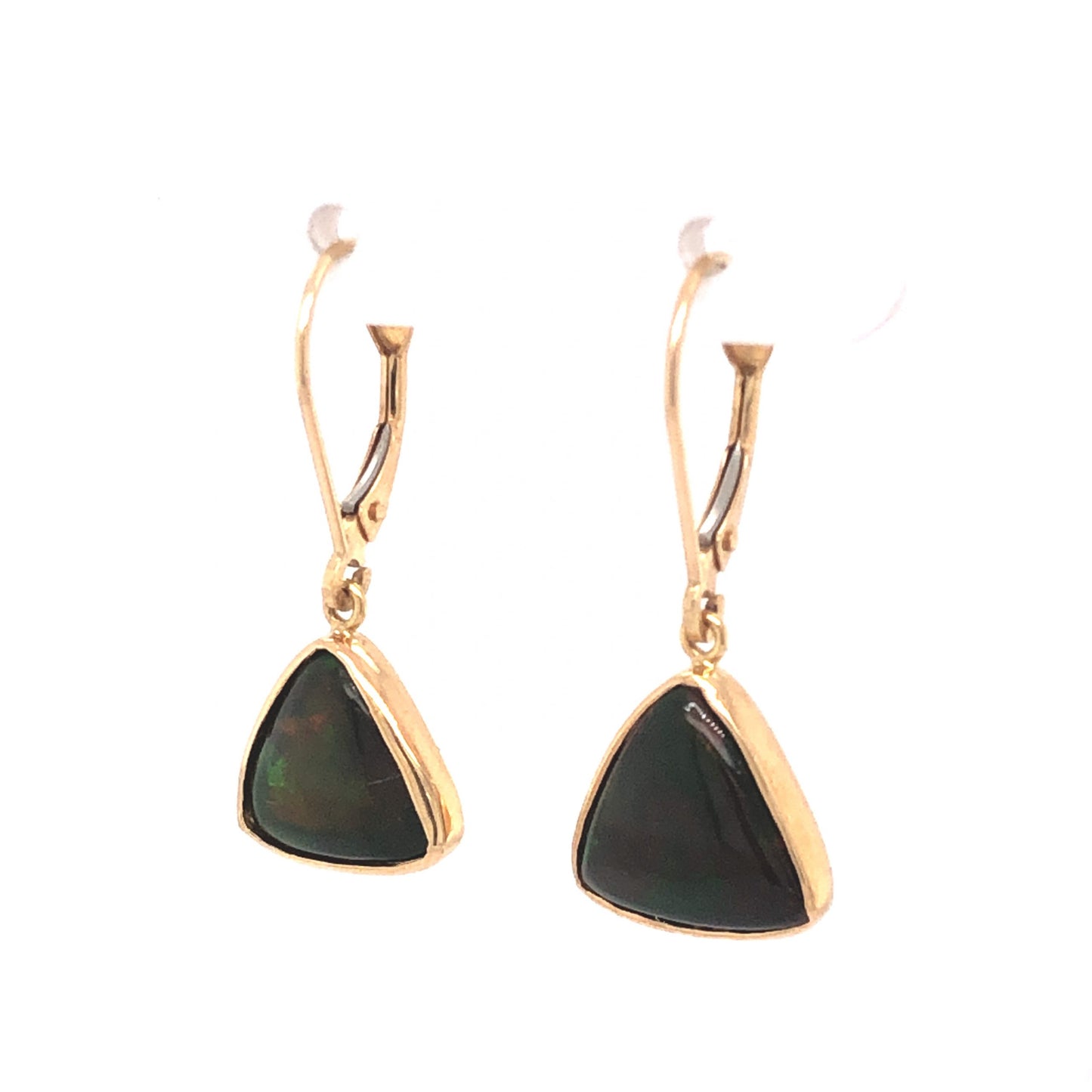 Opal Drop Earrings in 14K Yellow Gold. These dreamy drop earrings feature two triangle cut opals finished in 14 karat yellow gold. The darker shaded opals feature a range of cosmic colors, from burgundy to electric green. The natural stones are bezel set on classic lever backings. These drop earrings are one of a kind and would make a thoughtful gift for any jewelry lover.
