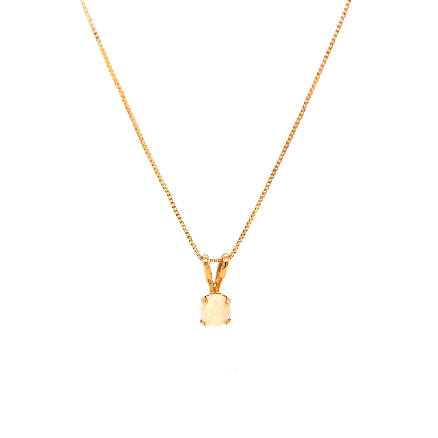 This precious pendant necklace features a .29 carat opal on a 14 karat yellow gold chain. The elegant opal has a soft iridescent ivory hue. The opal pendant features a 14K yellow gold bail on a classic 18 chain necklace. This stylish chain necklace would make a lovely gift for any special occasion!