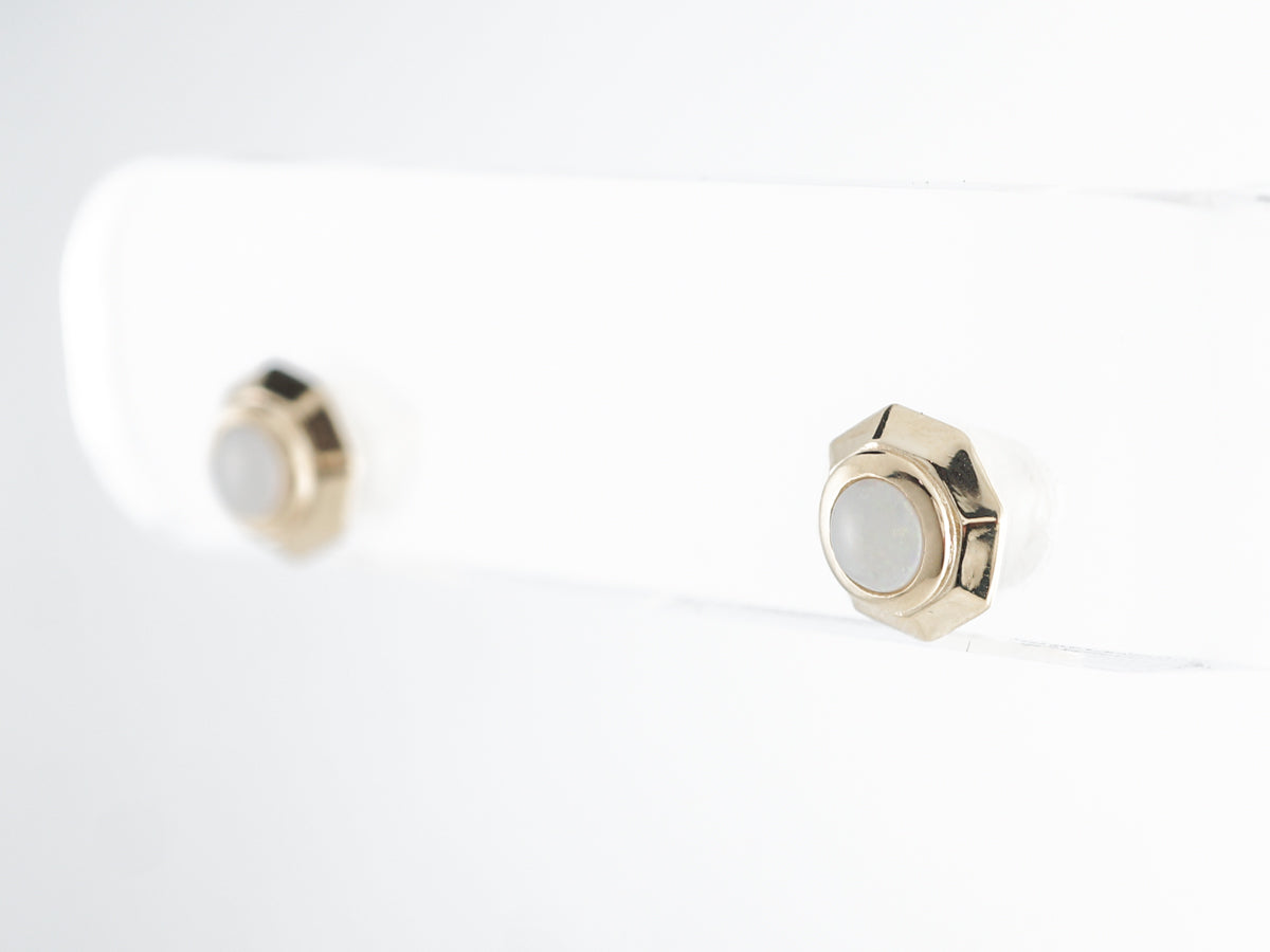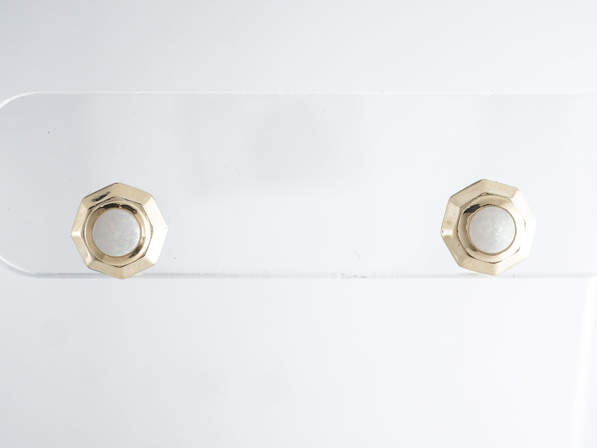 Opal Stud Earrings in 14k Yellow Gold. These lovely little stud earrings feature delicate round .09 carat opals set in 14 karat yellow gold. Perfect for a holiday gift, a pair of studs like these get the most wear and are needed in every jewelry collection.