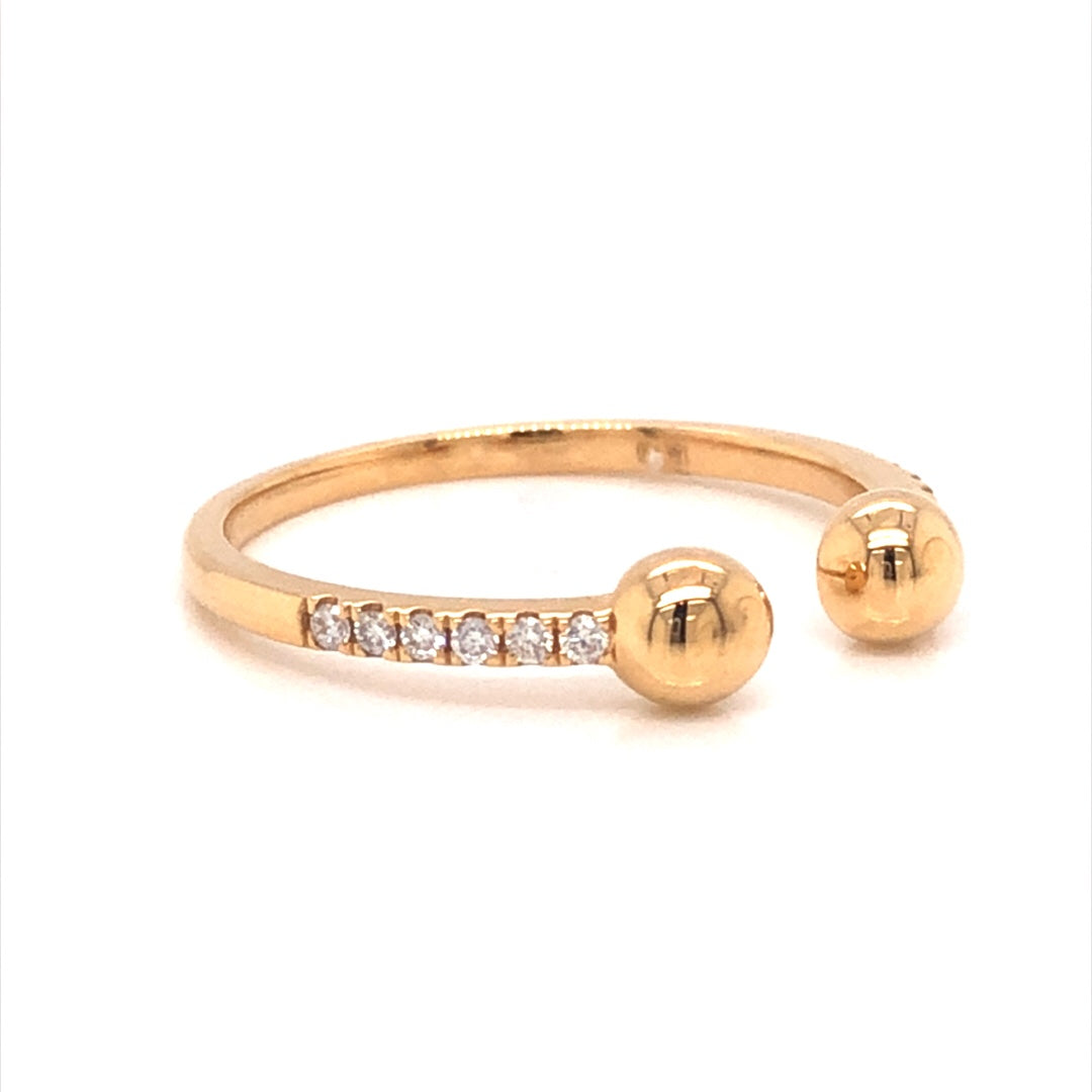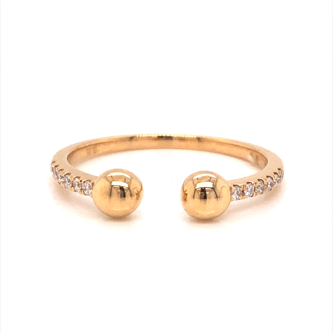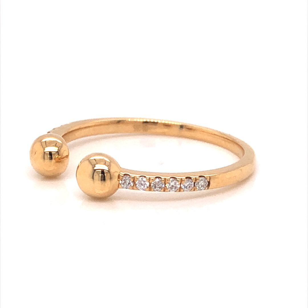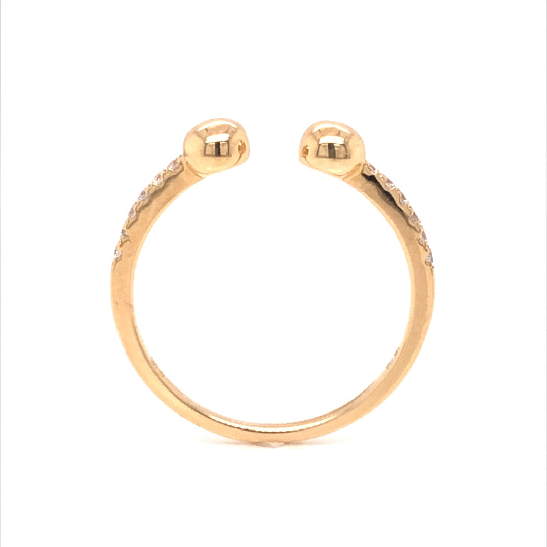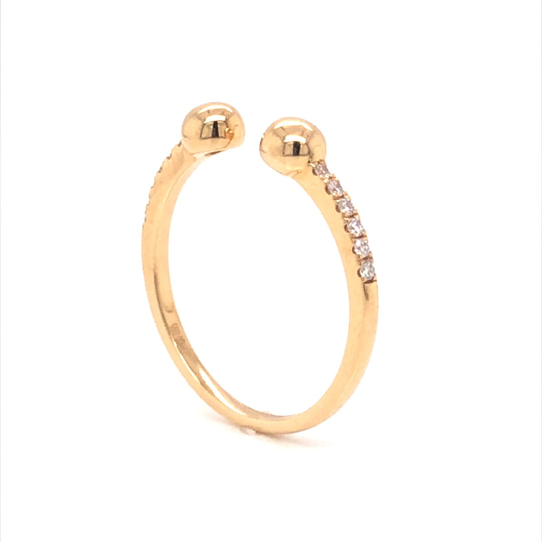 Lovely to stack – this stylish open cuff ring features .10 carats of Round Brilliant cut diamonds finished in 18 karat yellow gold. Twelve (12) sparkling diamonds are set in scallop prongs. The open cuff ring is accent by two rounded spheres. Fashion-forward and sleek. Perfect for lovers of hardware jewelry with a touch of glam.
