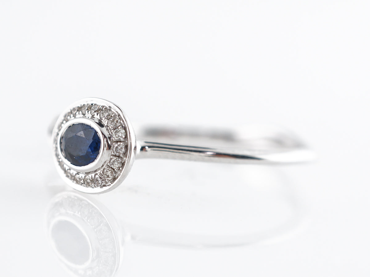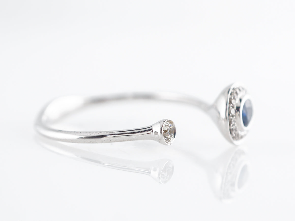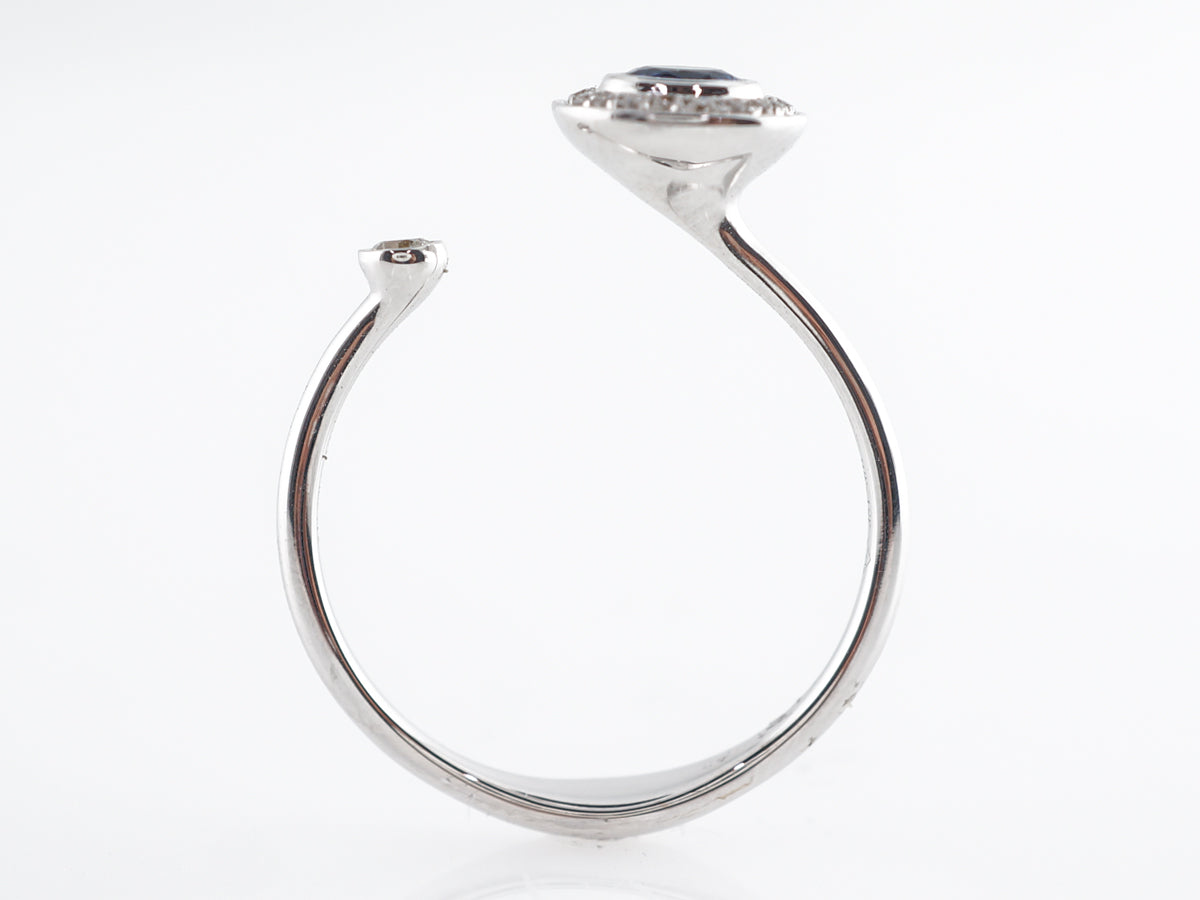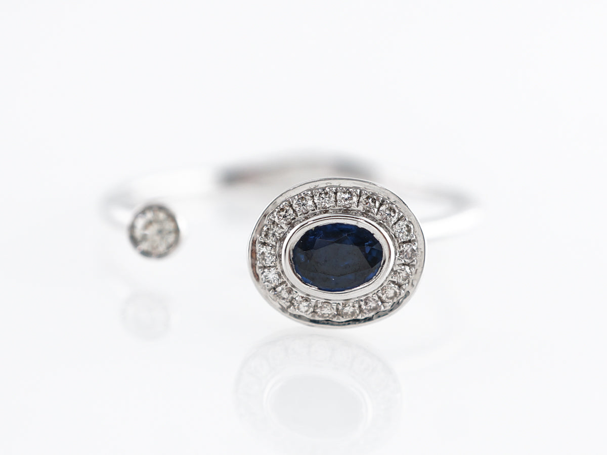 Open Oval Sapphire Diamond Ring in 18k White Gold. This interesting cocktail ring features a .21 carat oval cut sapphire and .09 carats of round brilliant cut diamonds. Set in 18 karat white gold the open shank separates the oval with a diamond halo and a single bezel set diamond on the other side. A very elegant asymmetrical design that would look great by itself or even with a stack of other rings!