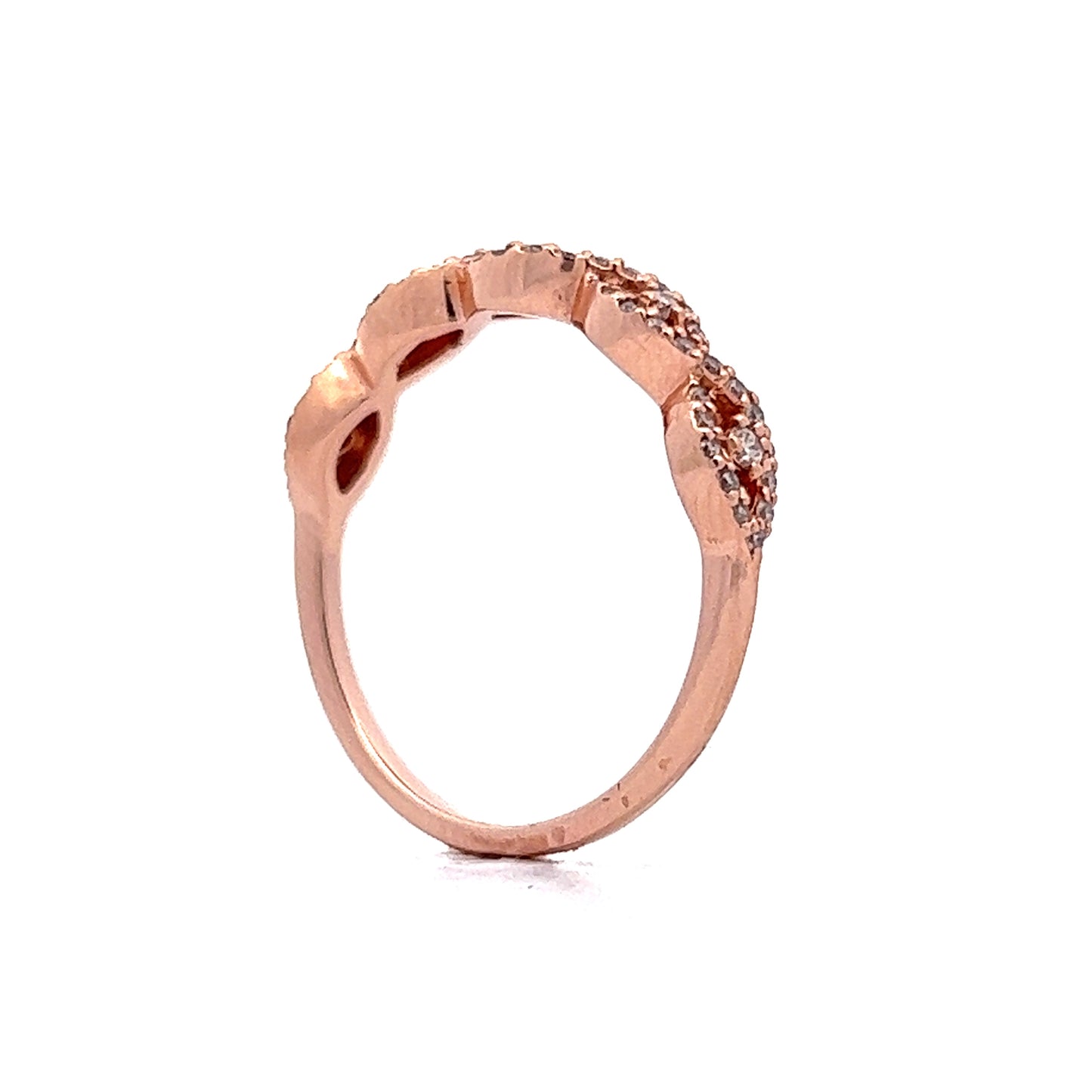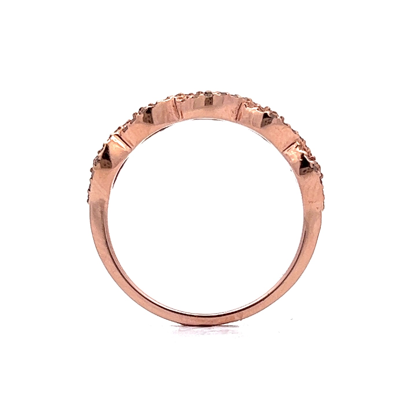 This beautiful ornate wedding band features .34 carats of Round Brilliant cut diamonds set in 14 karat rose gold. The sparkling band weaves in and out, creating little open spaces that are filled with even more diamonds. This would be a perfect addition to give a solitaire engagement ring a little extra sparkle, or could be worn on the right hand as a stacking ring. Romantic and chic.