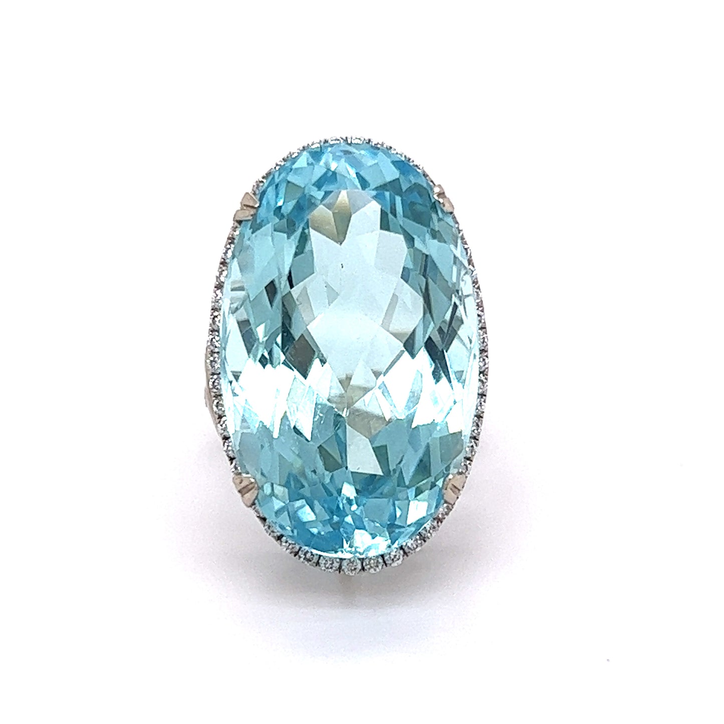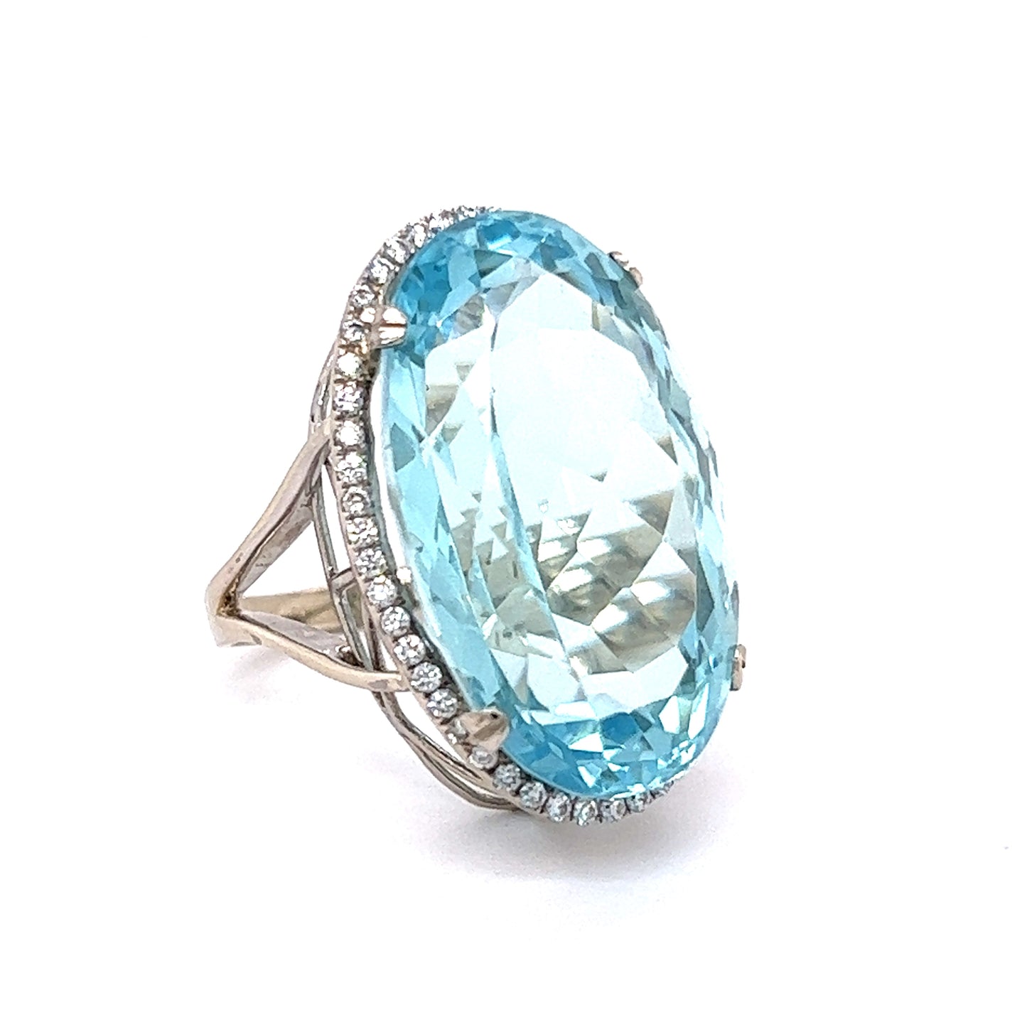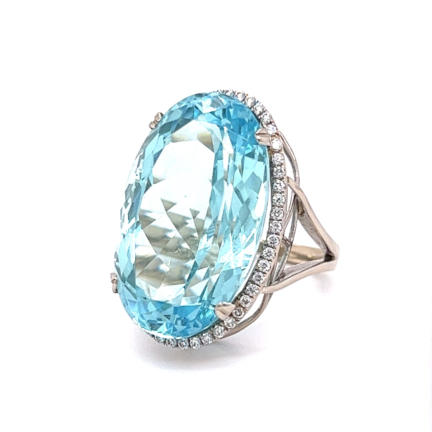 Oval Aquamarine Diamond Cocktail Ring 14k White Gold.  This breathtaking cocktail ring features a 30.76 carat oval cut aquamarine and .75 carats of accent diamonds in 14K white gold. The center stone features a soft, ocean blue hue and is haloed by fifty (50) near colorless diamonds. From the profile, an openwork basket holds the collection of stones, finished on a split shank 14K white gold band.