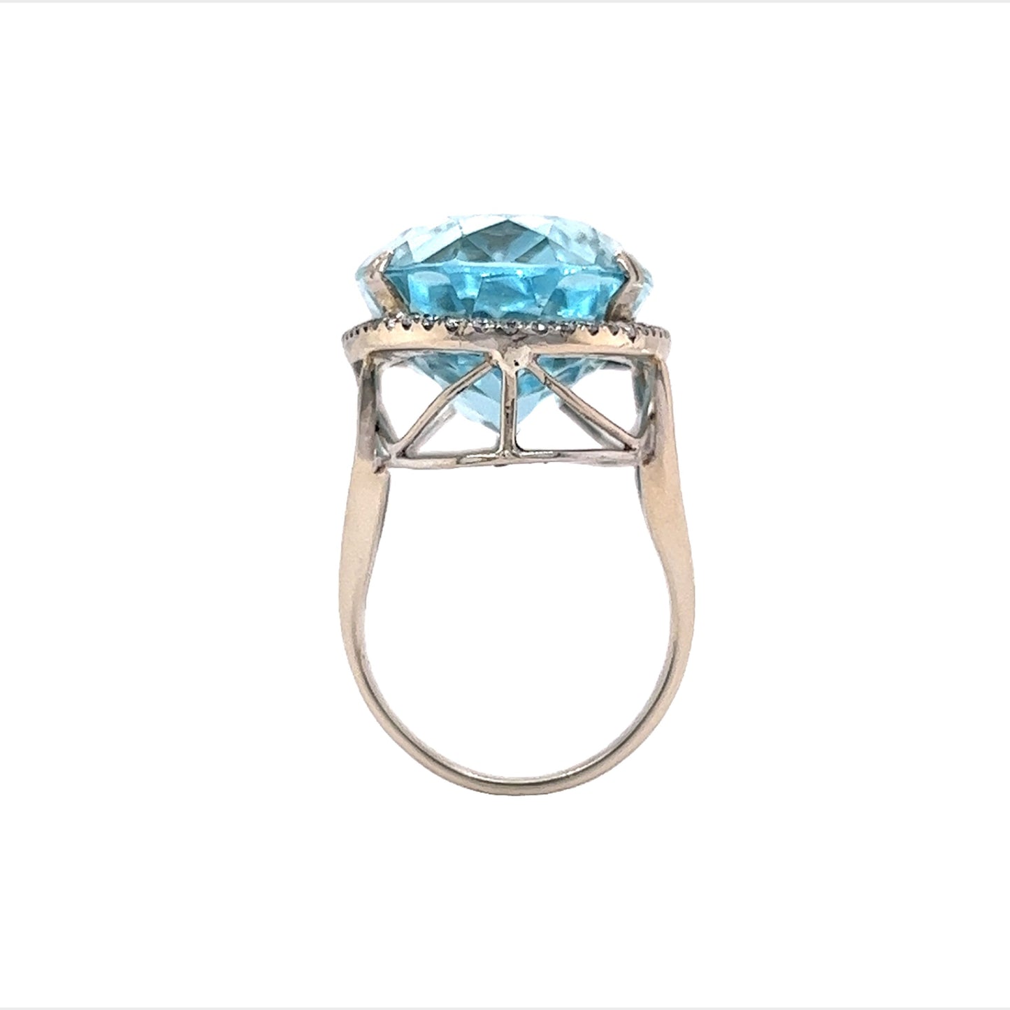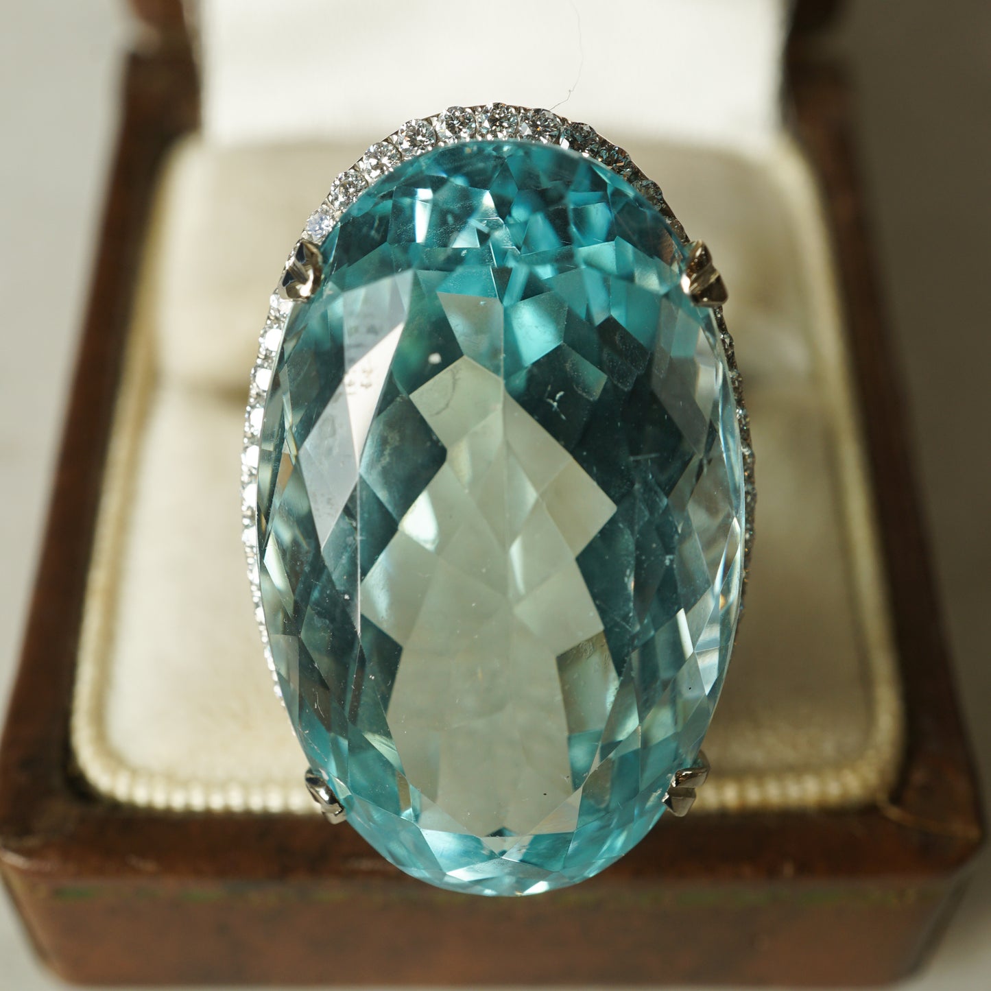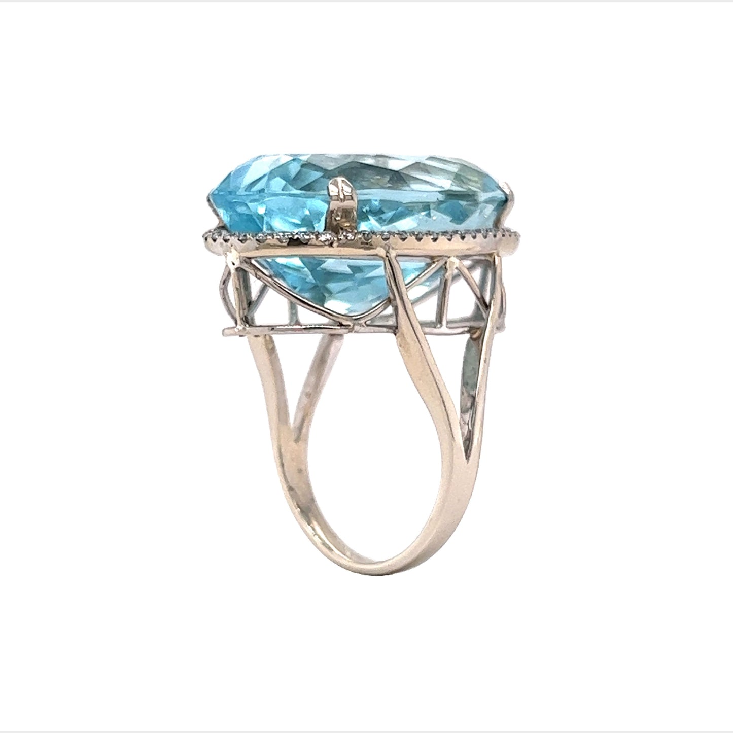 Oval Aquamarine Diamond Cocktail Ring 14k White Gold.  This breathtaking cocktail ring features a 30.76 carat oval cut aquamarine and .75 carats of accent diamonds in 14K white gold. The center stone features a soft, ocean blue hue and is haloed by fifty (50) near colorless diamonds. From the profile, an openwork basket holds the collection of stones, finished on a split shank 14K white gold band.