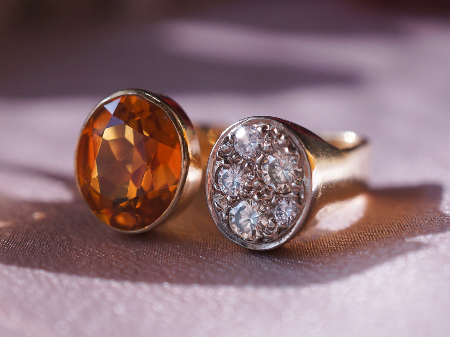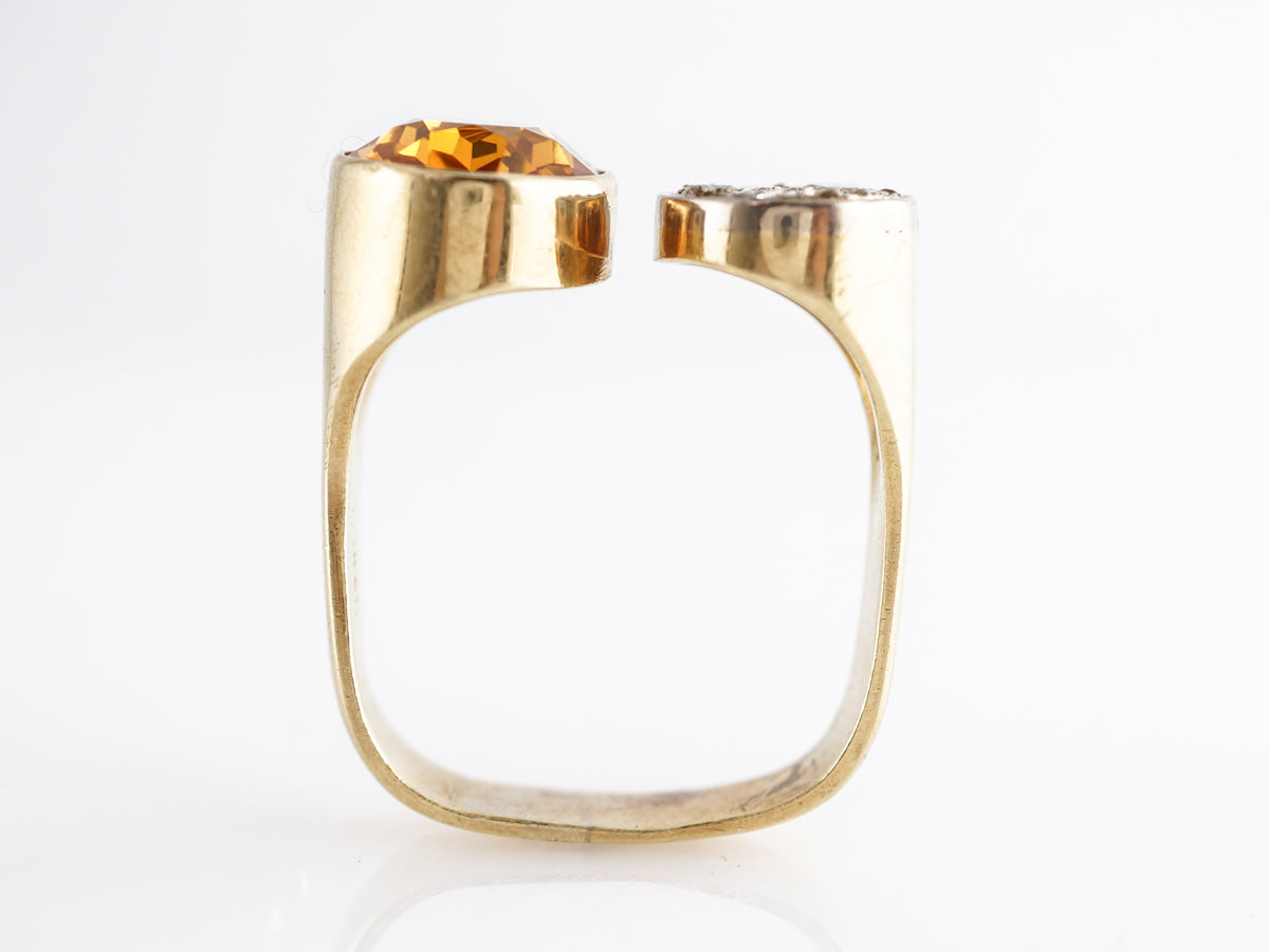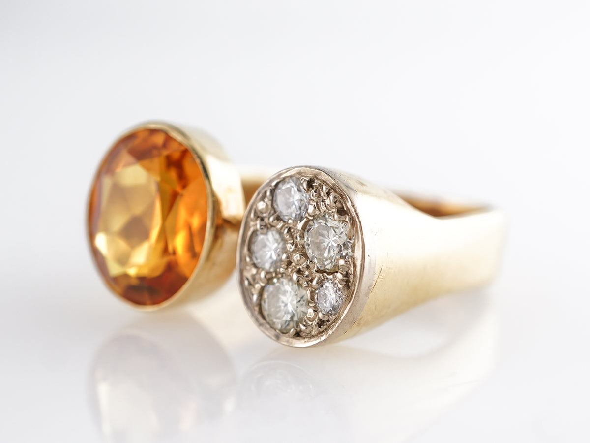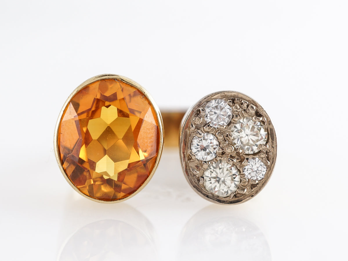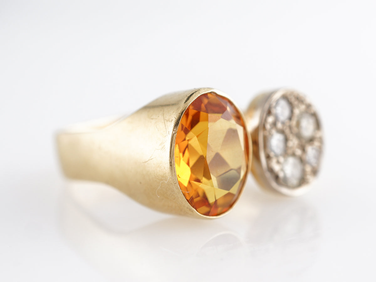 Oval Citrine w/ Pave Diamond Ring in 18k Yellow Gold. This modern statement ring is truly unique with its .62 carats of round brilliant cut diamonds and 3.43 carat oval cut citrine set in 18 karat yellow gold. The ring is composed of a thick gold band that transforms into thick bezels around two mountings holding each type of stone. The diamonds are bead set in a cluster and the citrine is bezel set, though both sections of gemstones wrap over the top of the finger while leaving an open space in the center.