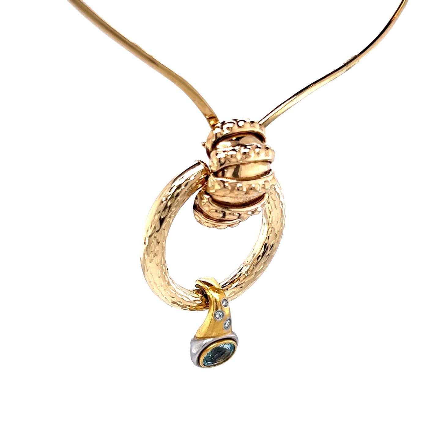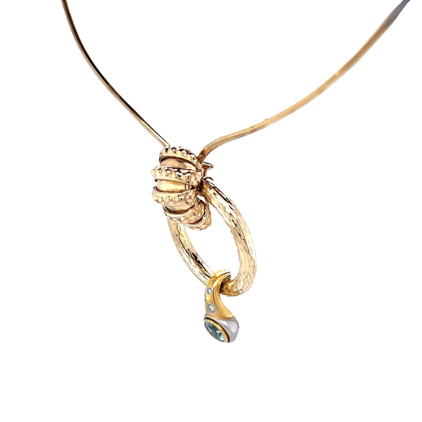 This Stephanie Lake designed necklace features a striking combination of texture and geometry. The pendant is a series of three distinct, yellow gold pieces with contrasting shapes finishes. The bottom of the pendant features a mixed metal drop dotted with diamonds and a single blue aquamarine. This collar style necklace sits gracefully on the clavicle. Made with 14k yellow gold and platinum.