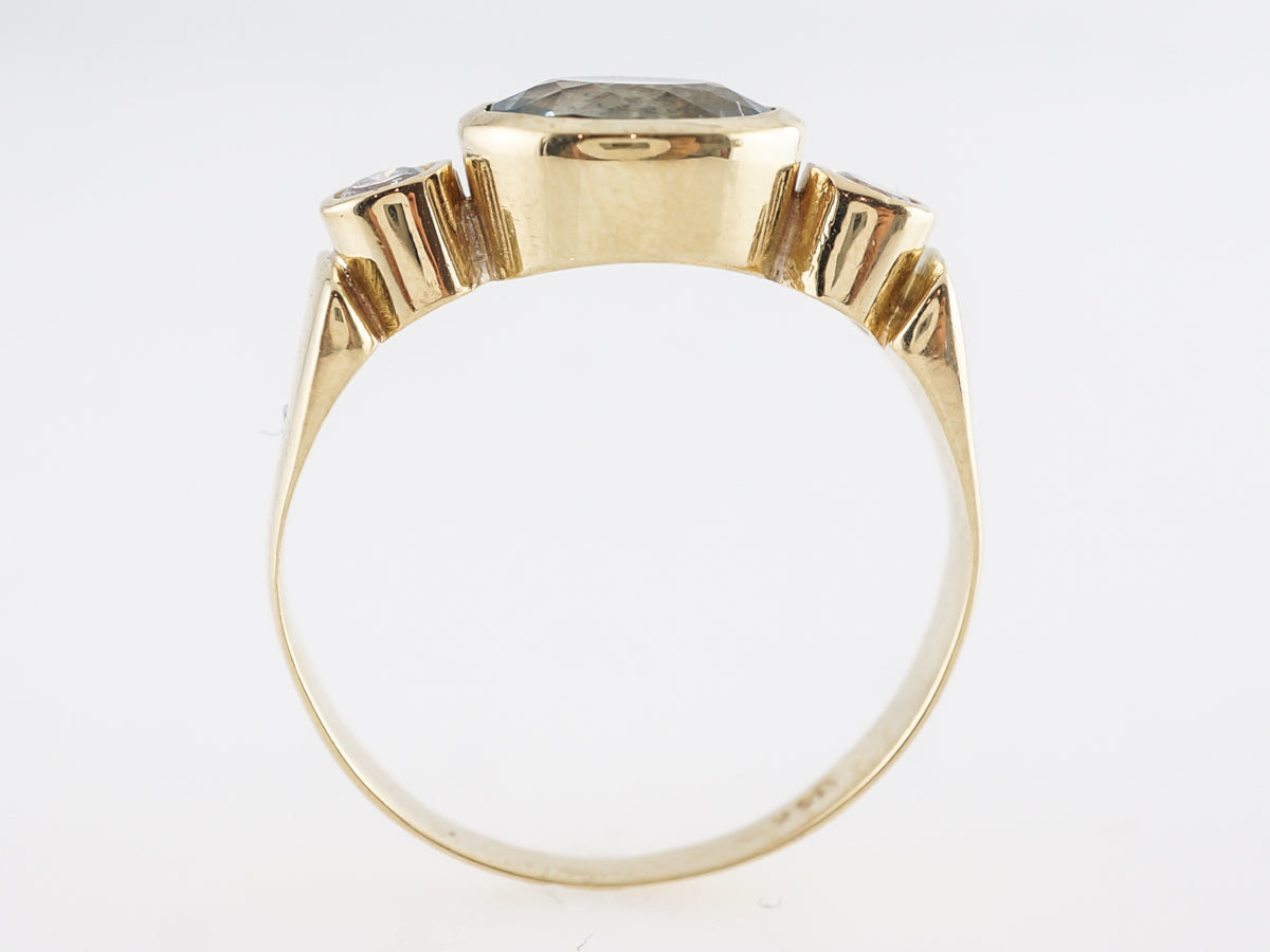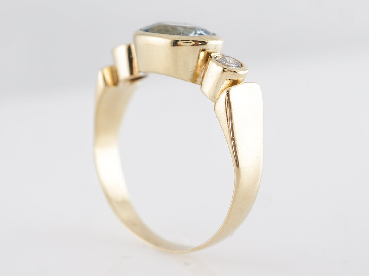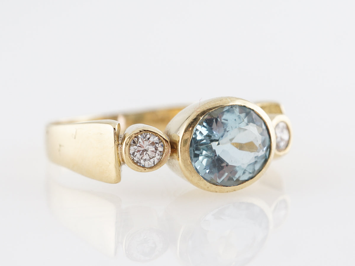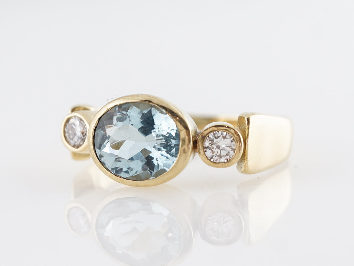 Oval Cut Aquamarine Diamond Ring in 18k Yellow Gold. This lovely ring features a 1.16 carat oval cut aquamarine accented with two (2) round brilliant cut diamonds. The ring is finished in 18 karat yellow gold and the shank tapers wider up the shoulders. With chunky Retro design elements, this modern right hand ring is full of great color and clean contrast.