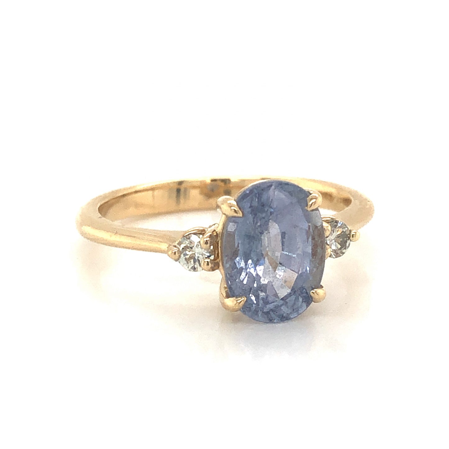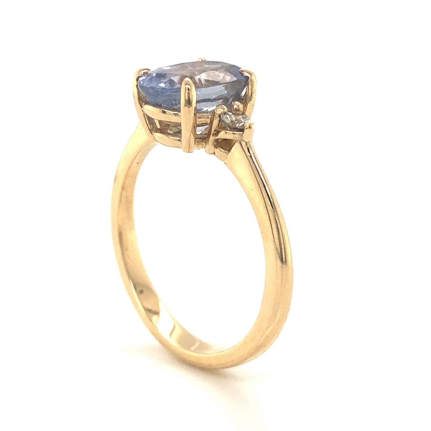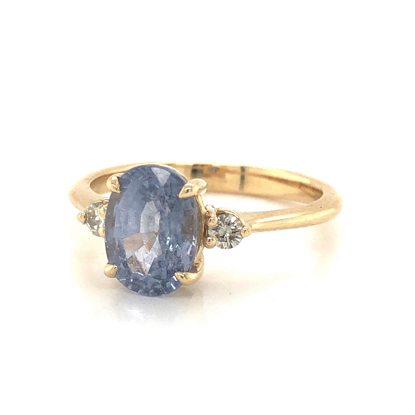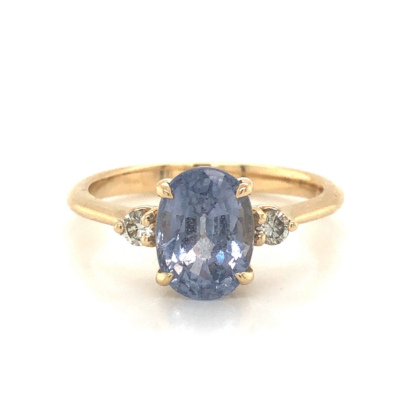 This unique and elegant By Filigree engagement ring features a 2.79 carat oval cut lavender sapphire and diamond accents in 14 karat yellow gold. The center stone has a beautiful lavender-periwinkle hue. The sapphire is set in four prongs and accented by two (2) .03 carat round diamonds. From the profile, a classic basket mounting holds the collection of gemstones finished on a 14 karat yellow gold band.