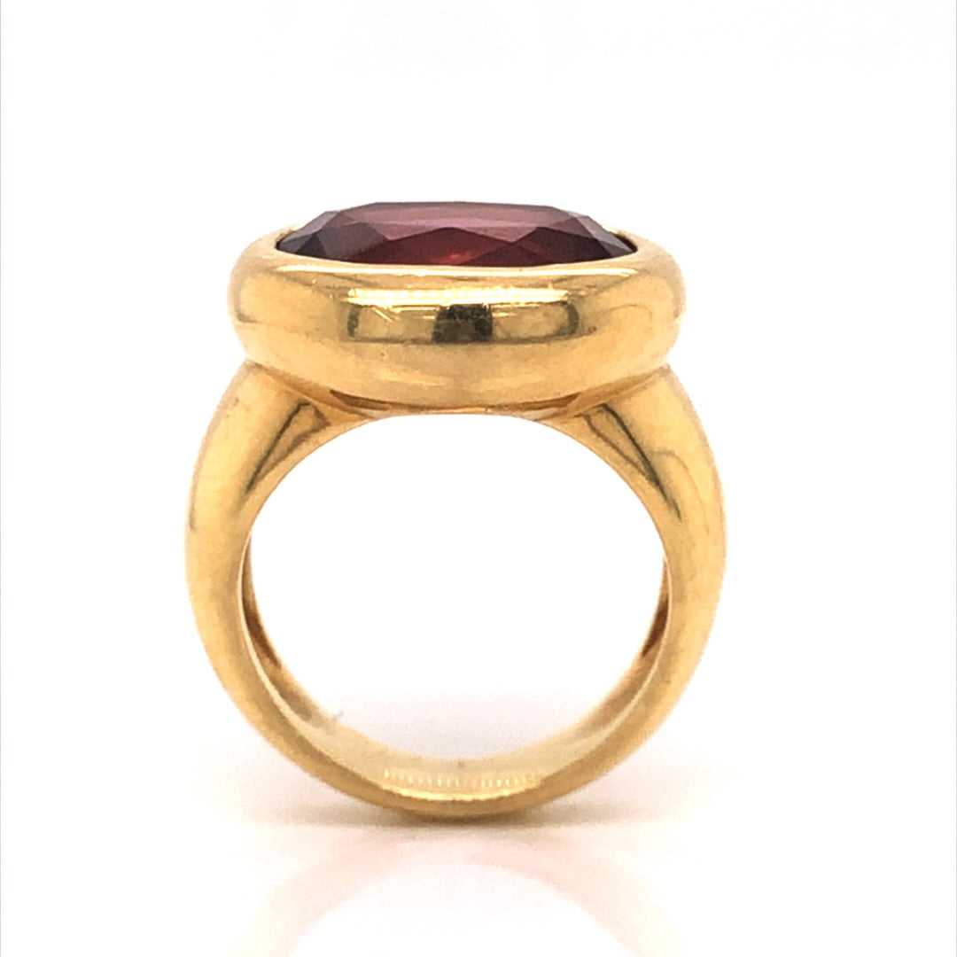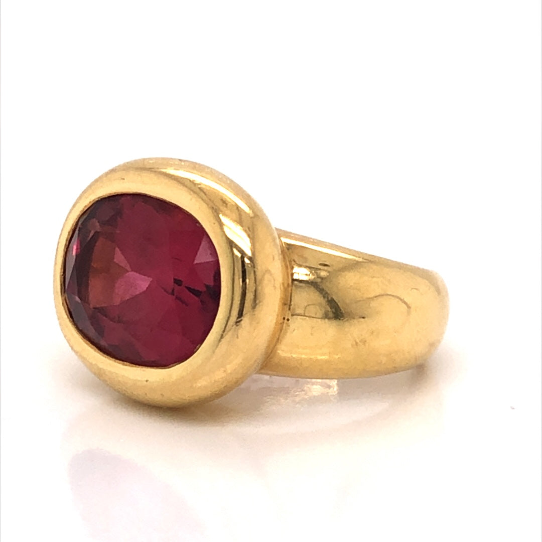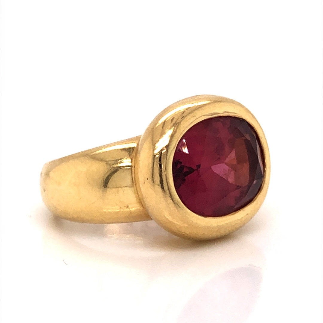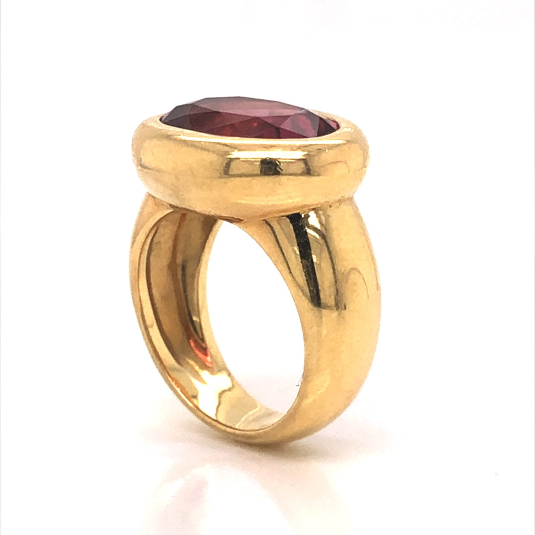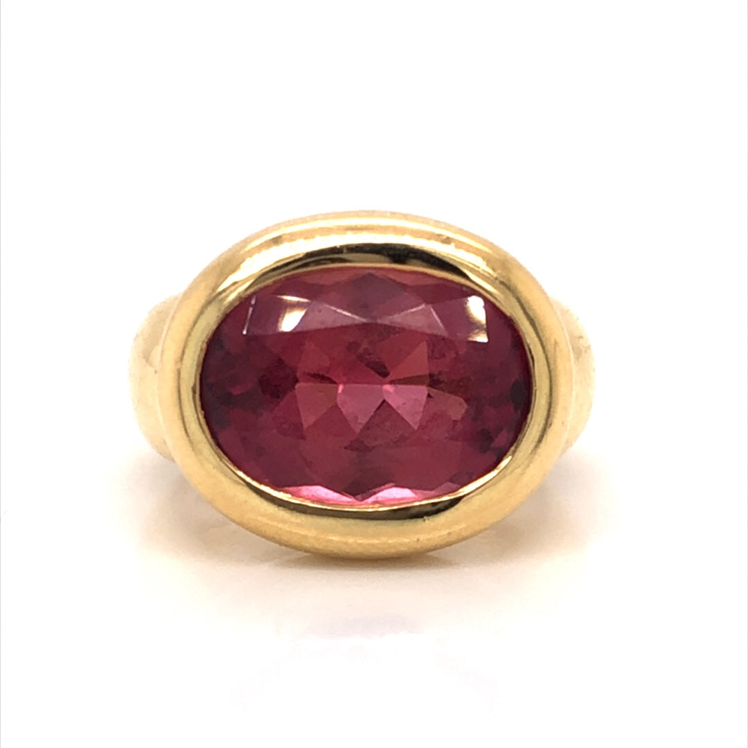 This eye-catching statement ring features an impressive 10.91 carat oval cut pink tourmaline in 18 karat yellow gold. Timeless and beautiful in style. The pink tourmaline has a rosy hue and is set in a secure bezel. Finished on a high polished and thick 18k yellow gold band, this modern cocktail ring is the definition of elegance!
