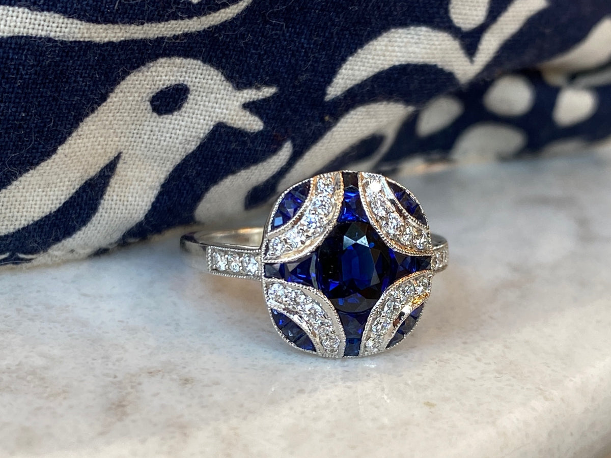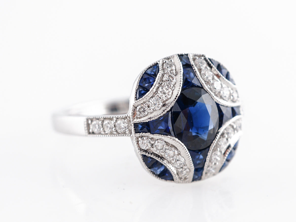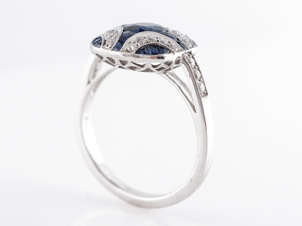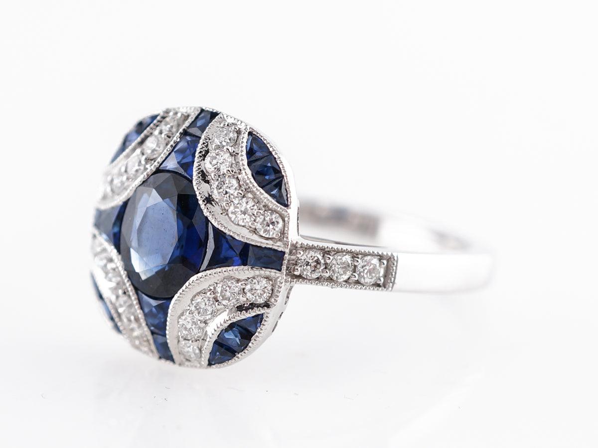 Oval Cut Sapphire Cocktail Ring w/ Diamonds in Platinum. This modern cocktail ring features a .82 oval cut sapphire at its center. The center sapphire is accented by stunning diamonds and additional sapphires, creating a stunning geometric pattern. This striking ring has a visual impact from afar and incredible intricacies up close. A true one of a kind!