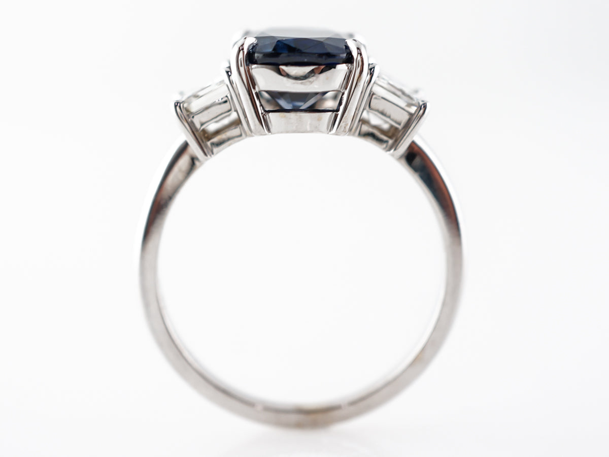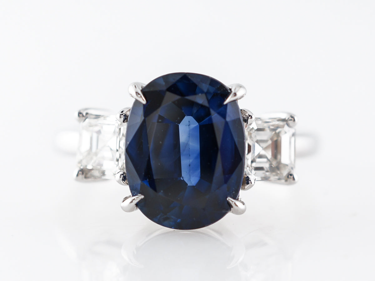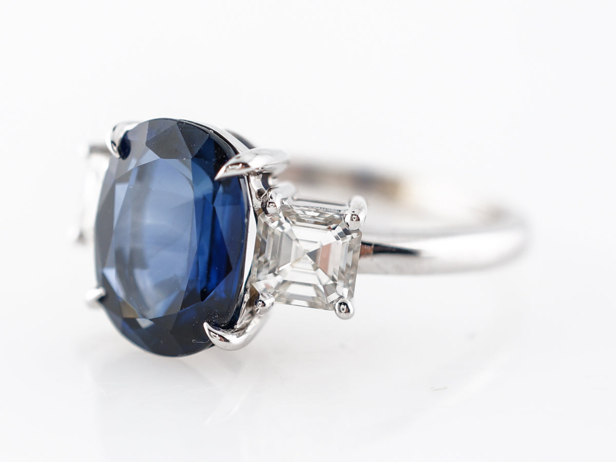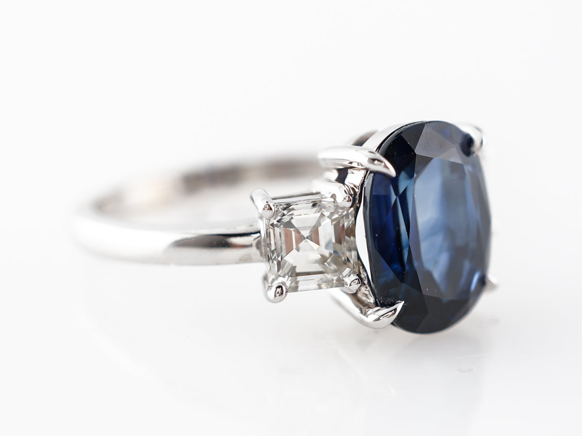 Oval Cut Sapphire w/ Diamonds Engagement Ring in 18k. This dazzling engagement ring features a 2.71 carat oval cut sapphire flanked by two gorgeous asscher cut accent diamonds and finished in 18 karat white gold. The dark blue sapphire is claw set which creates a nice icy contrast of colors above the brilliant asscher cut diamonds. The shank is simple, keeping all of the attention on the amazing center stones.